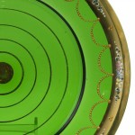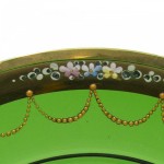 Set of 8 green crystal dinner plates with floral enamel border and gold trim.