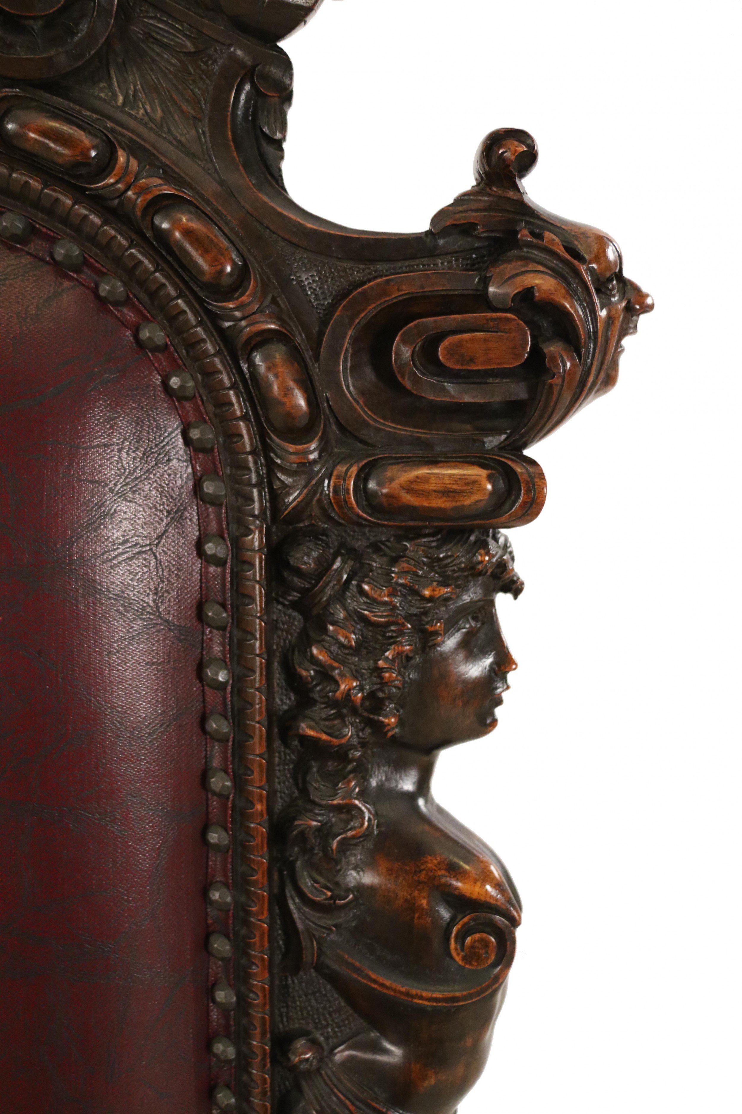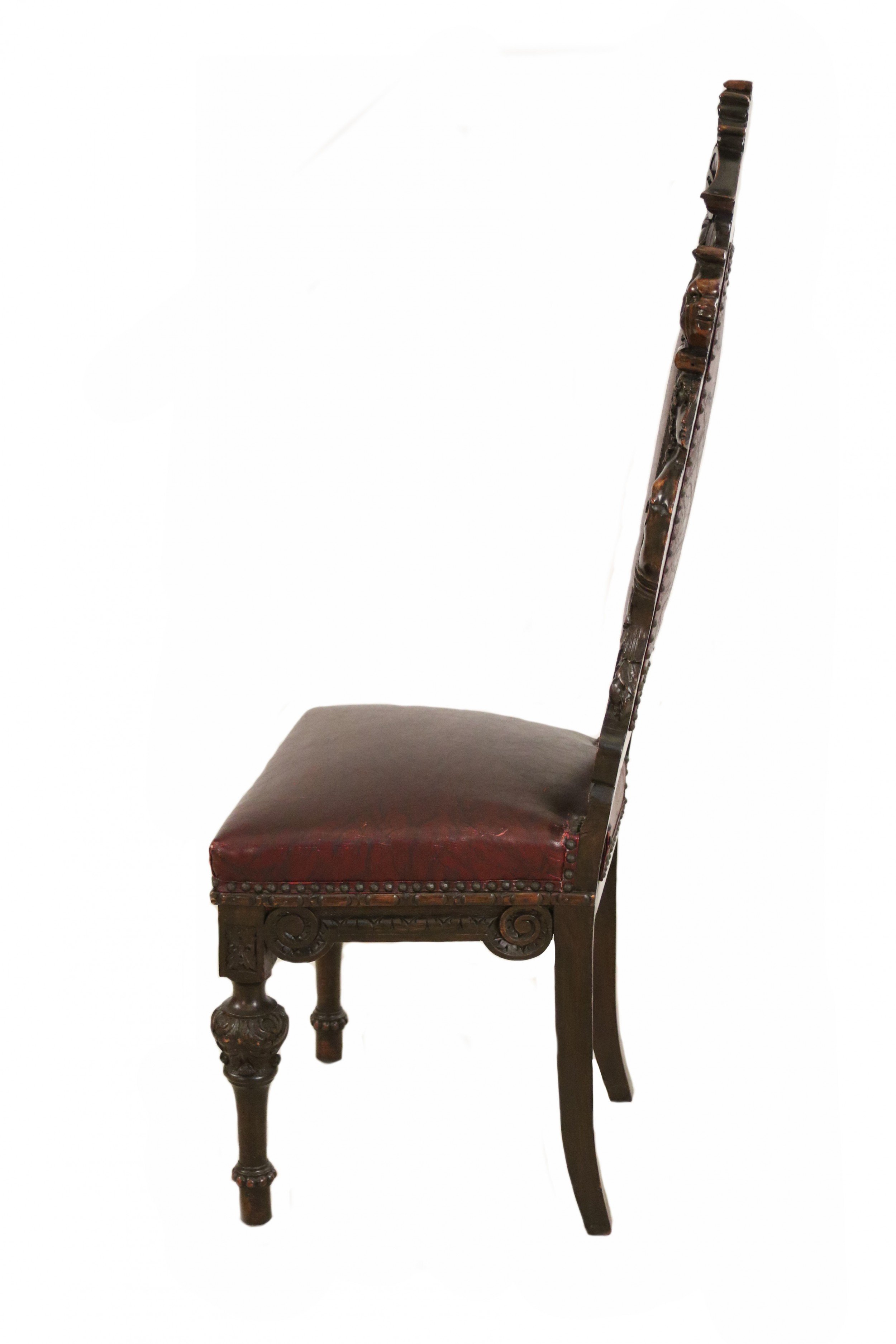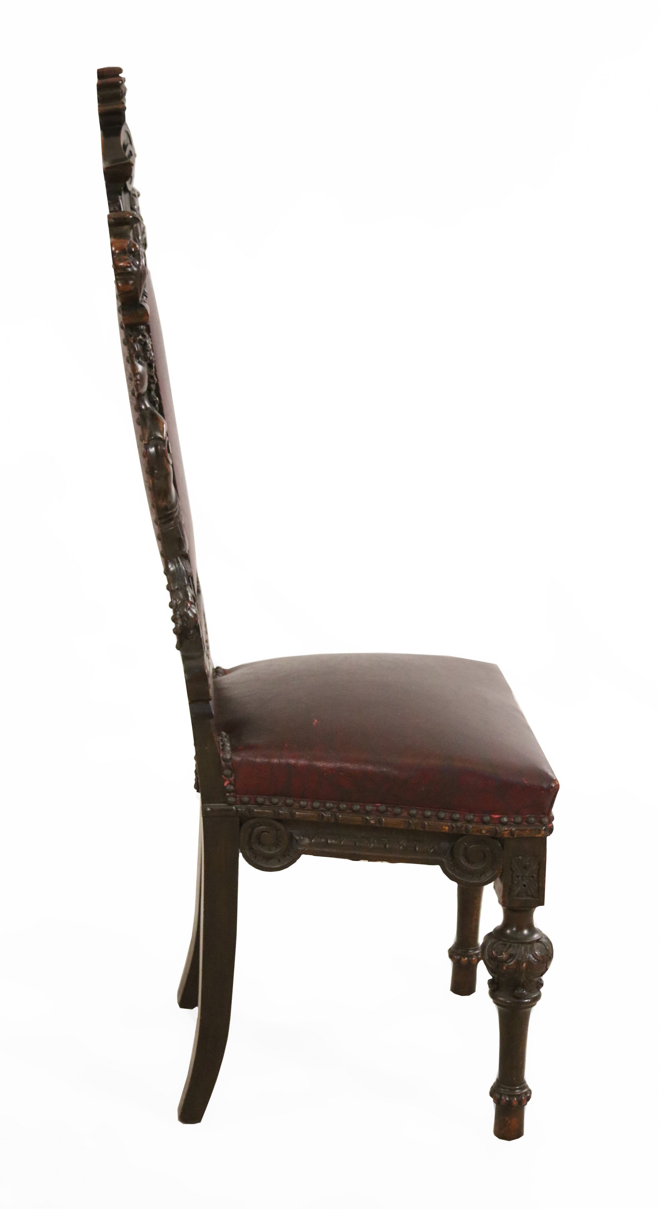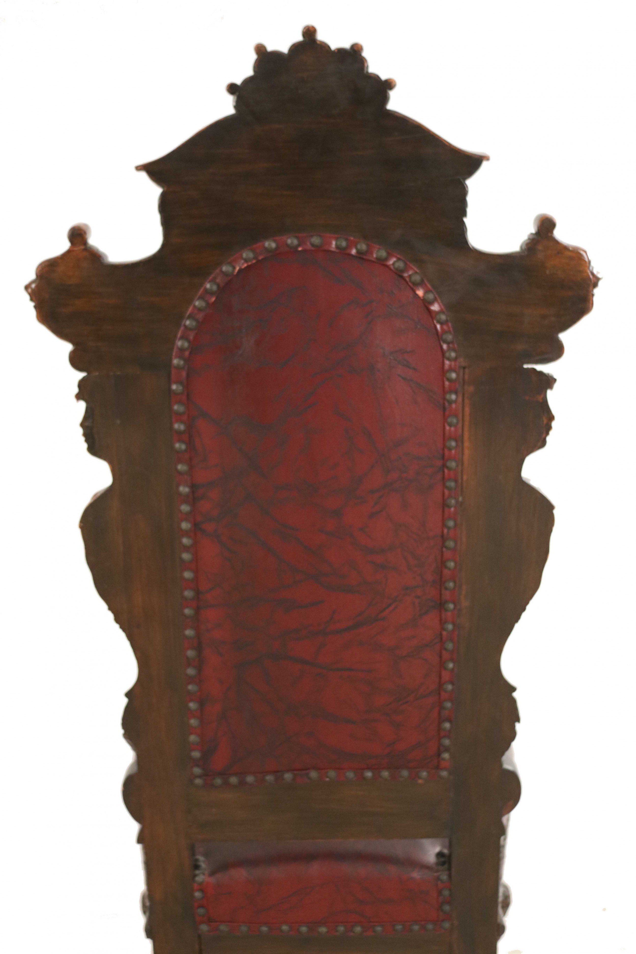 SET of 10 Italian Renaissance style (19th Cent) stained walnut high back side chairs with carved heads and dark red leather upholstered seat and back (PRICED AS SET)