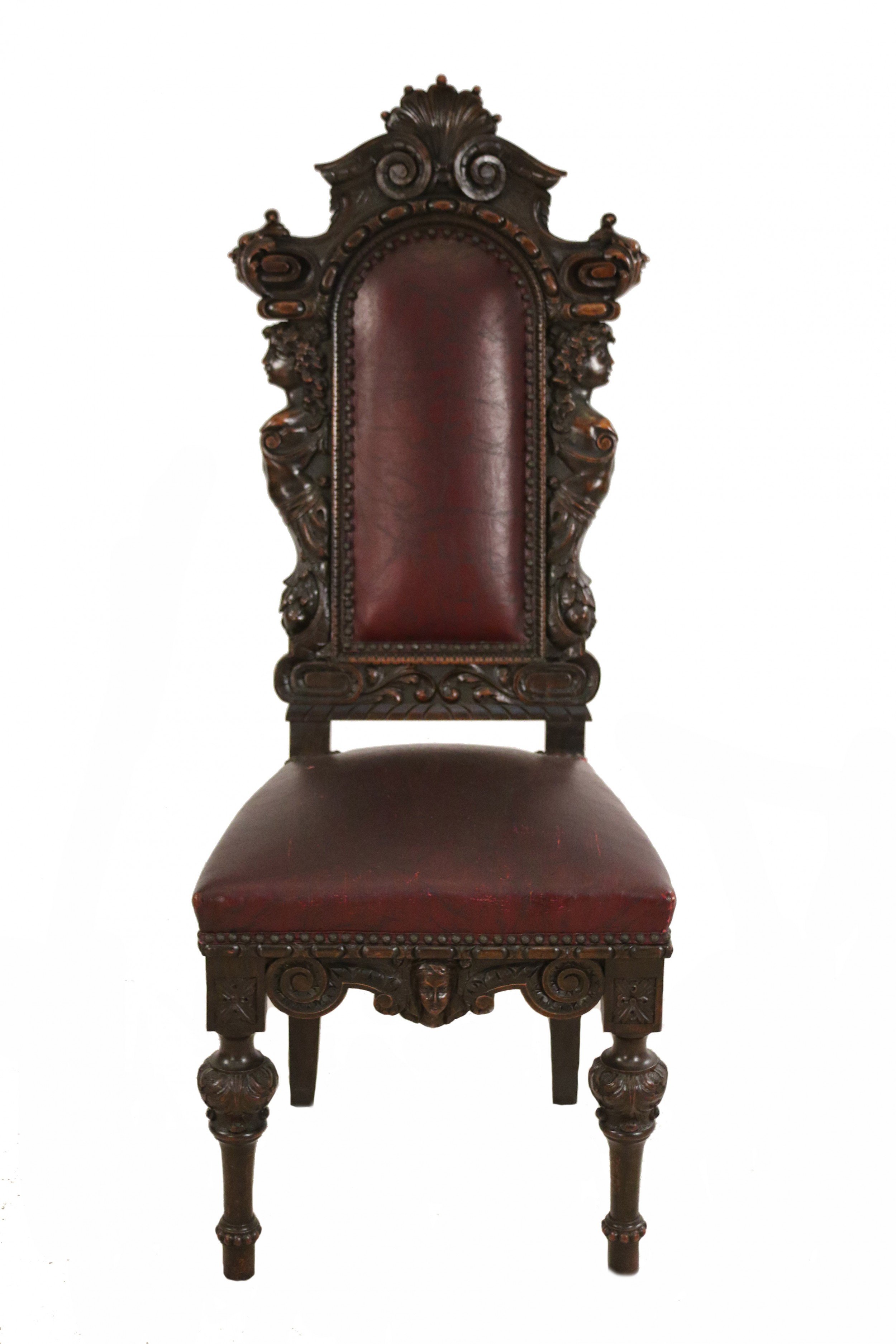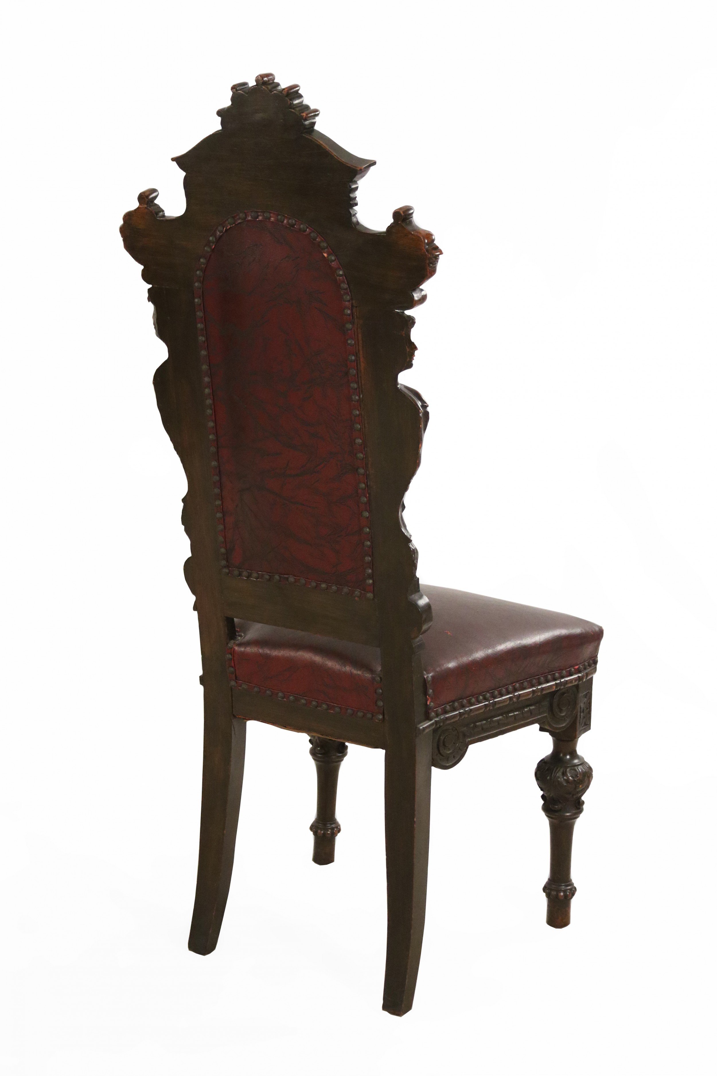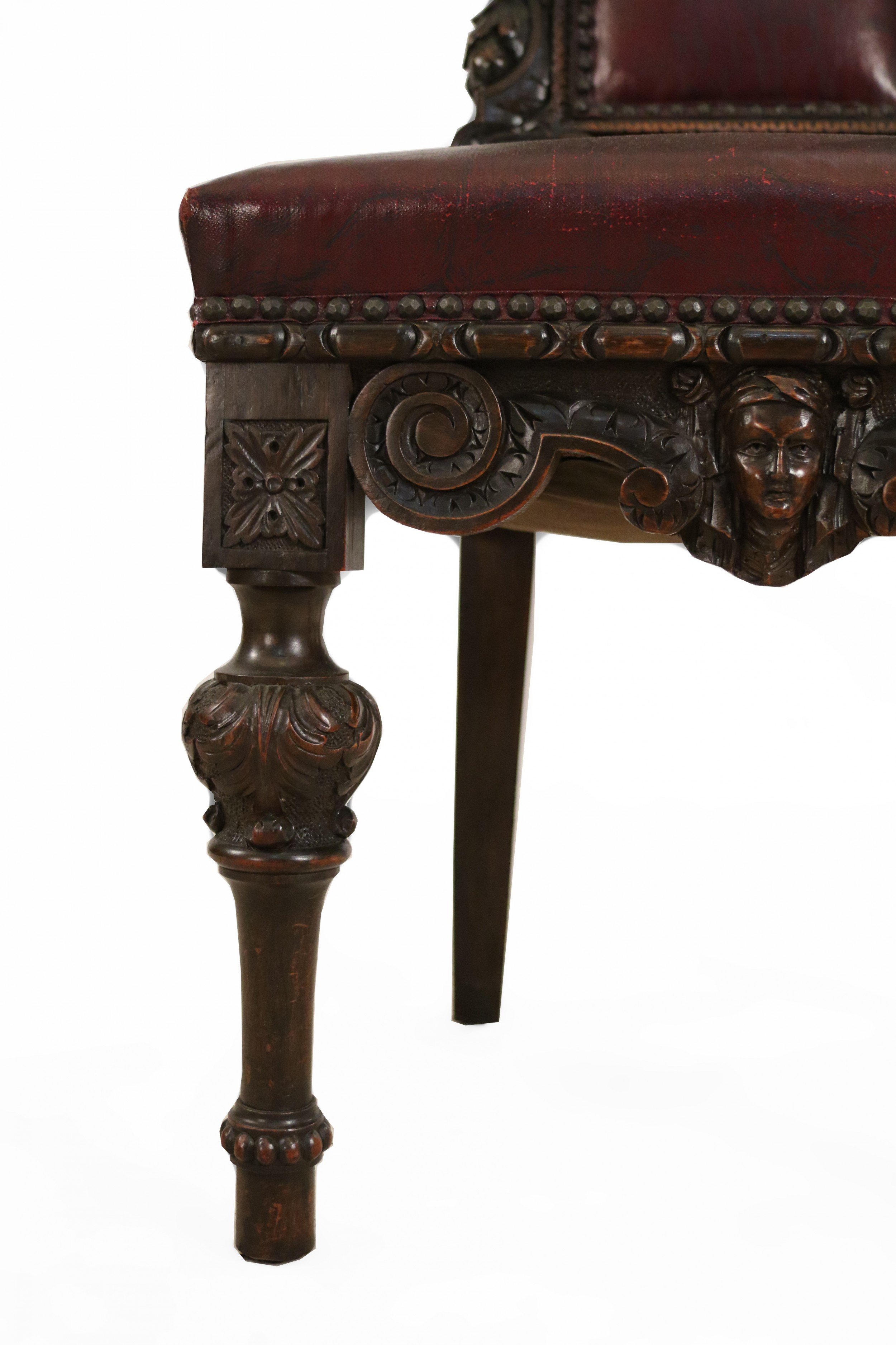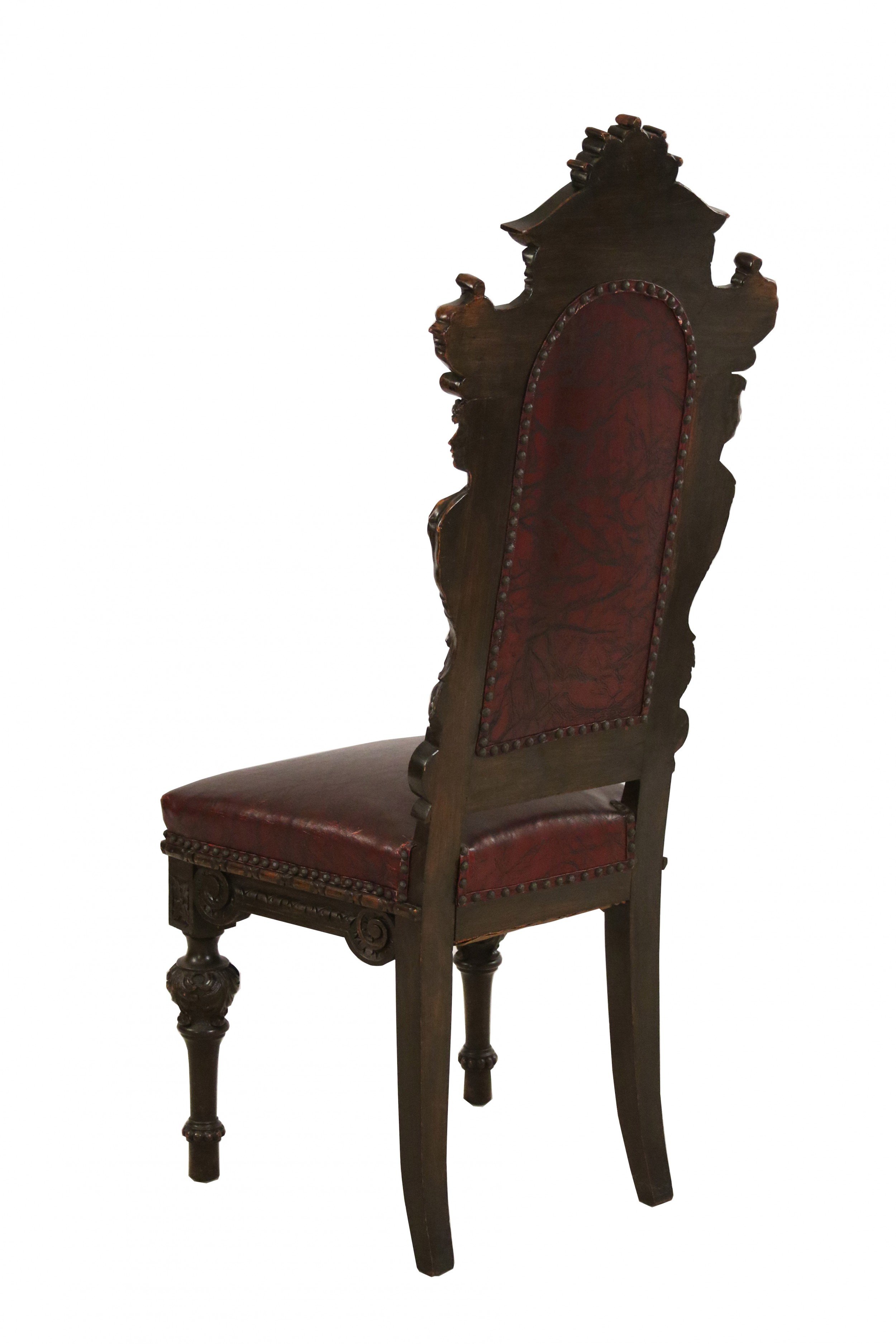 SET of 10 Italian Renaissance style (19th Cent) stained walnut high back side chairs with carved heads and dark red leather upholstered seat and back (PRICED AS SET)