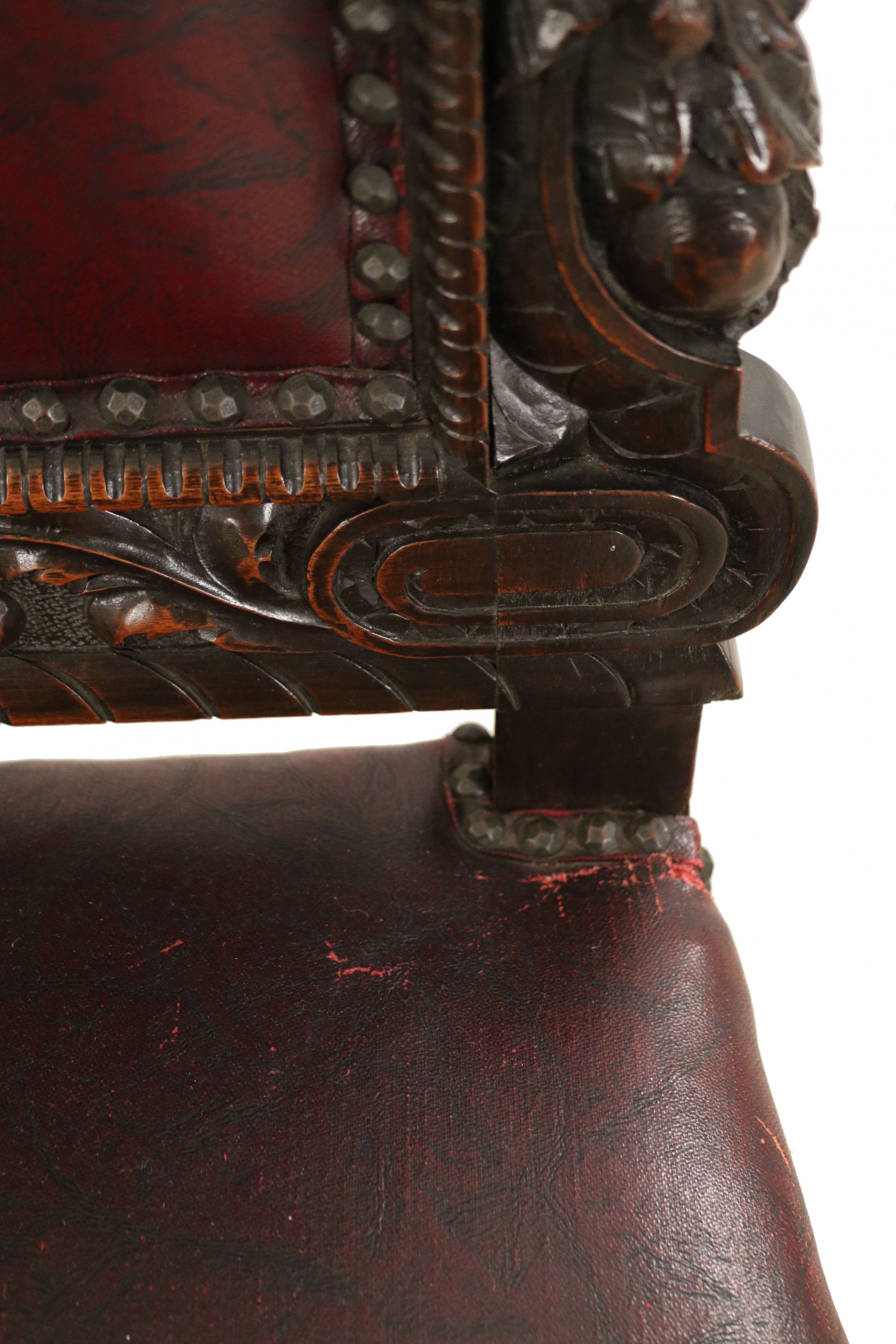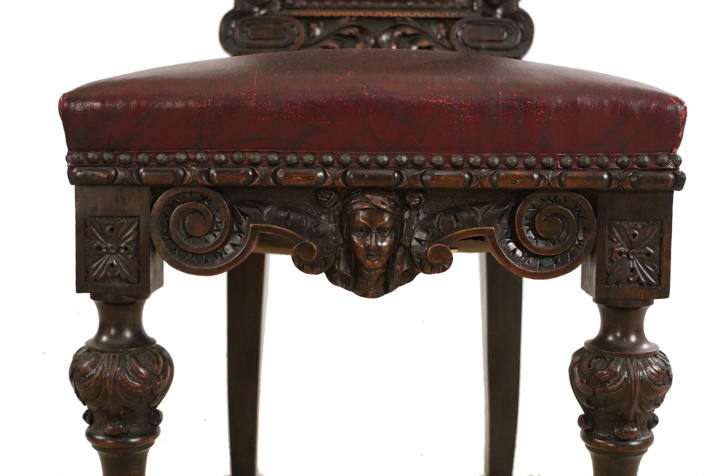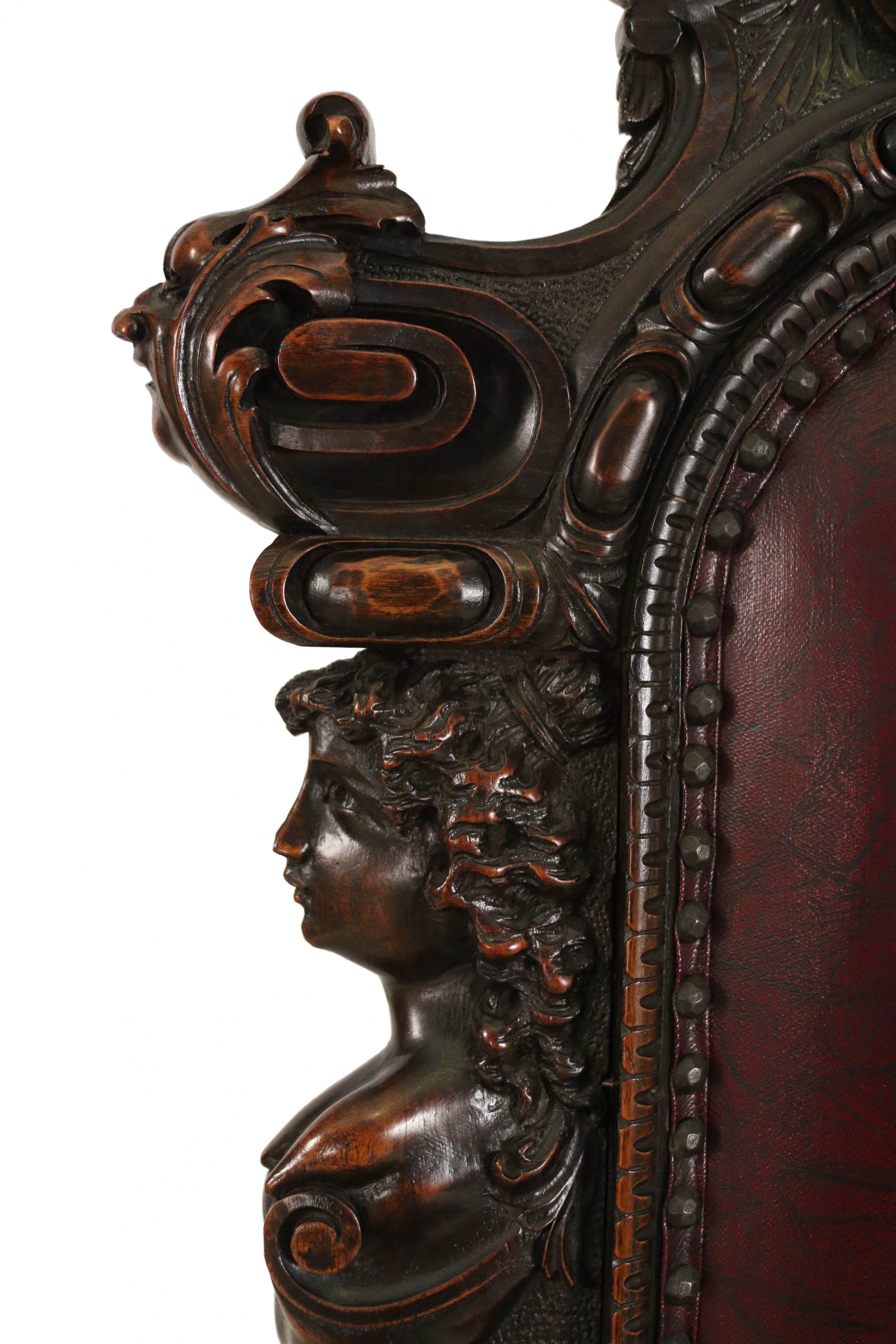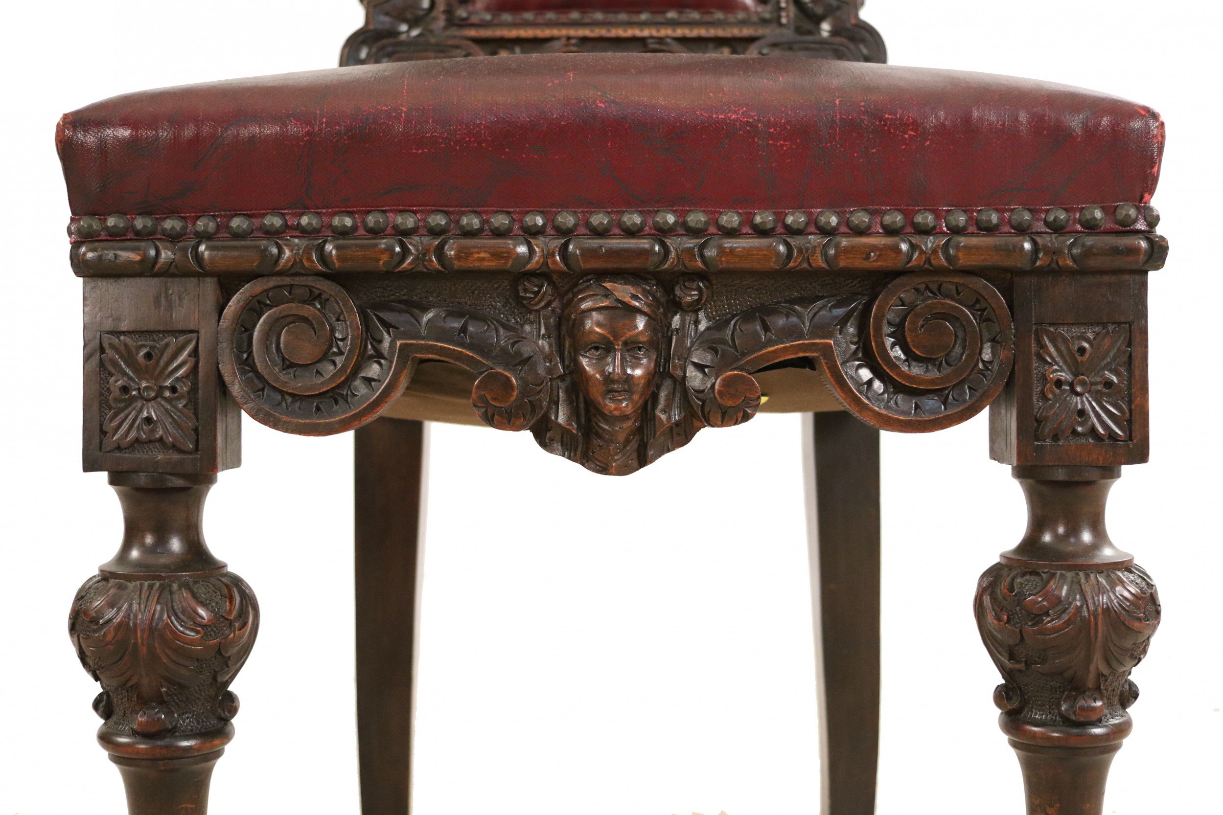 SET of 10 Italian Renaissance style (19th Cent) stained walnut high back side chairs with carved heads and dark red leather upholstered seat and back (PRICED AS SET)