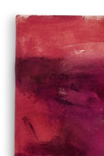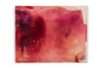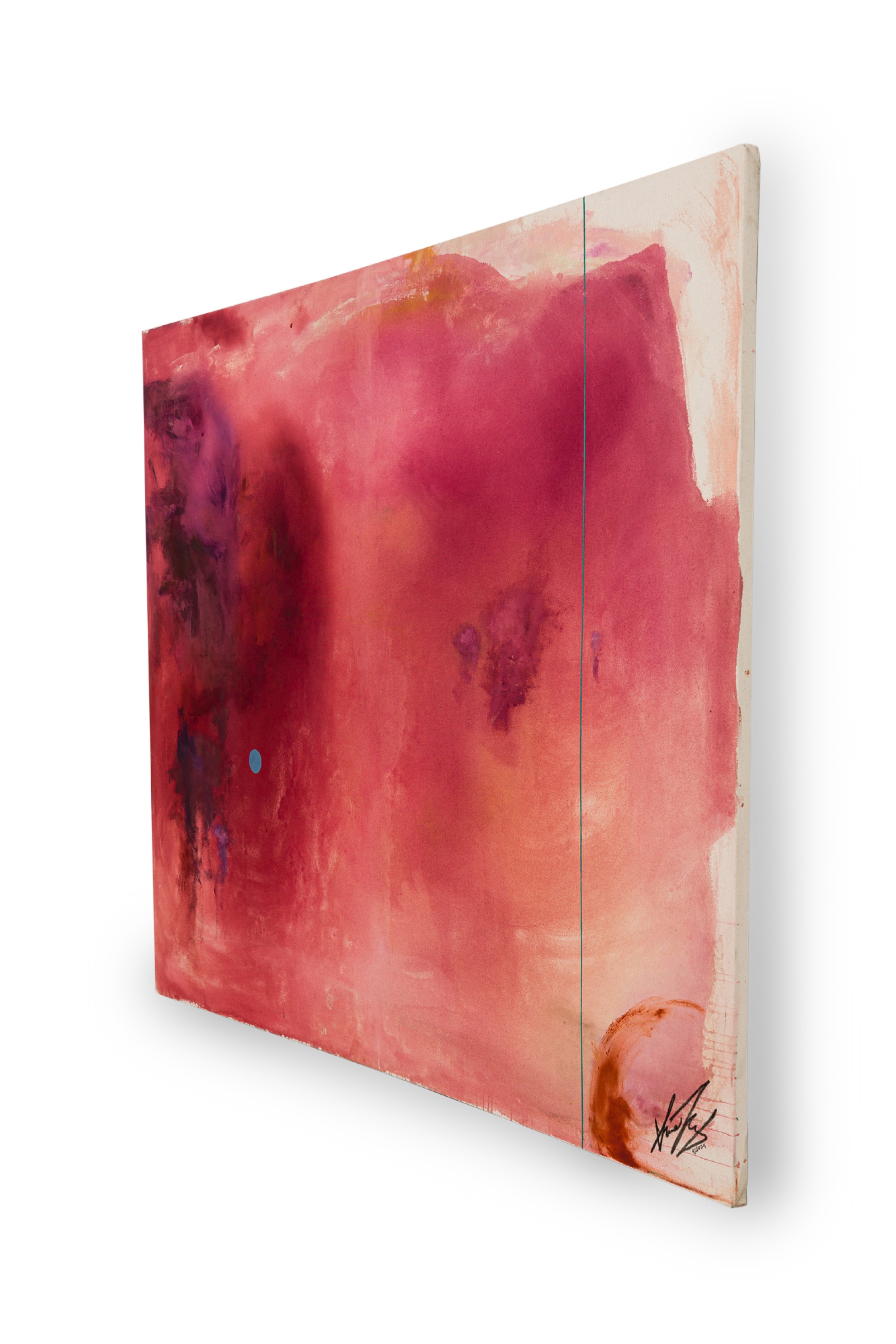 American contemporary abstract expressionist composition in a color field of reddish pinks with a sky blue circle in the left side of the canvas and vertical blue stripe on the right side (Signed: Lower Right) (SHARONE HALEVY)
