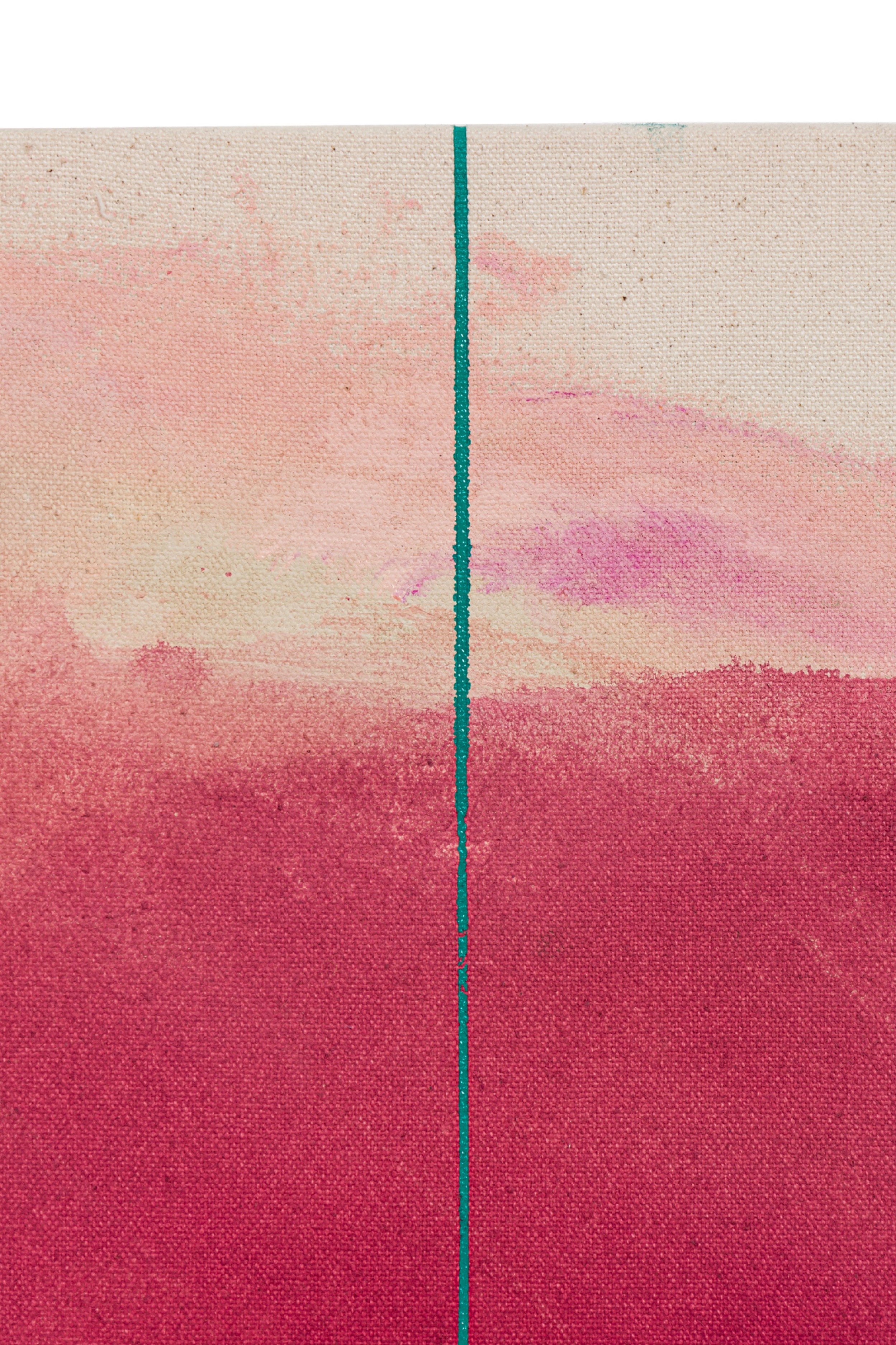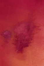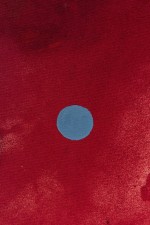American contemporary abstract expressionist composition in a color field of reddish pinks with a sky blue circle in the left side of the canvas and vertical blue stripe on the right side (Signed: Lower Right) (SHARONE HALEVY).