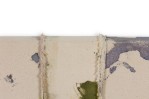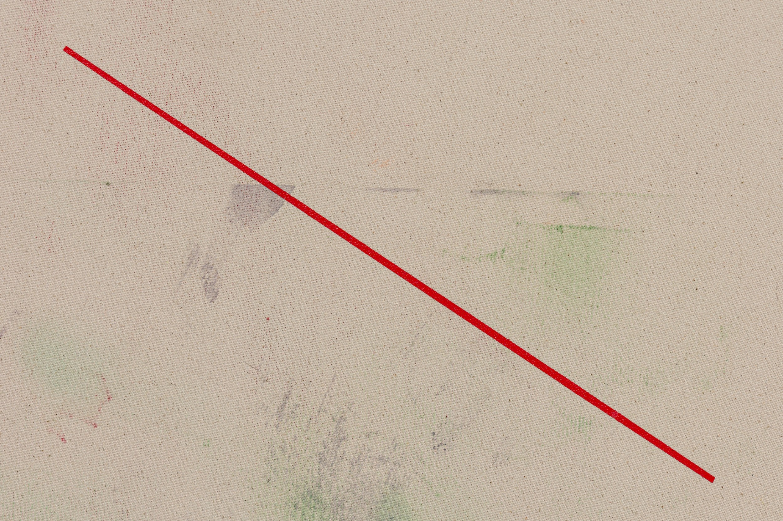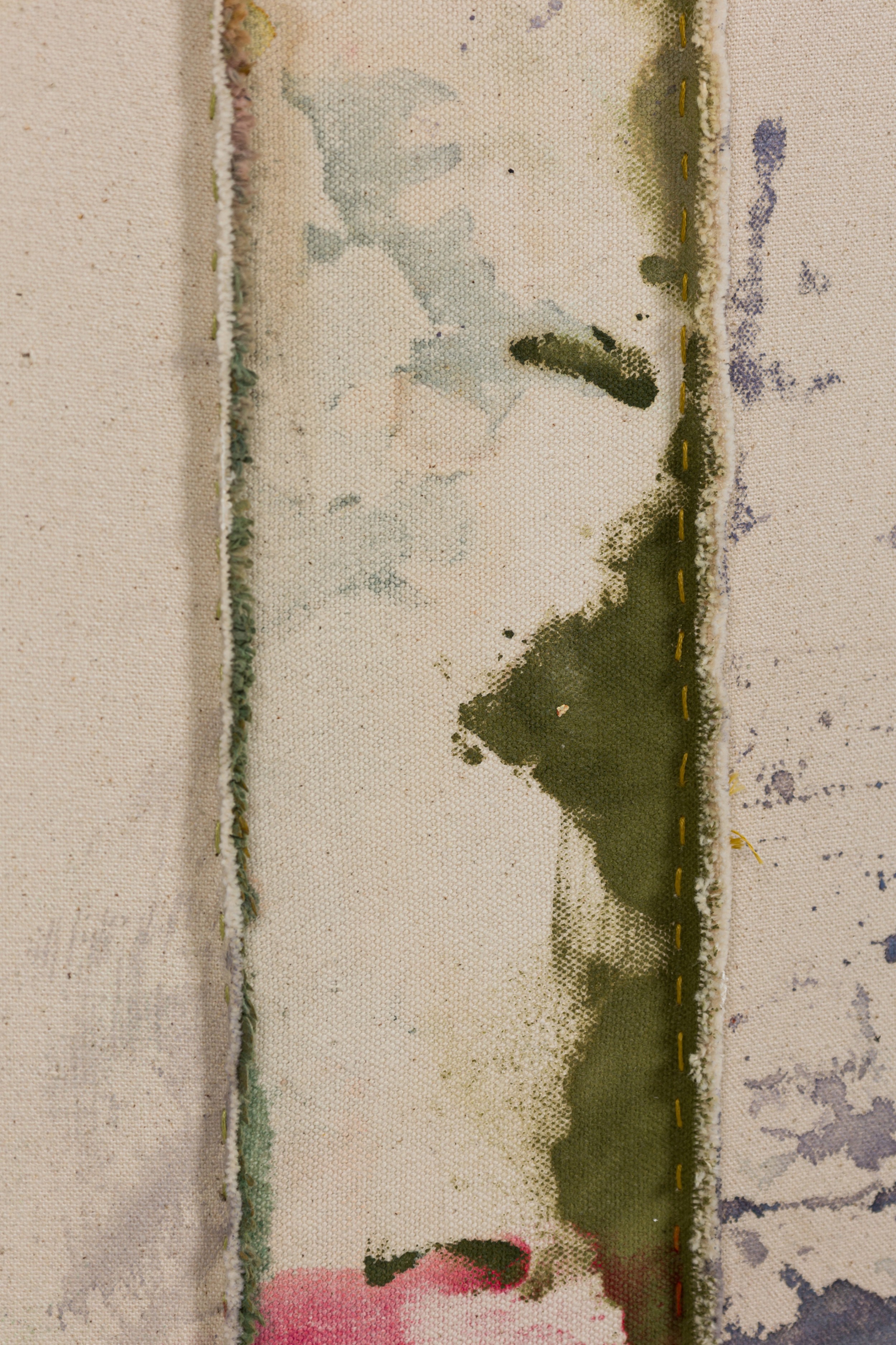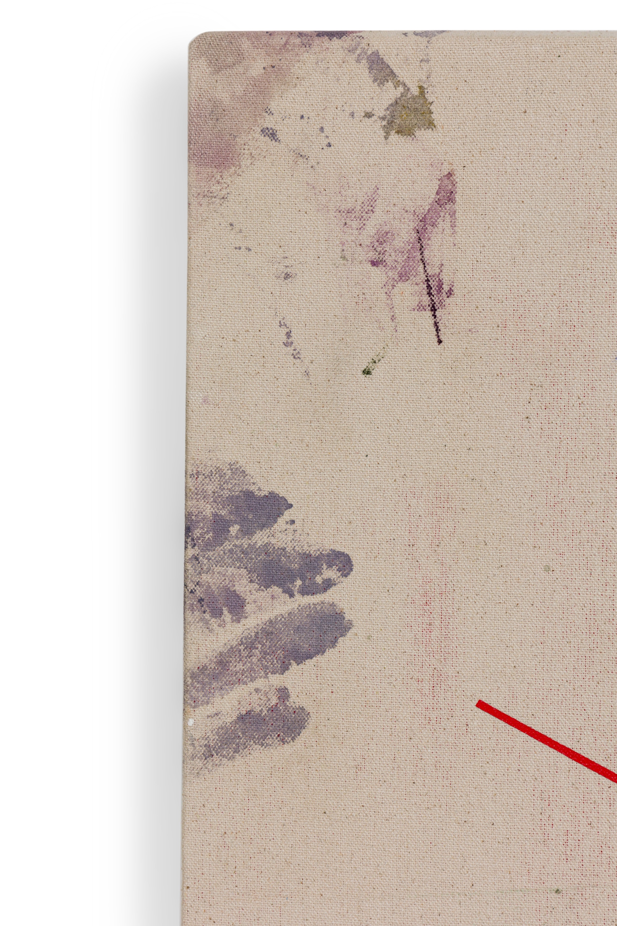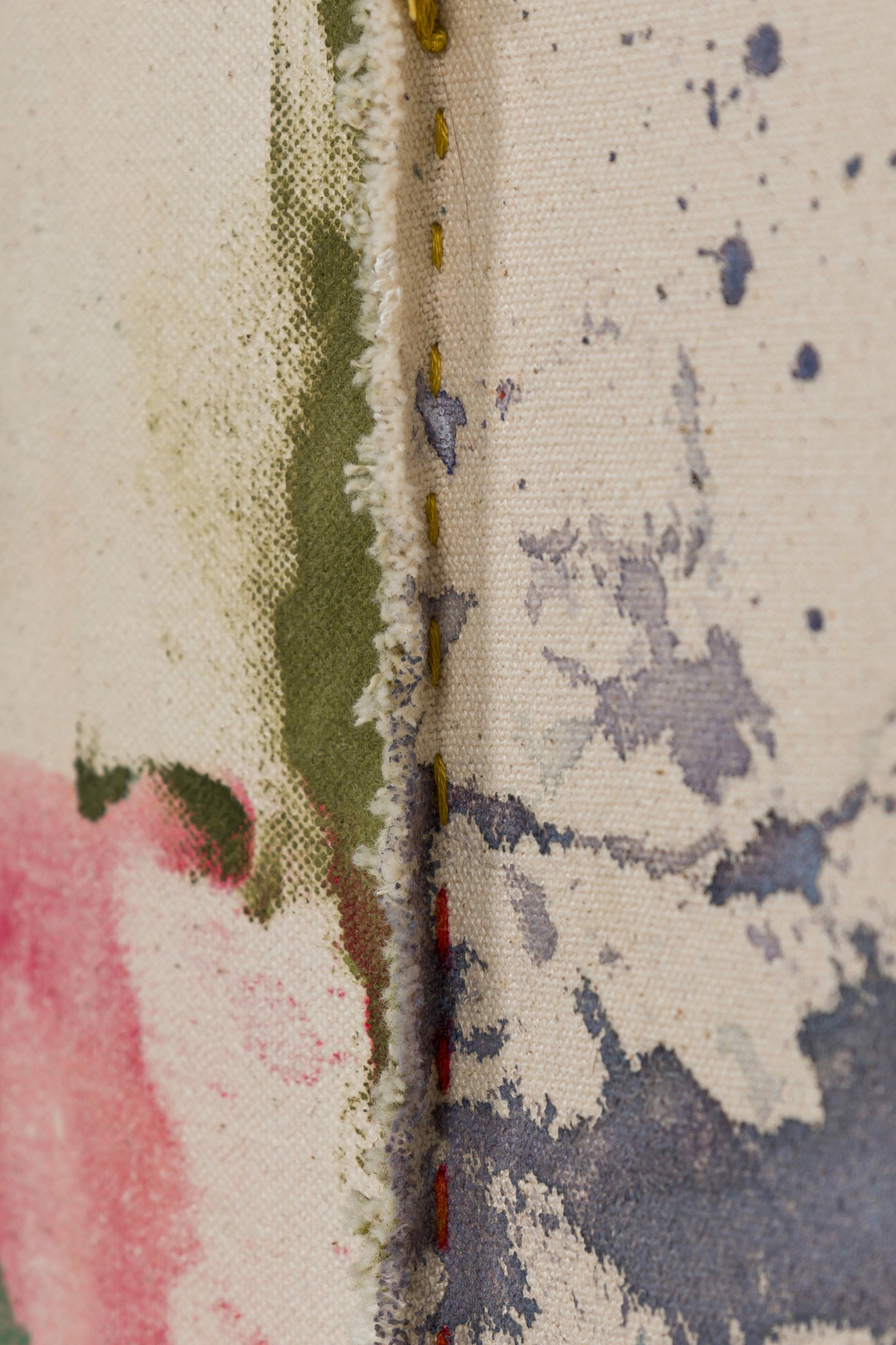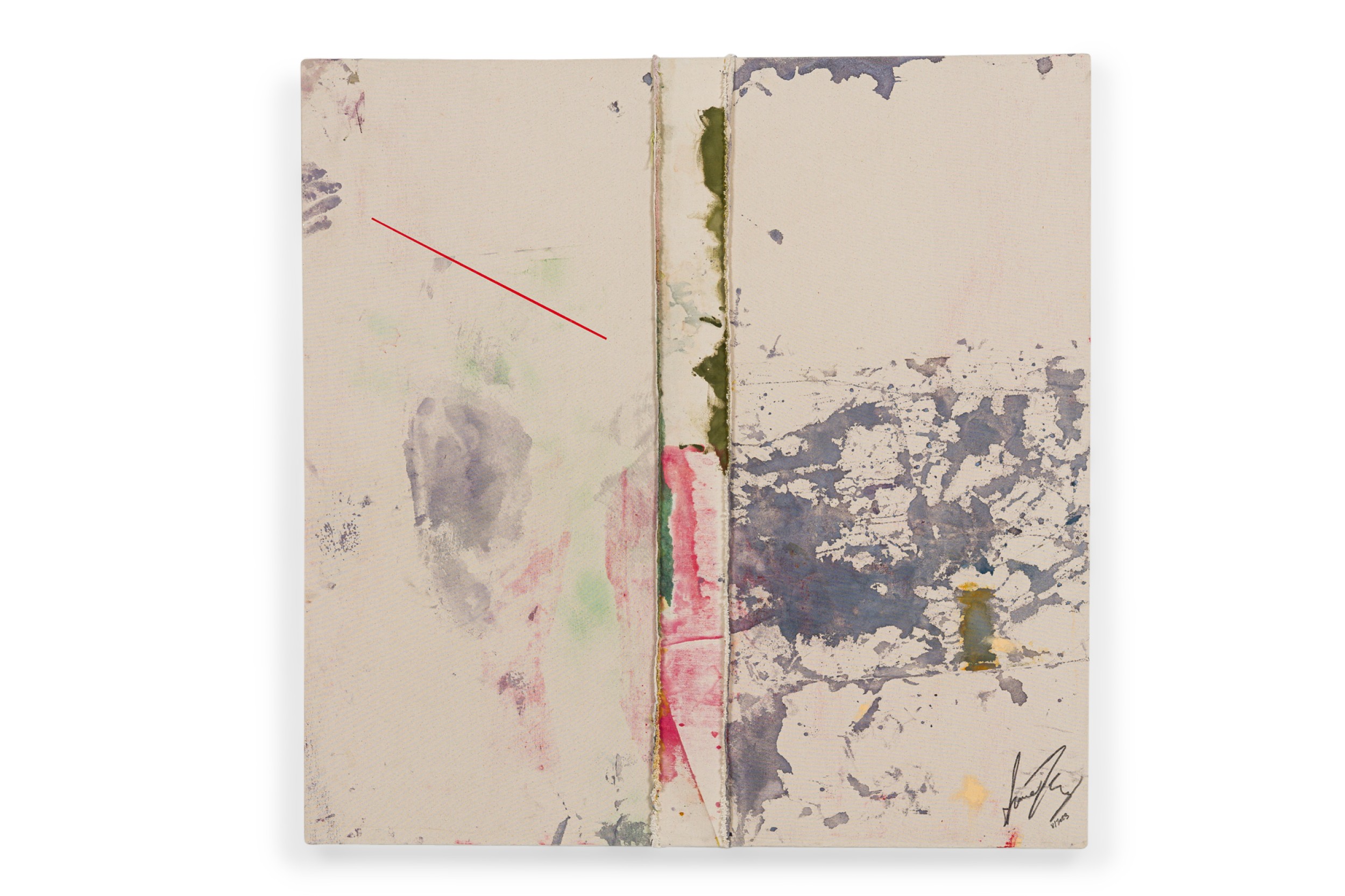 American contemporary abstract expressionist composition of stitched canvas with paint splatter and a diagonal red line in the upper left section (Signed: Lower Right) (SHARONE HALEVY).