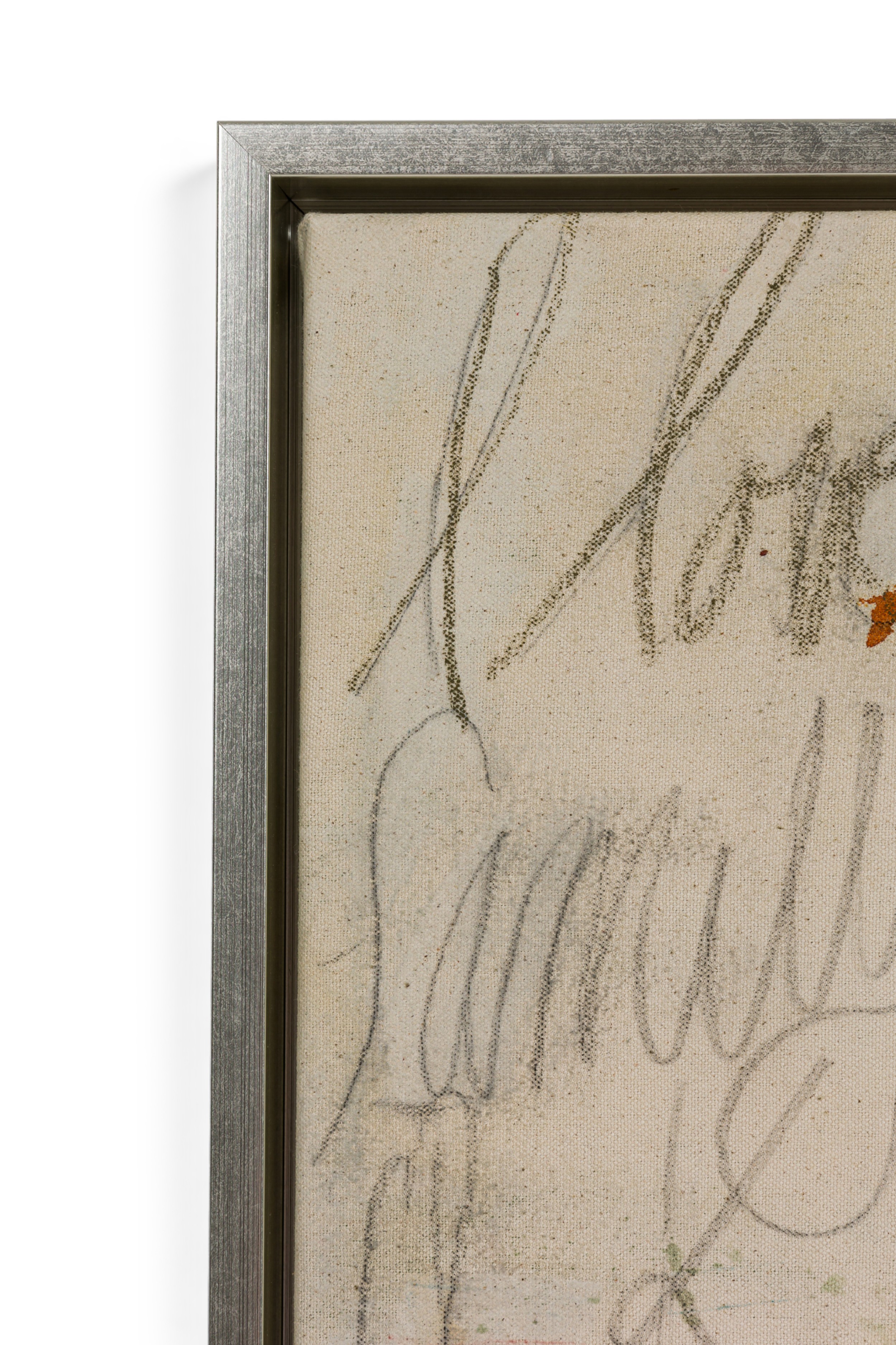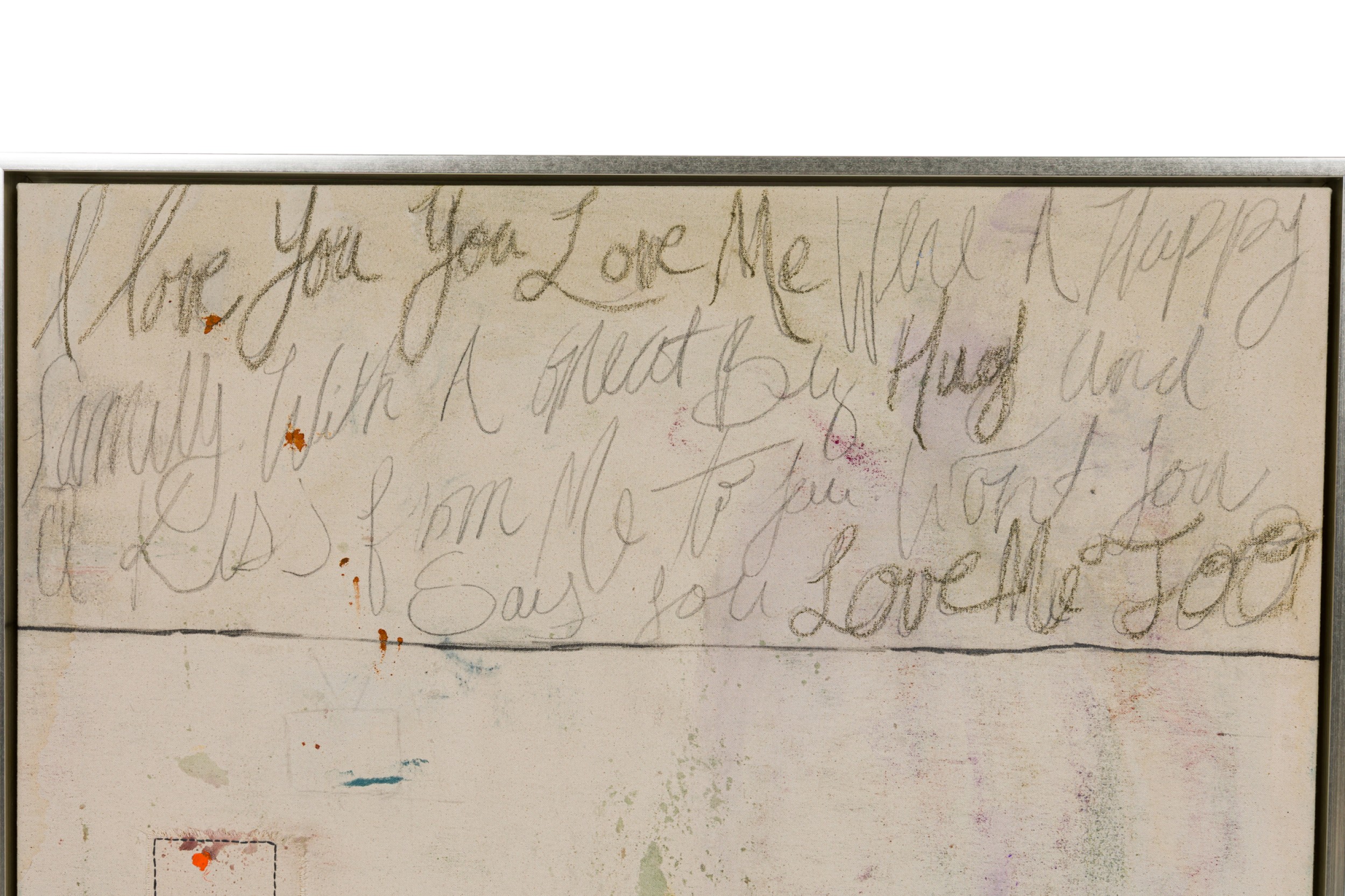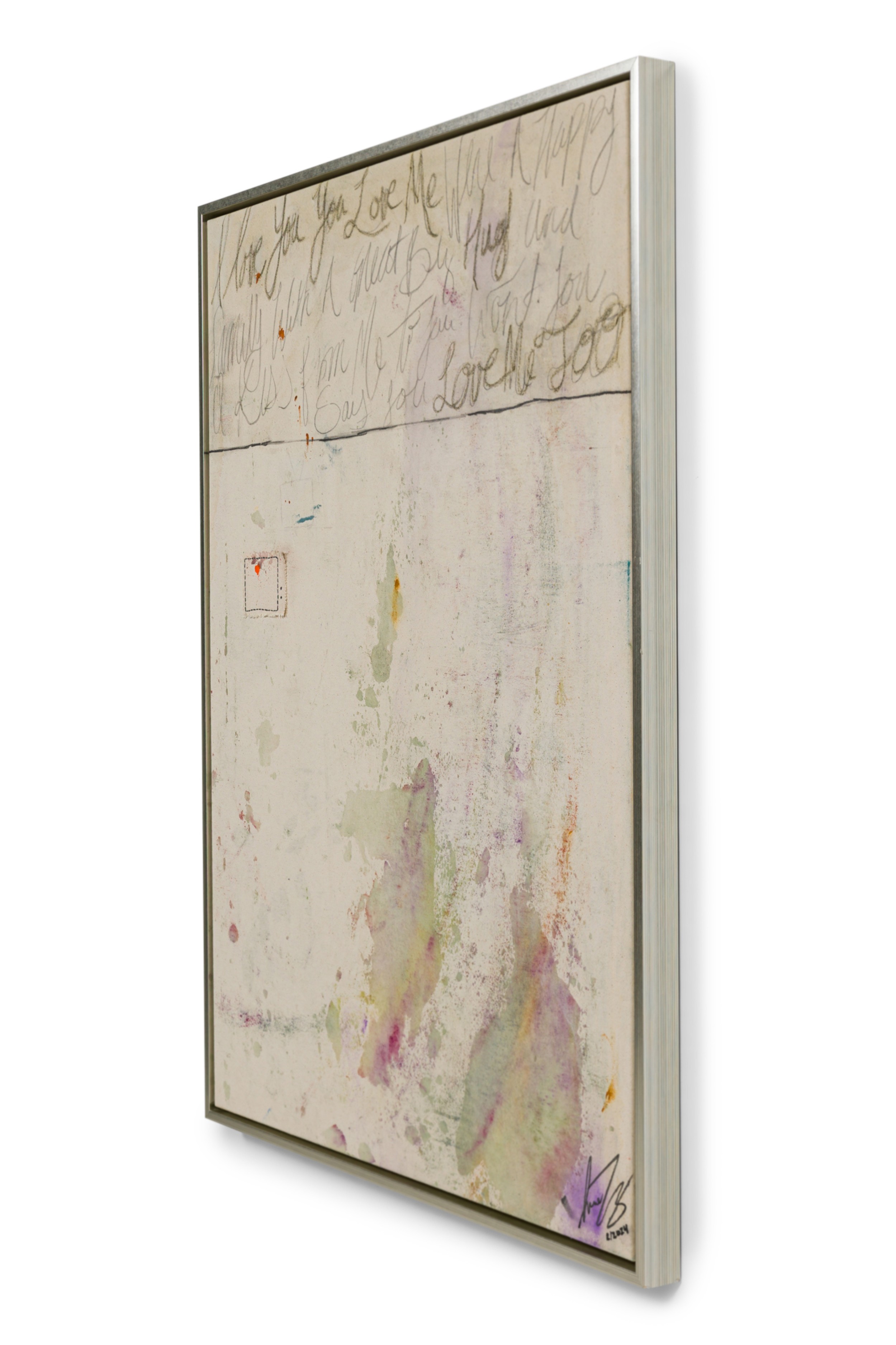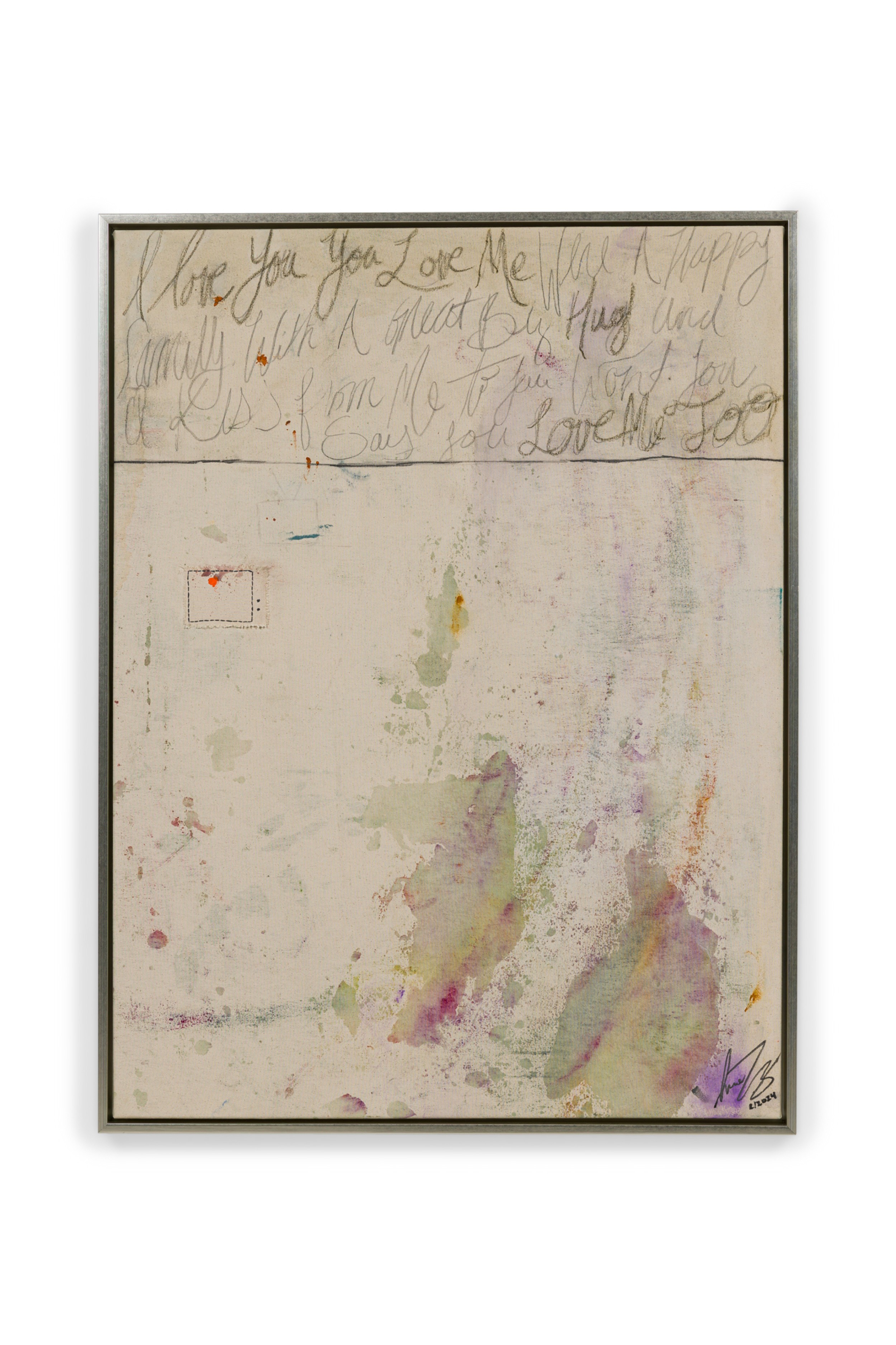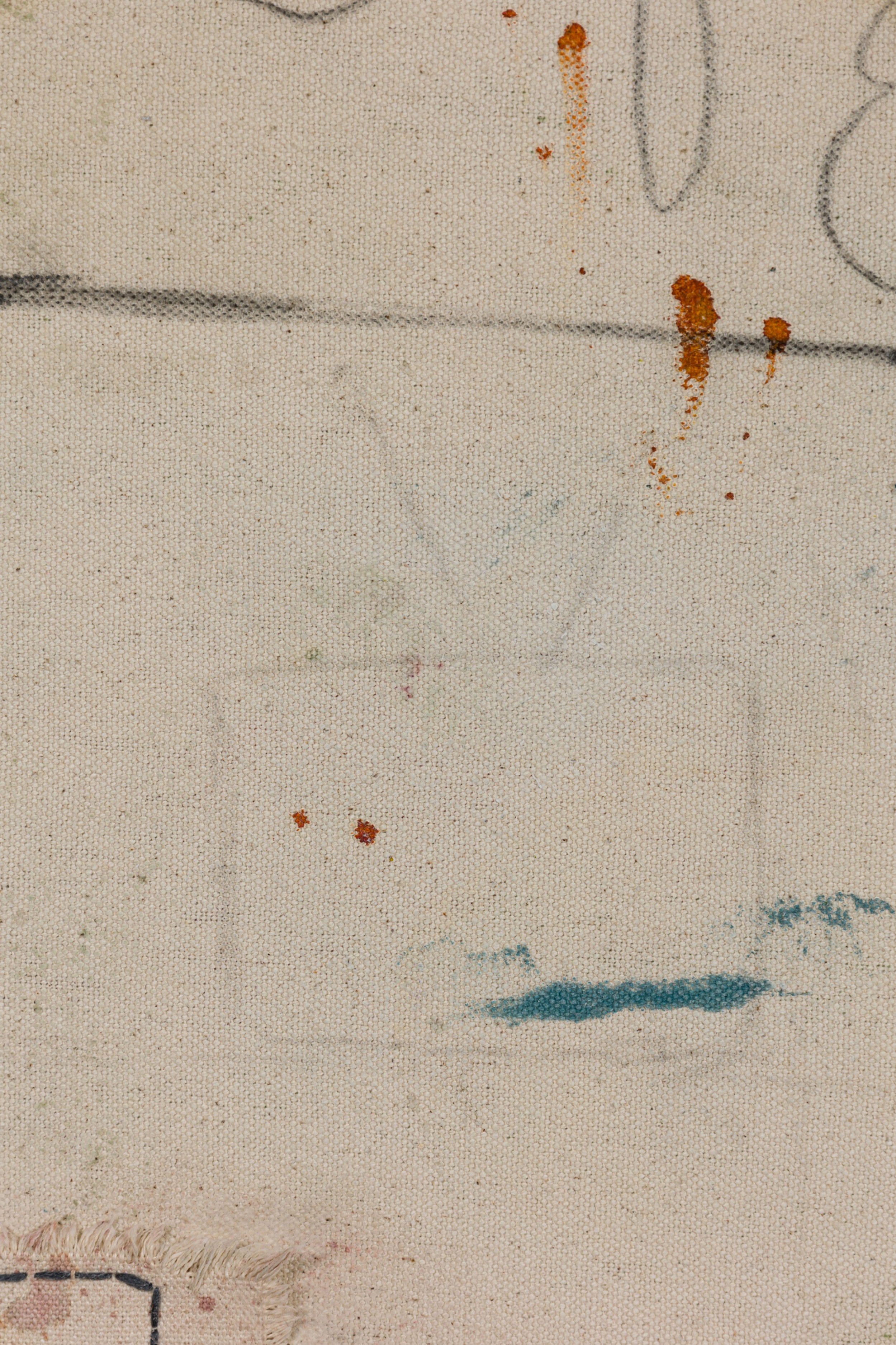 American contemporary abstract expressionist composition in a color field of white and grey pale tones with writing on the upper section of the canvas and a stitched patch on the left side of the canvas (SHARONE HALEVY).