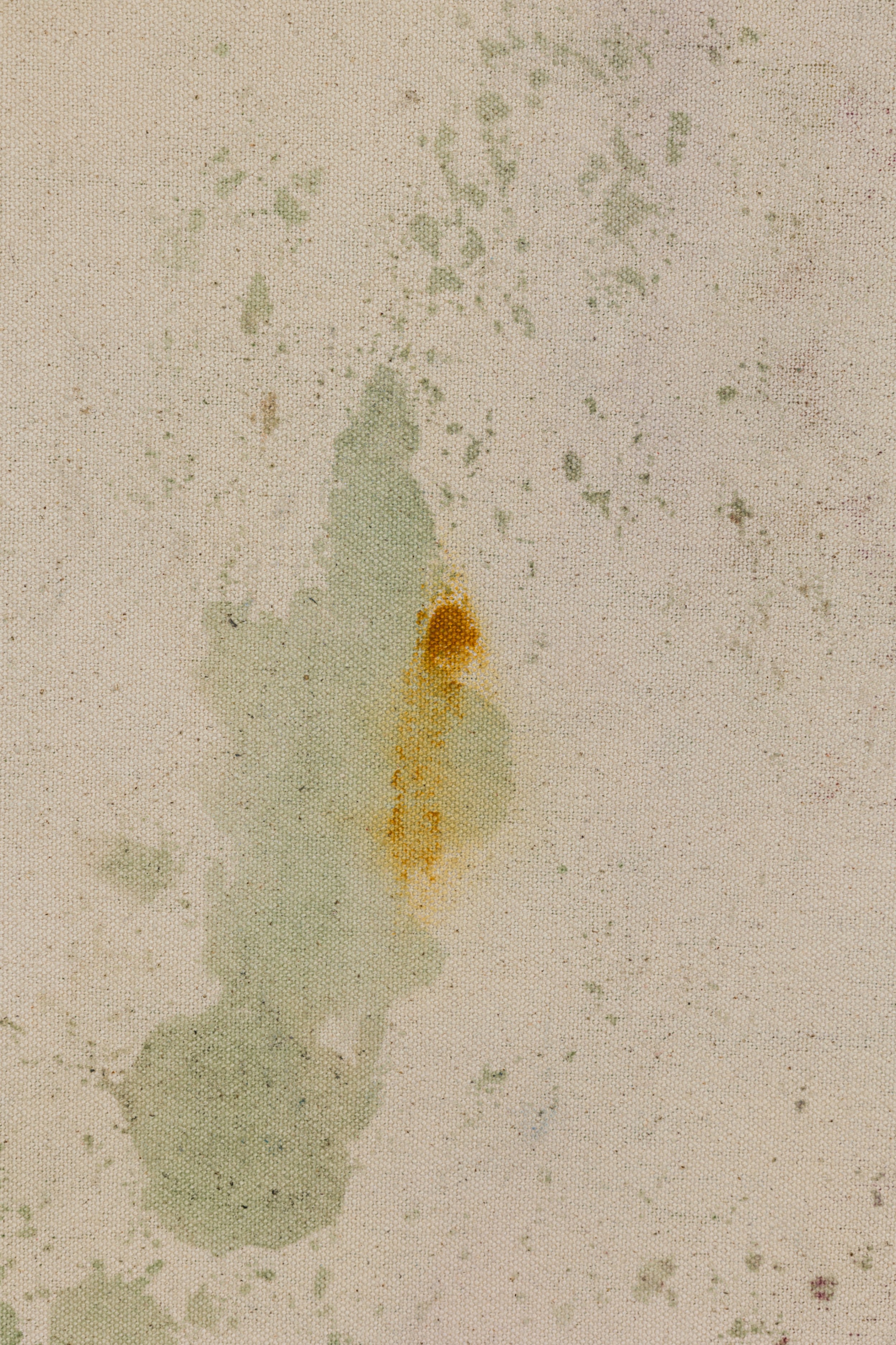 American contemporary abstract expressionist composition in a color field of white and grey pale tones with writing on the upper section of the canvas and a stitched patch on the left side of the canvas (SHARONE HALEVY)