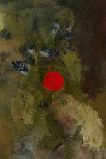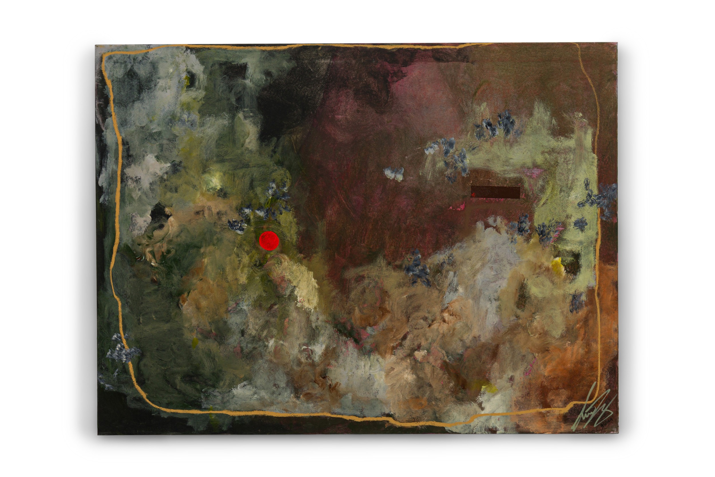 American contemporary abstract expressionist composition in a color field of muted greens, blues and pink mixed media with a striking red dot on the left side of the canvas and a golden yellow border (Signed: Lower Right) (SHARONE HALEVY).