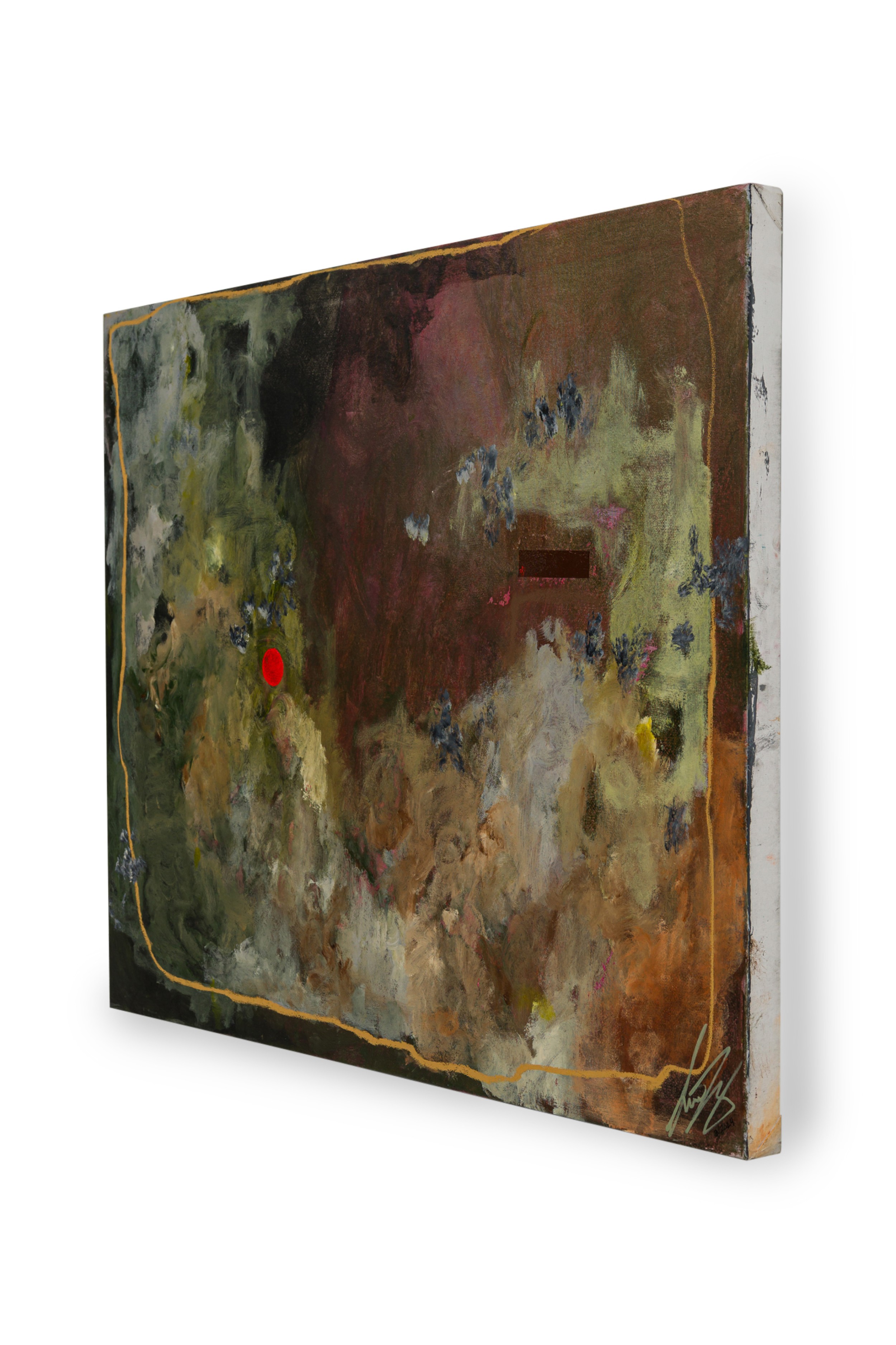 American contemporary abstract expressionist composition in a color field of muted greens, blues and pink mixed media with a striking red dot on the left side of the canvas and a golden yellow border (Signed: Lower Right) (SHARONE HALEVY)