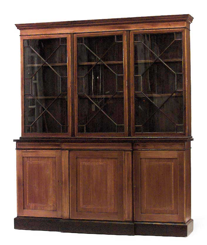 English Sheraton-style (18/19th Century) mahogany & satinwood inlaid breakfront cabinet with 3 doors at bottom and 3 lattice glass doors on top section..