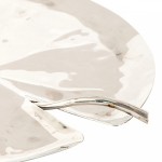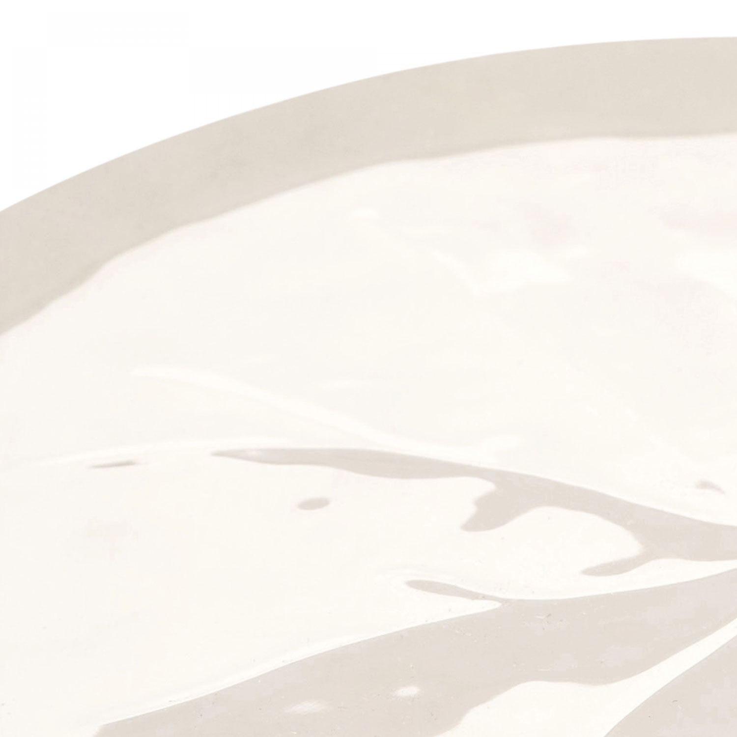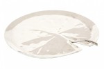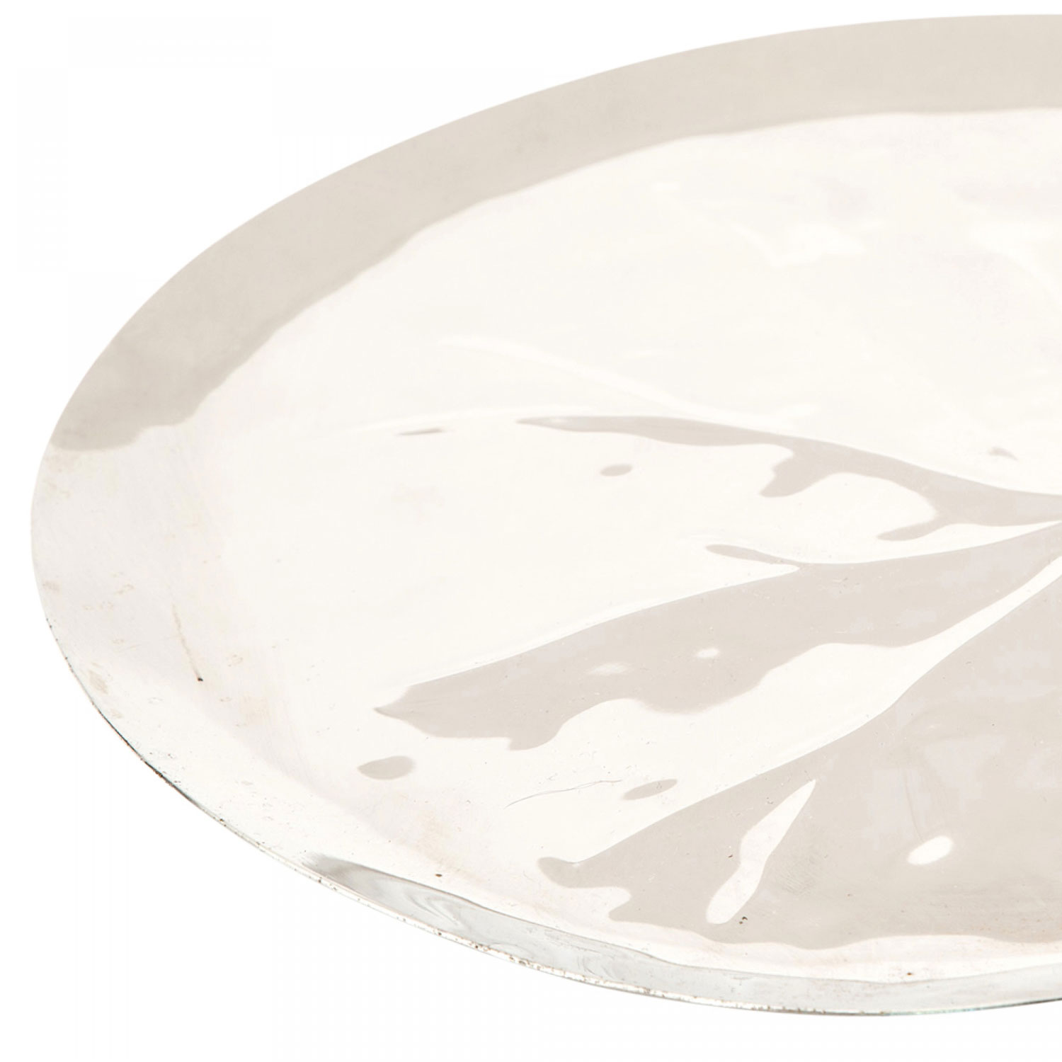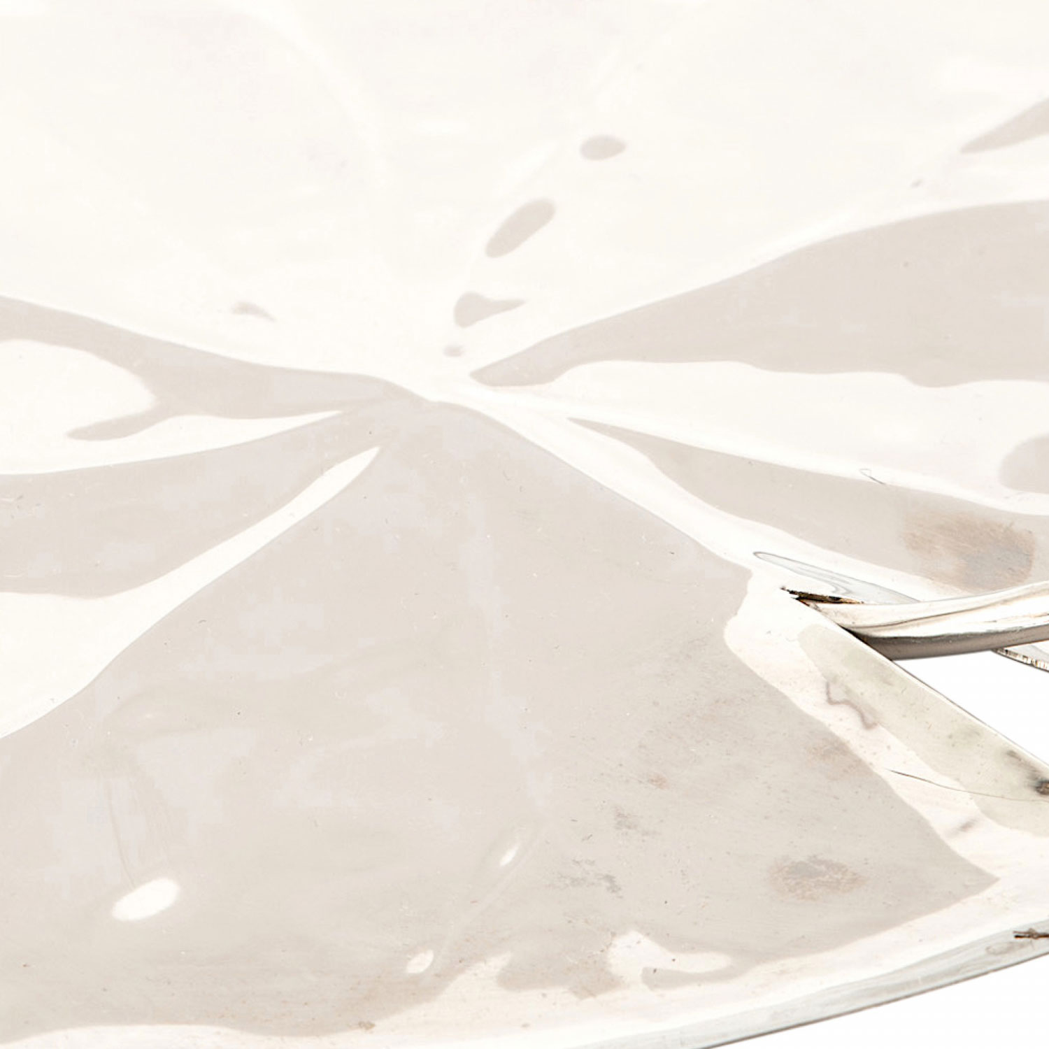 Silver metal serving tray shaped like a lilly pad by Michael Aram.
