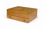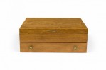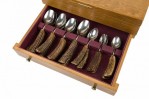 48-Piece Vintage German flatware set comprised of 12 forks, 12 small spoons, 12 large spoons, and 12 butter knives, made of stainless steel with horn handles, contained in a dedicated wooden box with hinged top and lower drawer. (SOLINGEN GERMANY ROSTFREI)(PRICED AS SET)