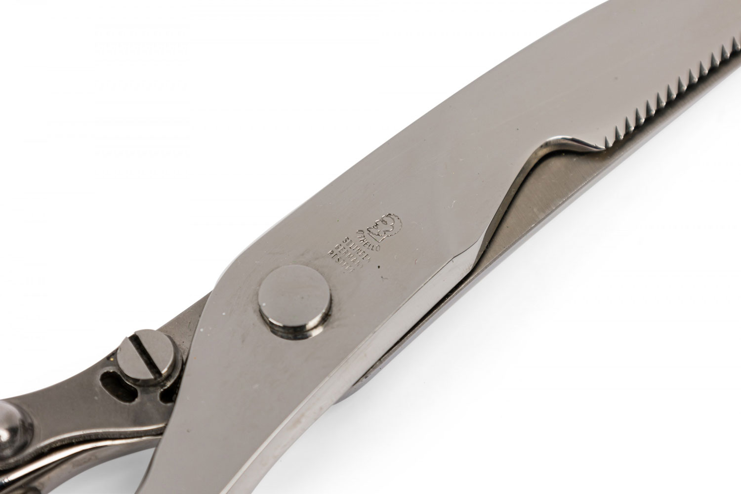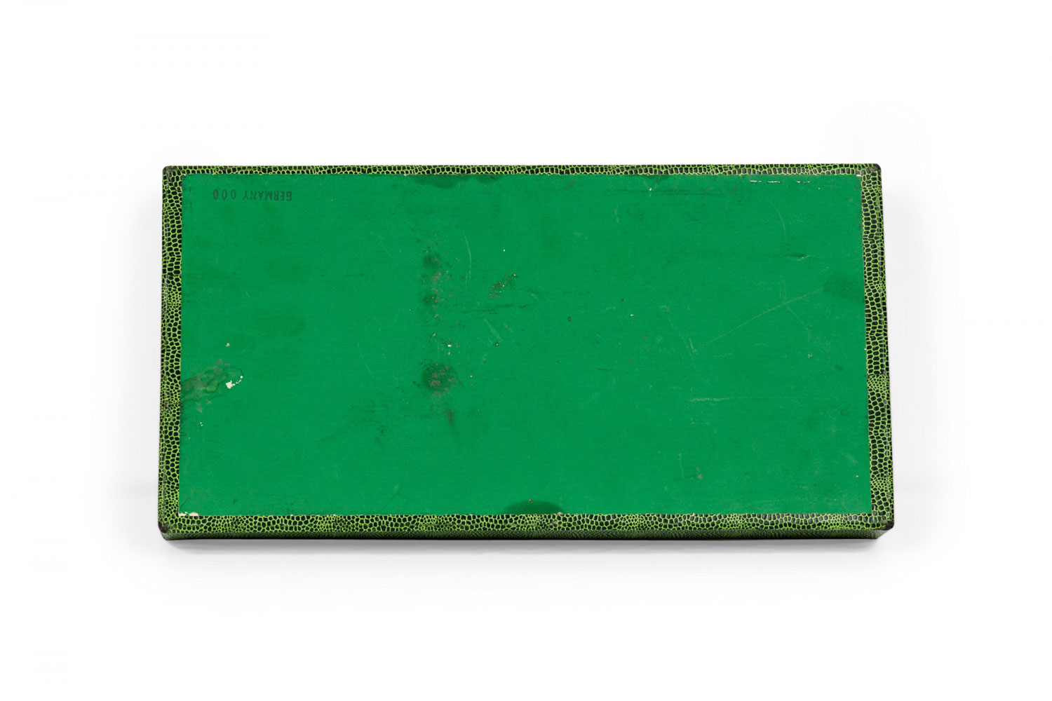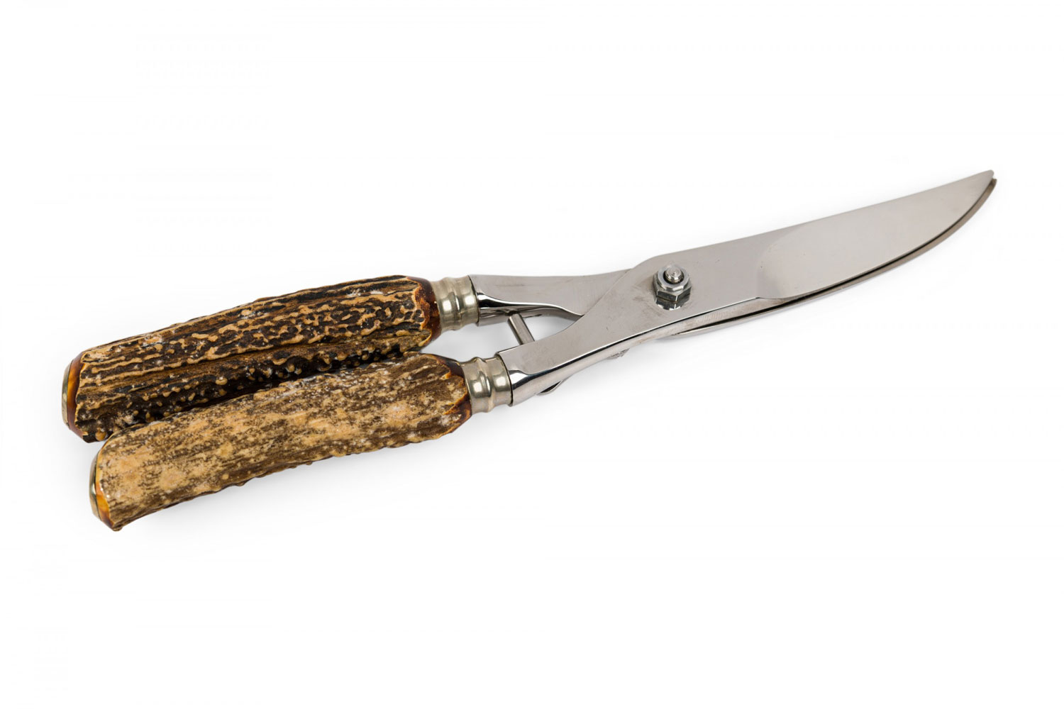 3-Piece German Rustic stainless steel and horn carving utensil set comprised of a carving knife, carving fork, and shears, in a green satin-lined box. (stampled, OTHELLO SOLINGEN ROSTFREI)(PRICED AS SET)(Similar piece: 063344)