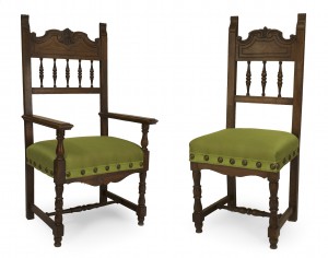 Style: Spanish Renaissance Materials & Techniques: Inlaid, walnut Category: Seating Condition: Wear on seats reflective of age.
