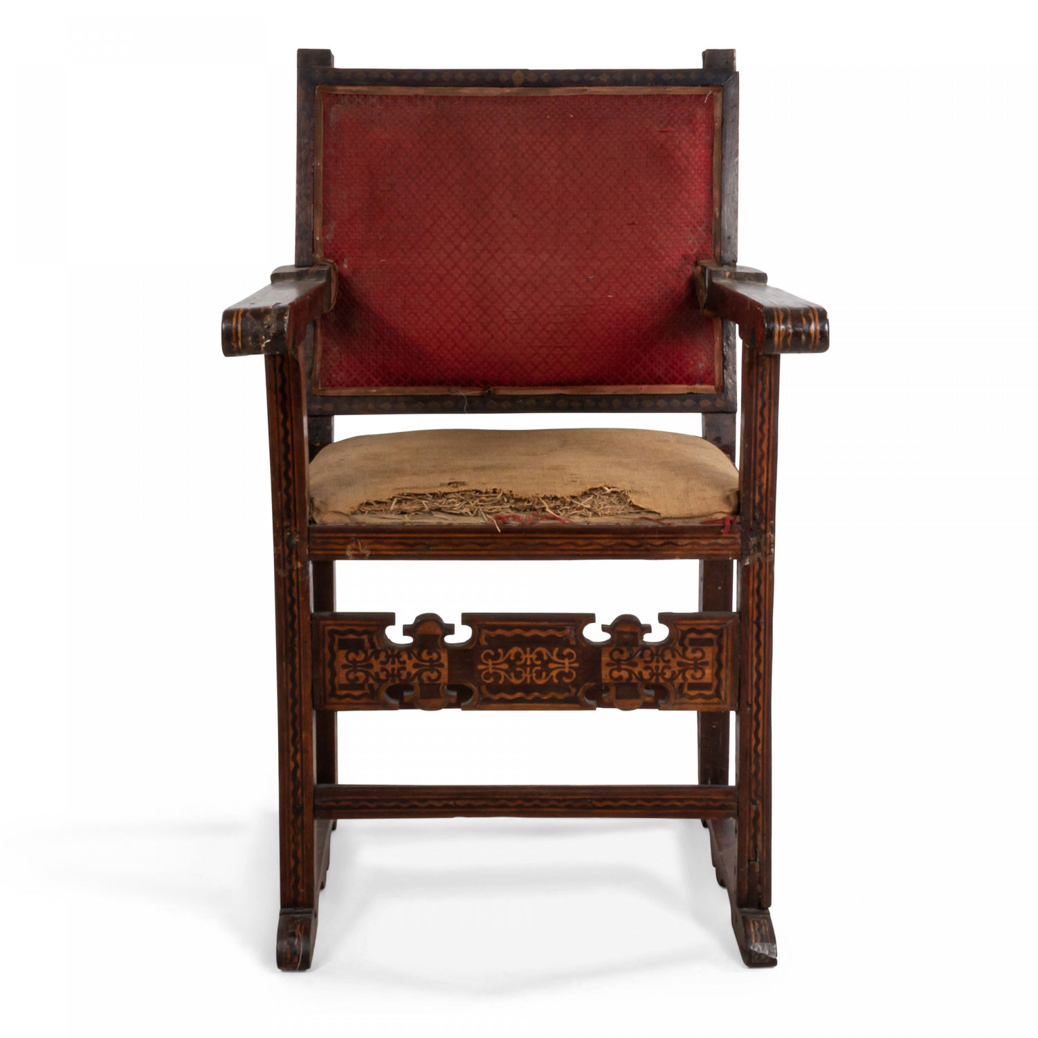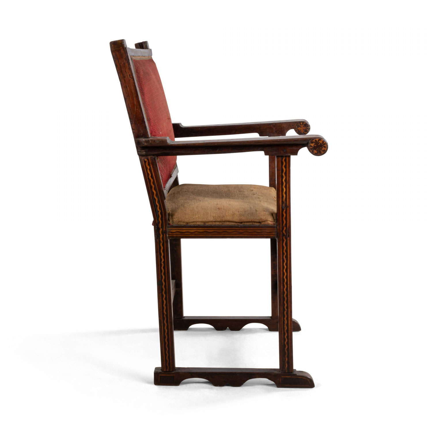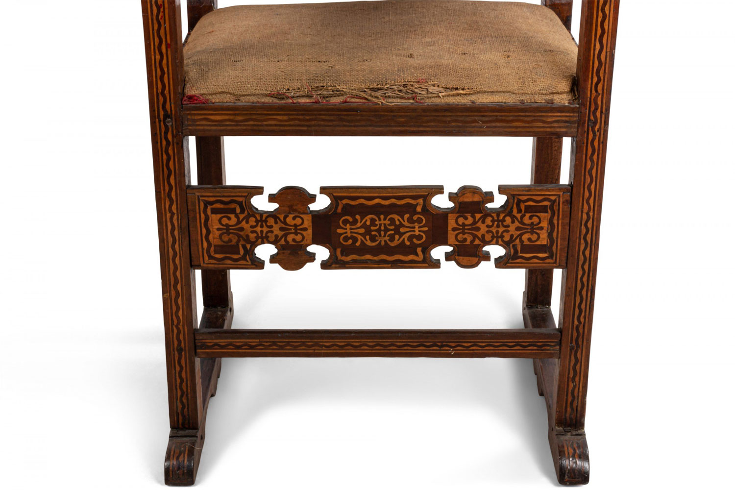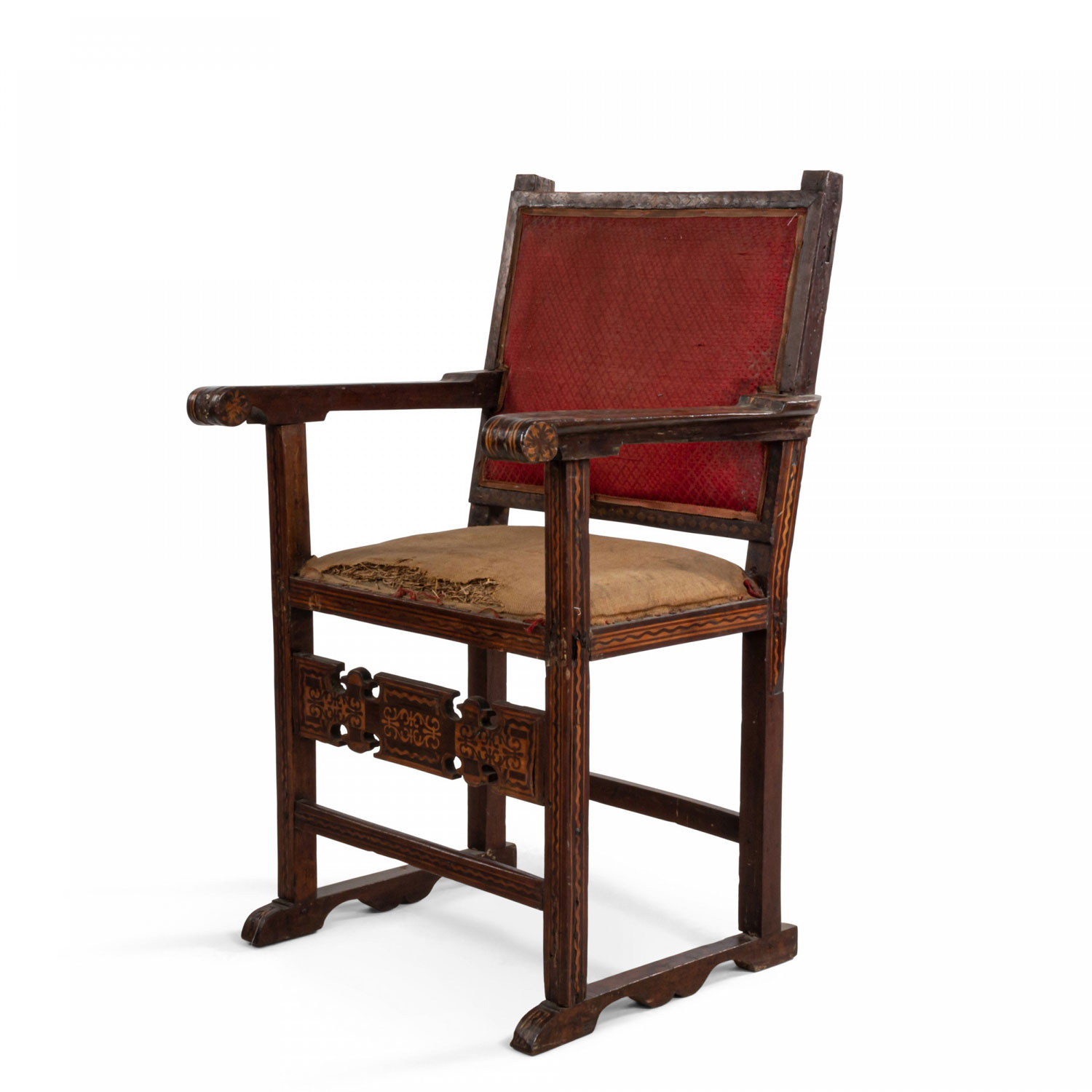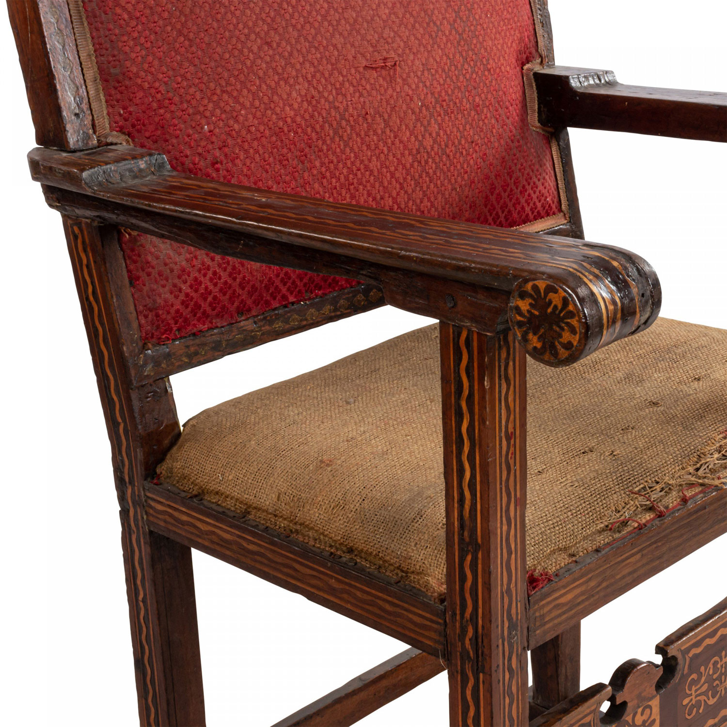 PAIR of Spanish Colonial (South American possibly 17th Cent) walnut Armchairs with a square back and from stretcher with a geometric inlaid design.