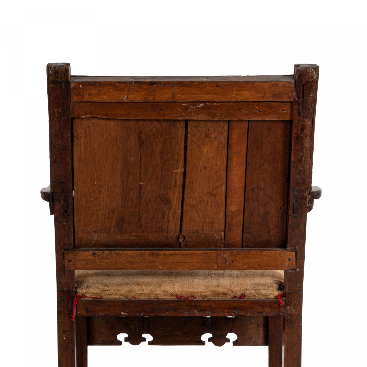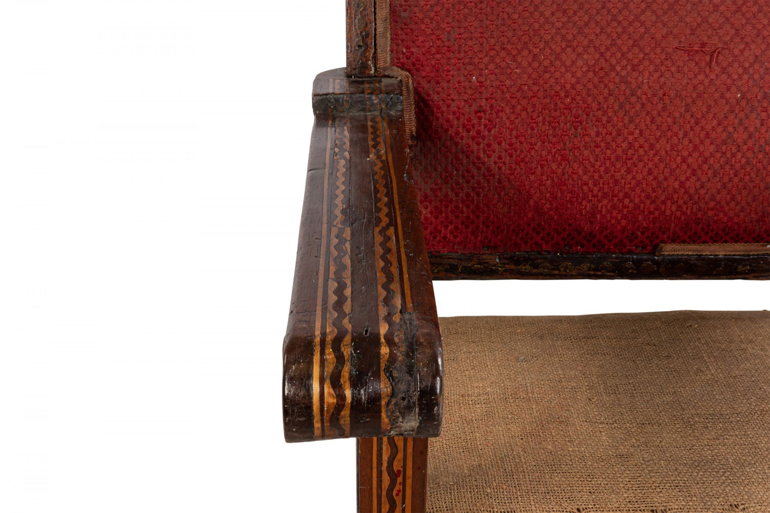 PAIR of Spanish Colonial (South American possibly 17th Cent) walnut Armchairs with a square back and from stretcher with a geometric inlaid design..