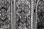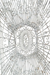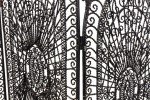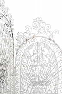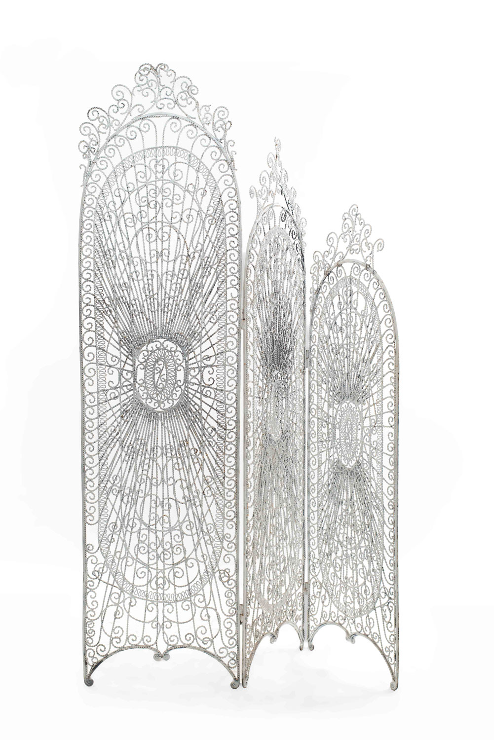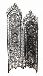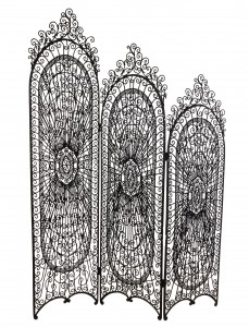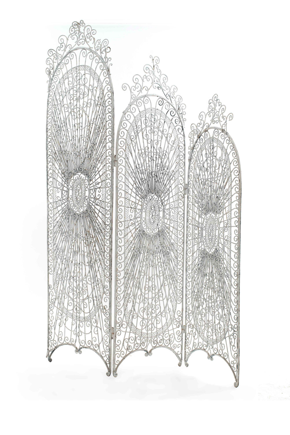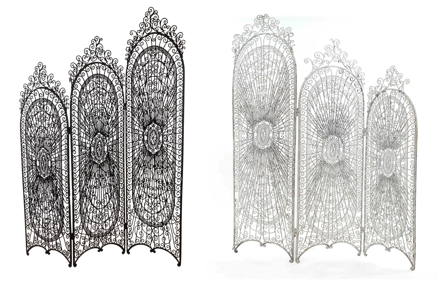 2 Spanish style (20th Century) painted iron 3 tier screens with sunburst and scroll design, one white, one black. (PRICED EACH)