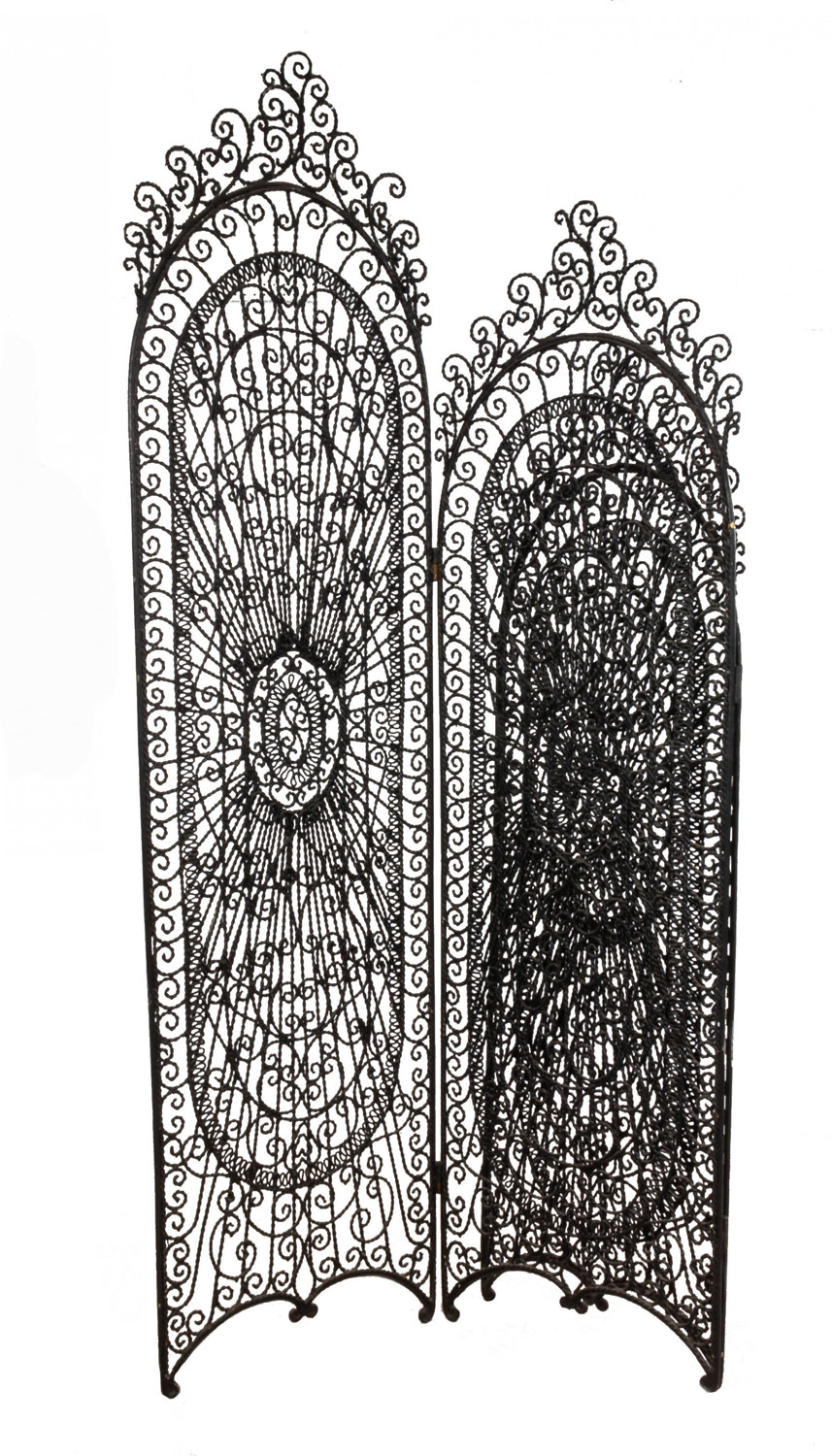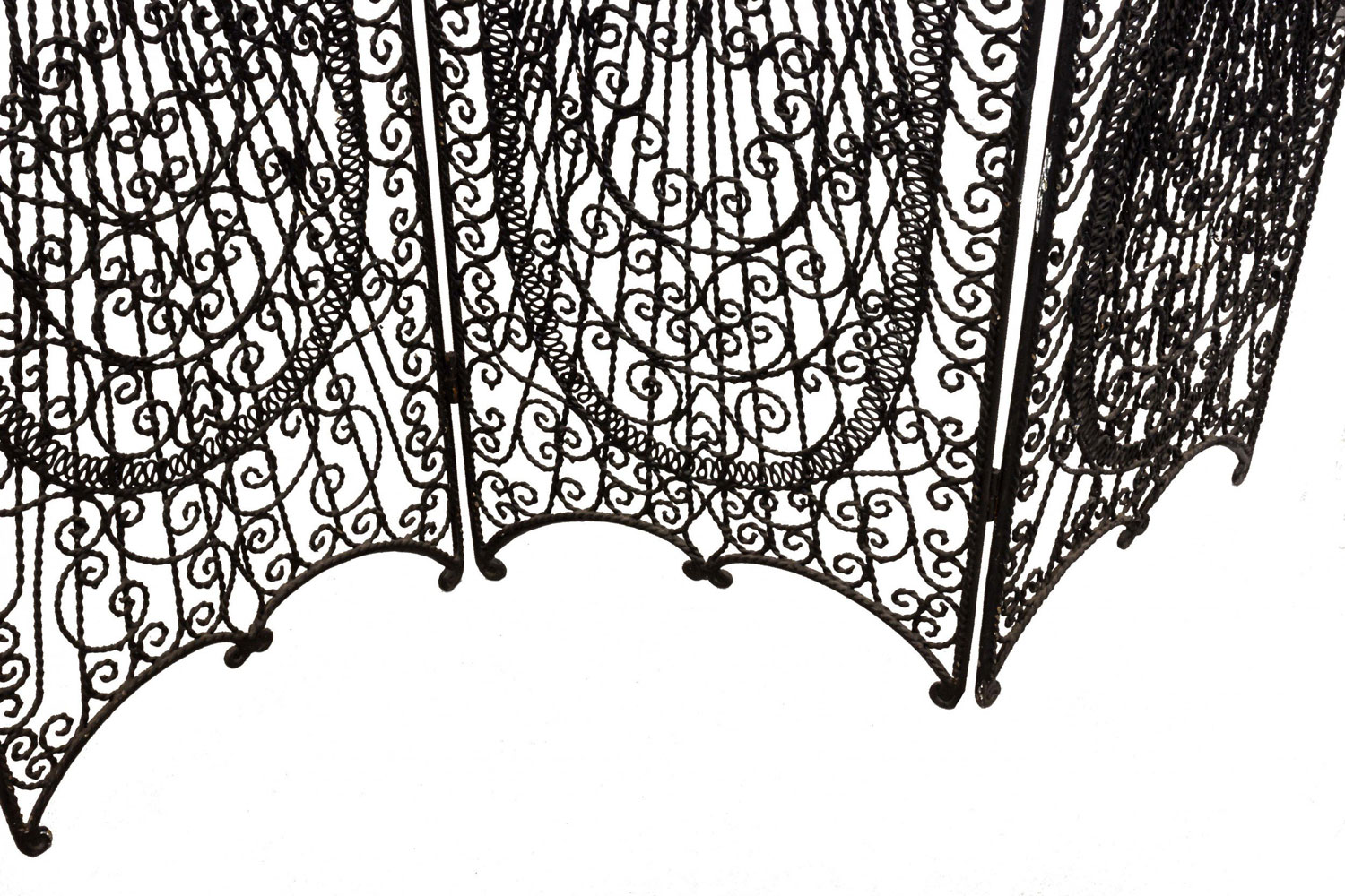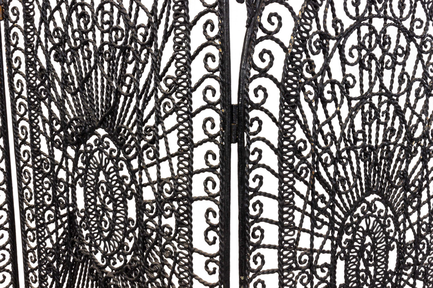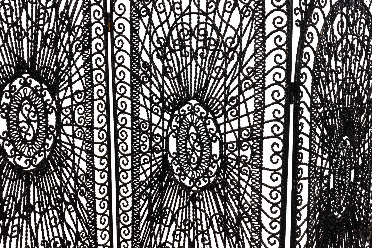 2 Spanish style (20th Century) painted iron 3 tier screens with sunburst and scroll design, one white, one black. (PRICED EACH).