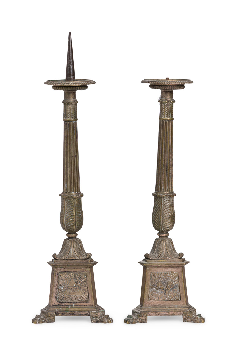 PAIR of Spanish Renaissance-style (19th Century) style silver plate fluted column altar sticks on tripod base (PRICED AS PAIR).
