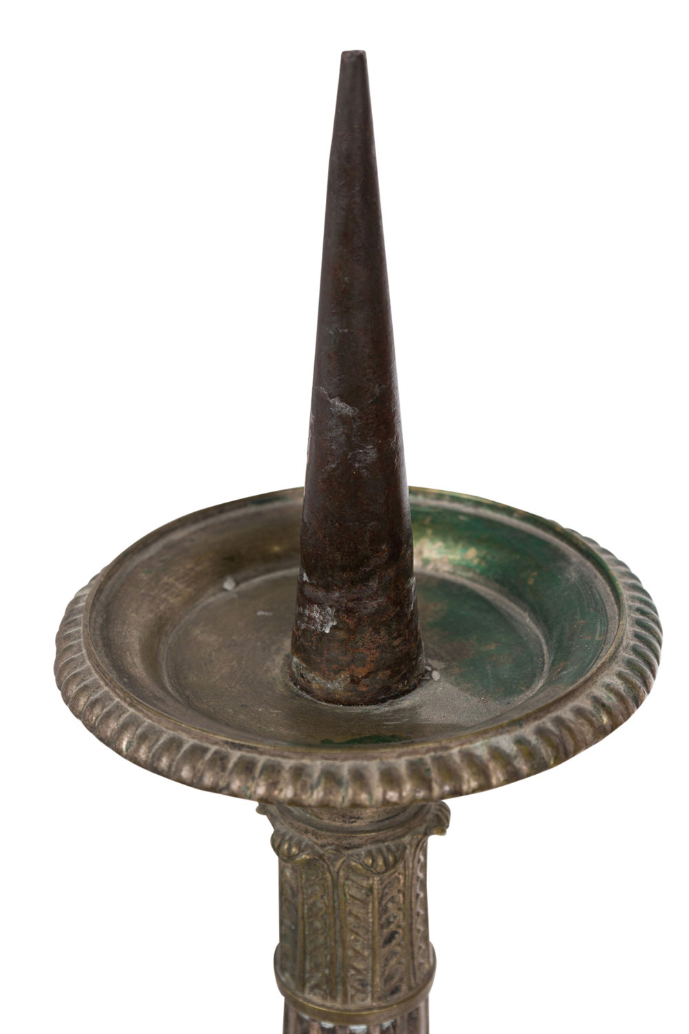 PAIR of Spanish Renaissance-style (19th Century) style silver plate fluted column altar sticks on tripod base (PRICED AS PAIR)