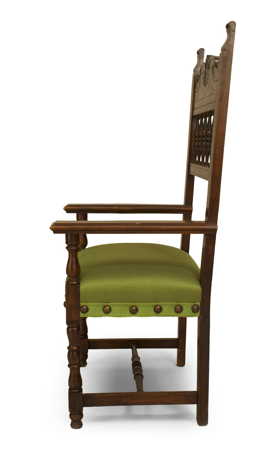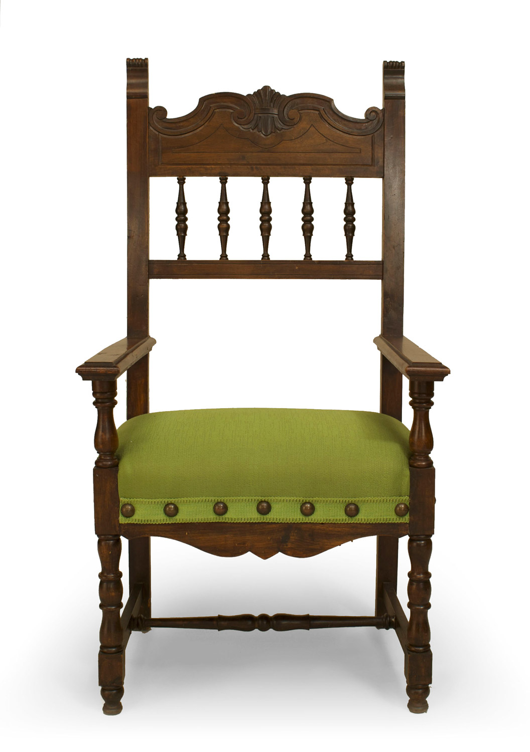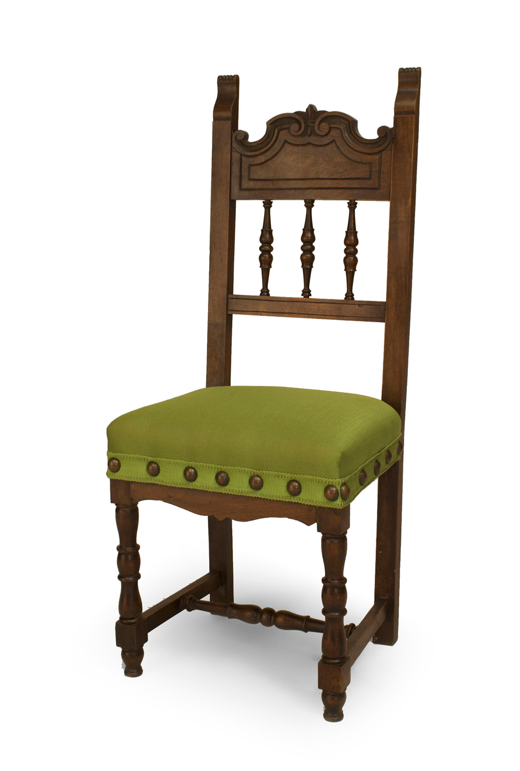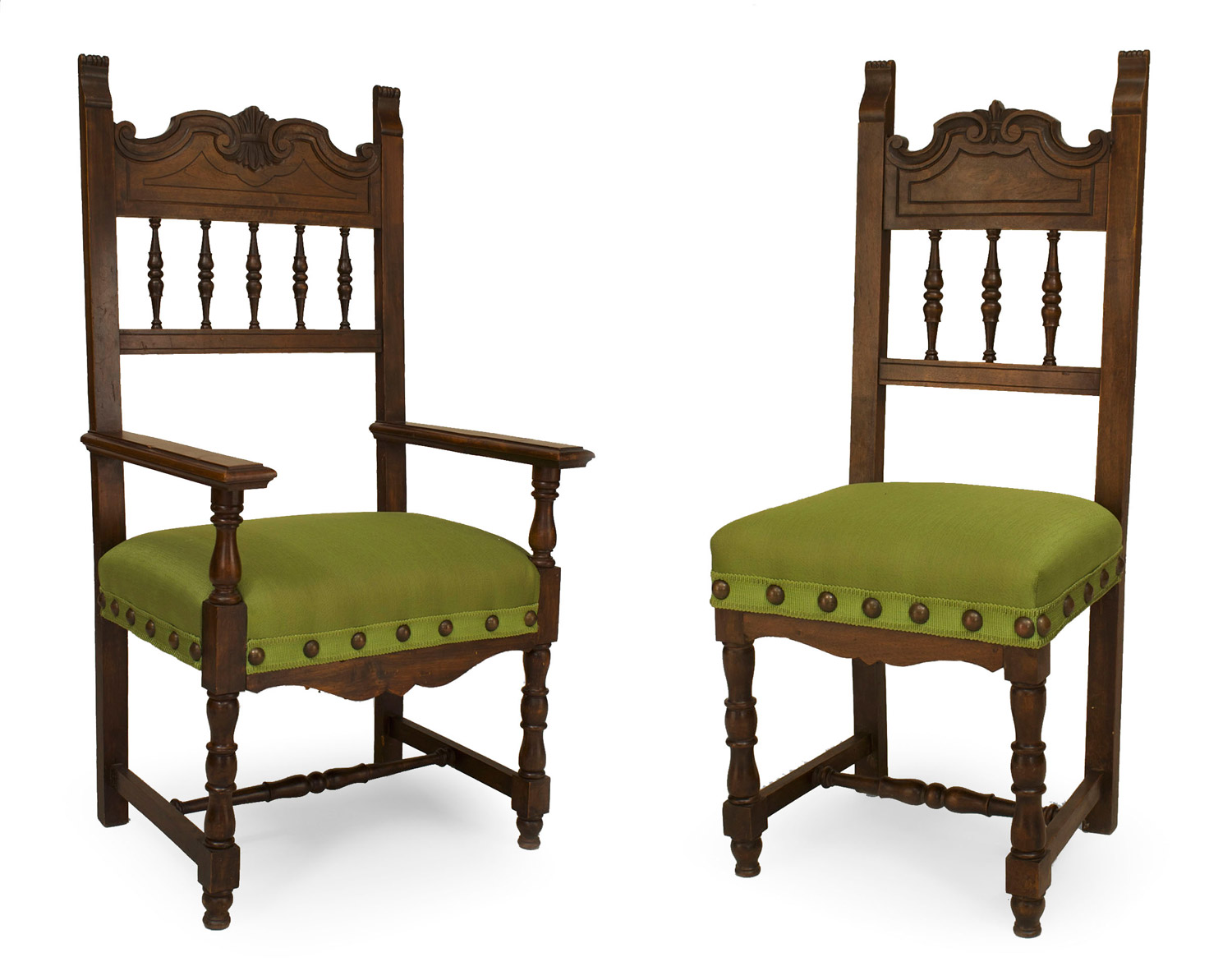 SET of 12 Spanish Renaissance style (19/20th Cent) walnut spindle back chairs with stretcher and green upholstered seat (2 arm chairs: 27"w 21"d 52½"h, 10 side chairs).
