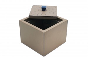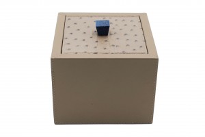 Contemporary square accessory box with a taupe ostrich printed calfskin leather exterior and gray suede interior (Made in Italy) (Related items: MOD004, MOD005)