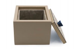 Contemporary square accessory box with a taupe ostrich printed calfskin leather exterior and gray suede interior (Made in Italy) (Related items: MOD004, MOD005).