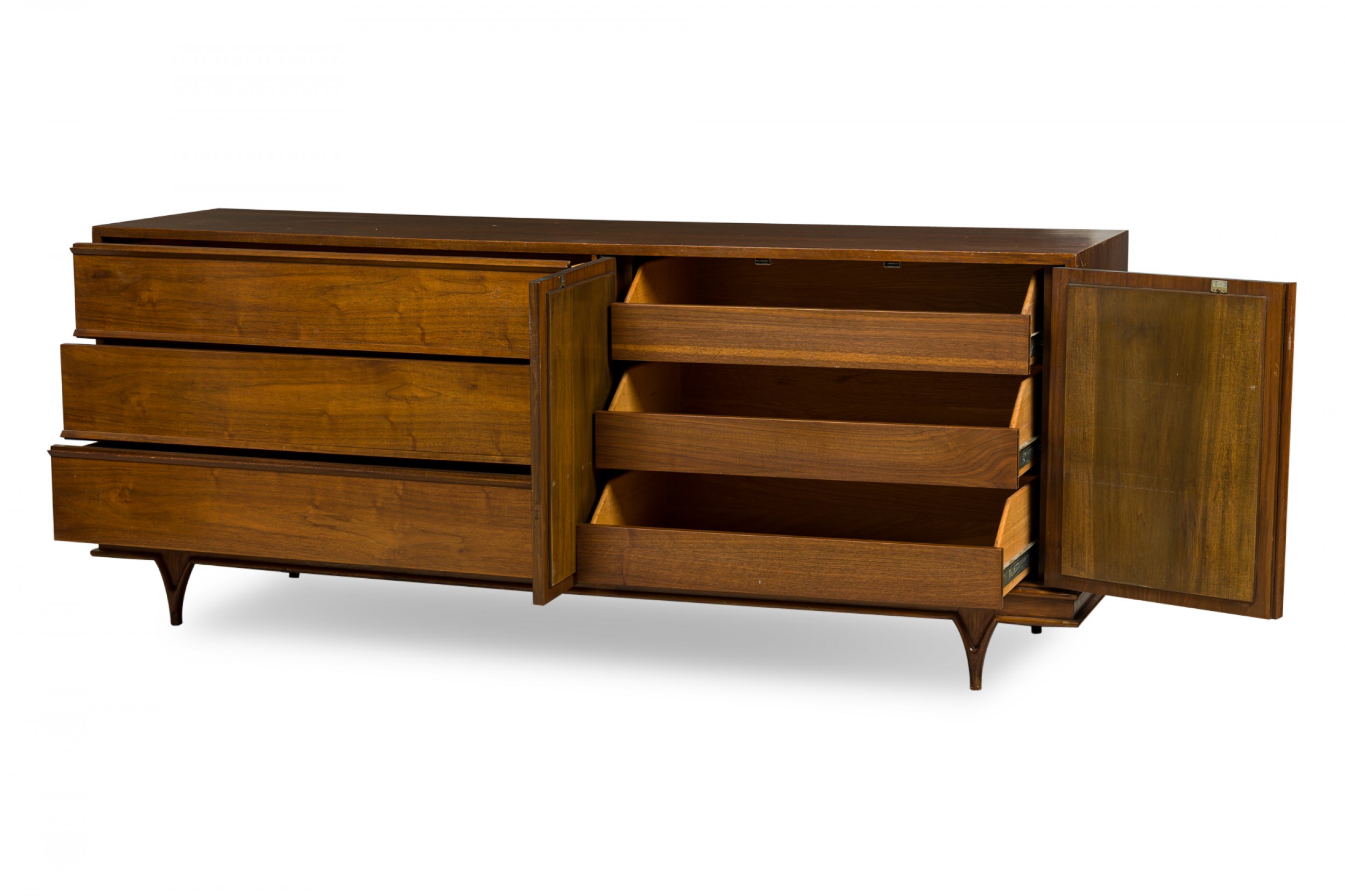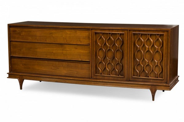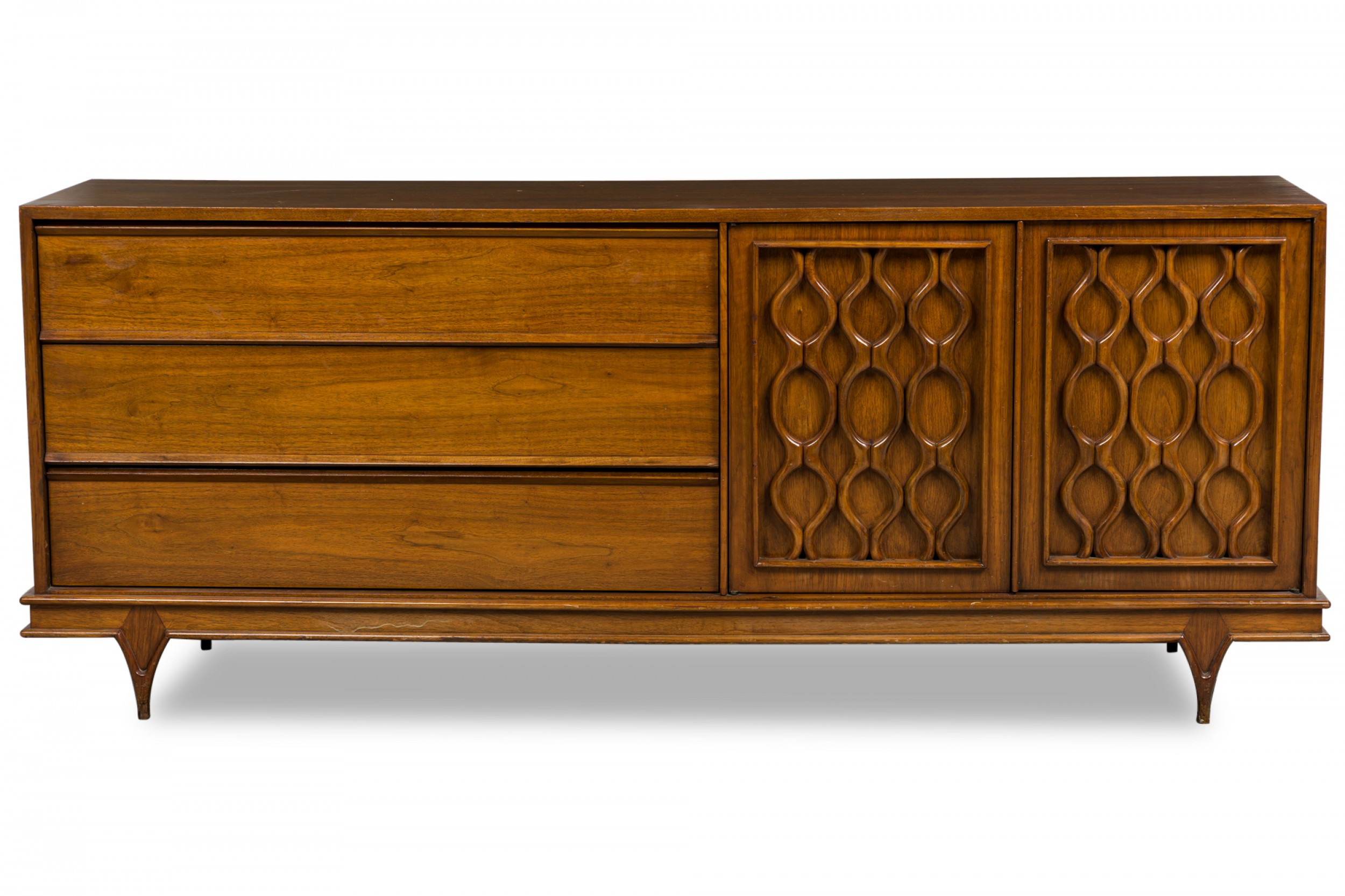 American Mid-Century walnut credenza / sideboard with three drawers on the left side, and two cabinet doors on the right with decoratively carved geometric fronts, resting on four short tapered walnut legs. (STANLEY FURNITURE)