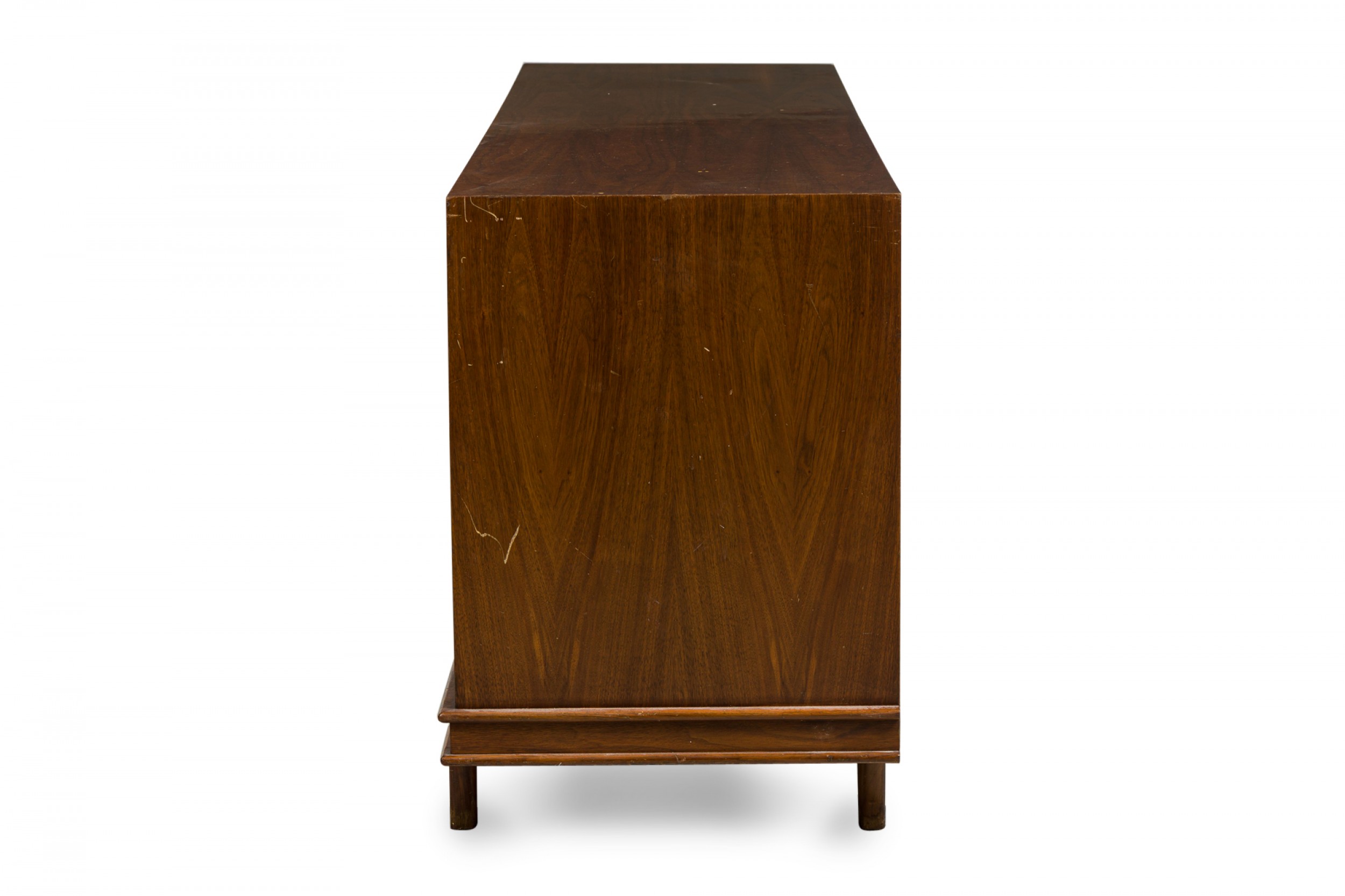 American Mid-Century walnut credenza / sideboard with three drawers on the left side, and two cabinet doors on the right with decoratively carved geometric fronts, resting on four short tapered walnut legs. (STANLEY FURNITURE).