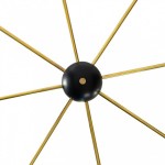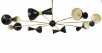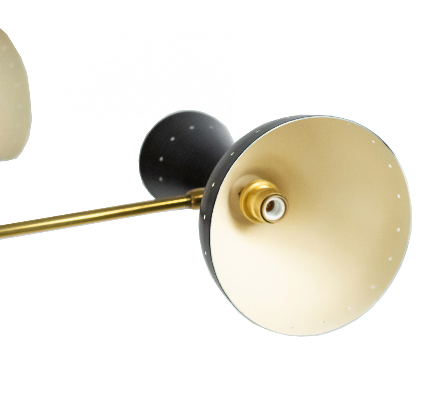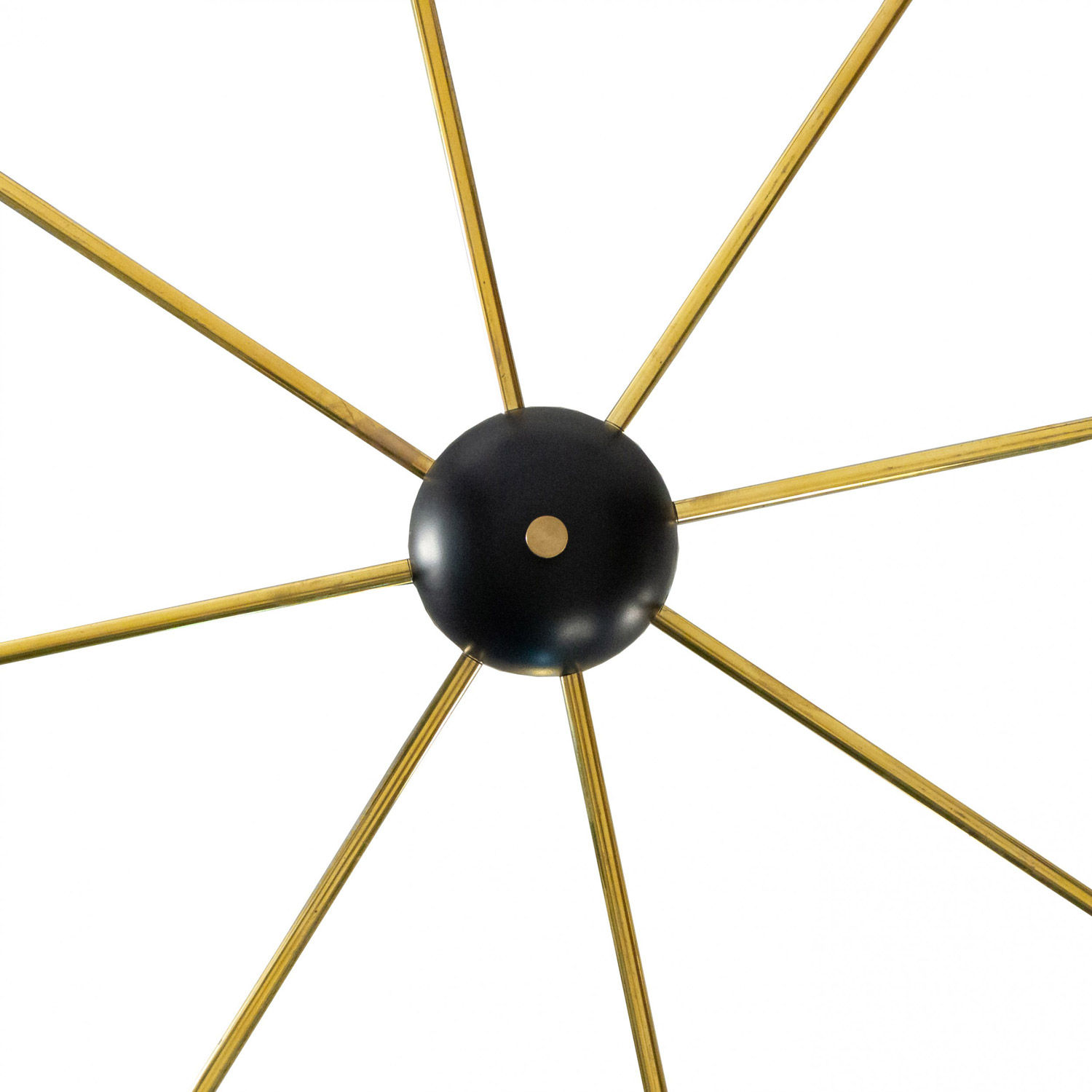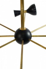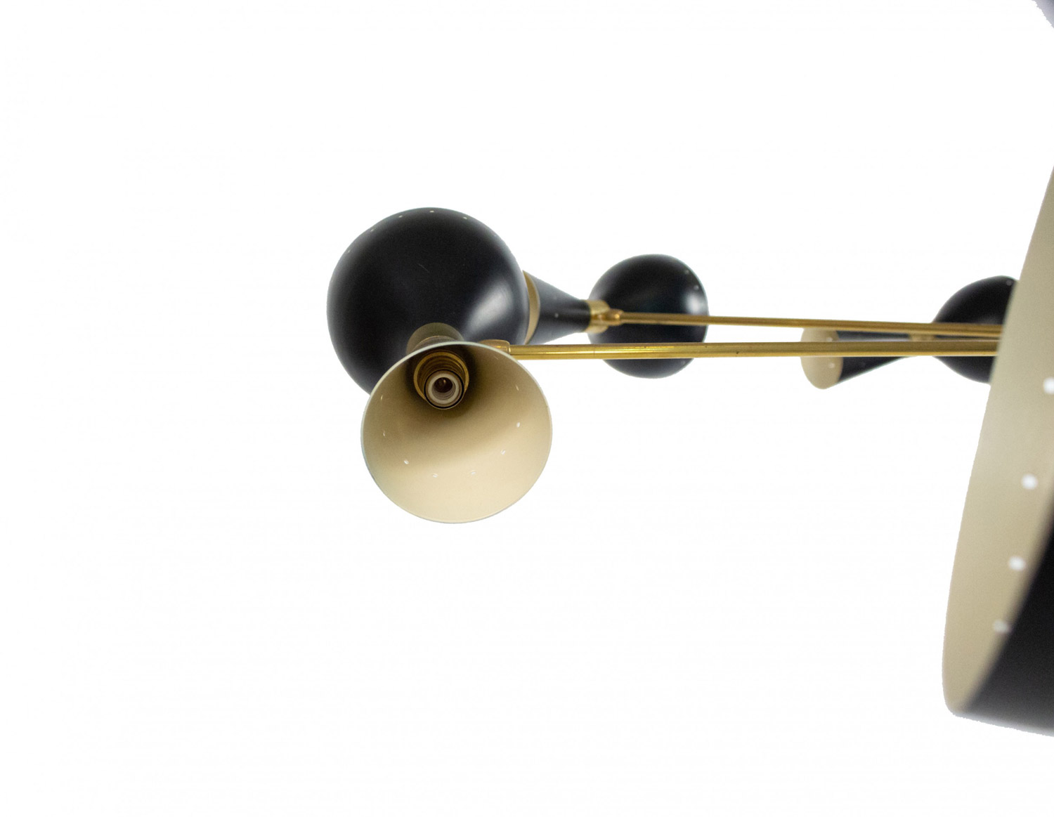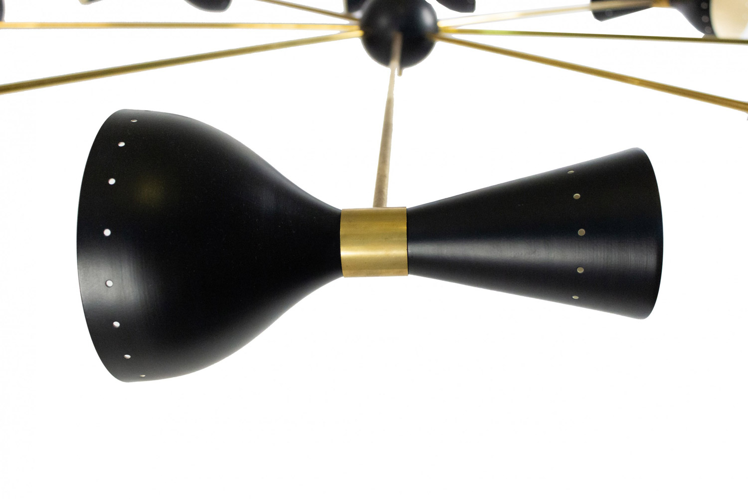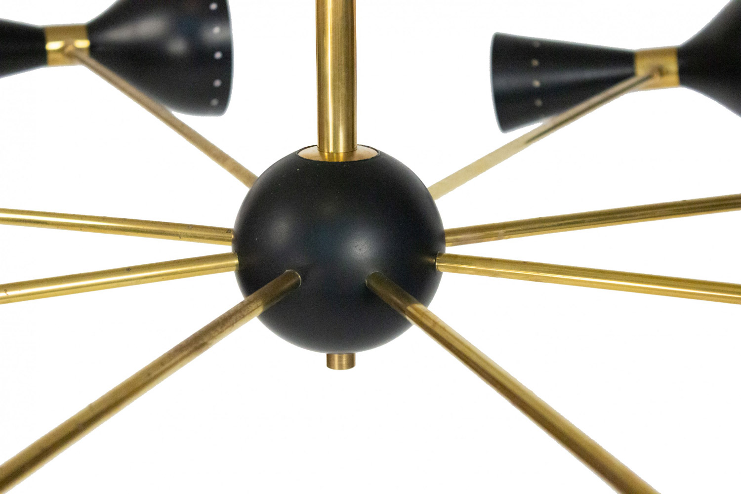 Italian Mid-Century "STILNOVO" Diabolo-style chandelier with 12 double light shades with black matte finish suspended on gilt metal rods that converge in a black metal ball spoke (GINO SARFATTI)