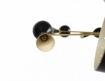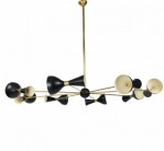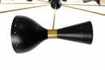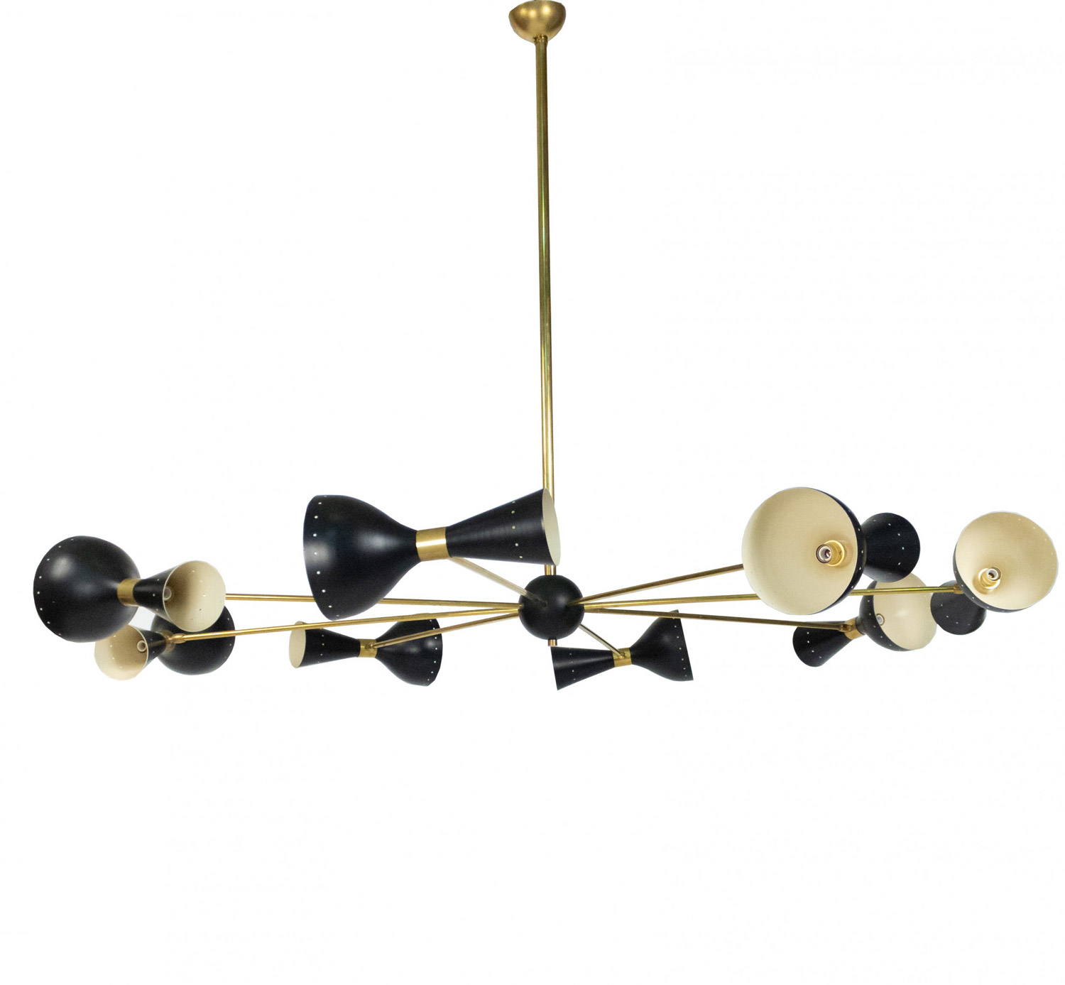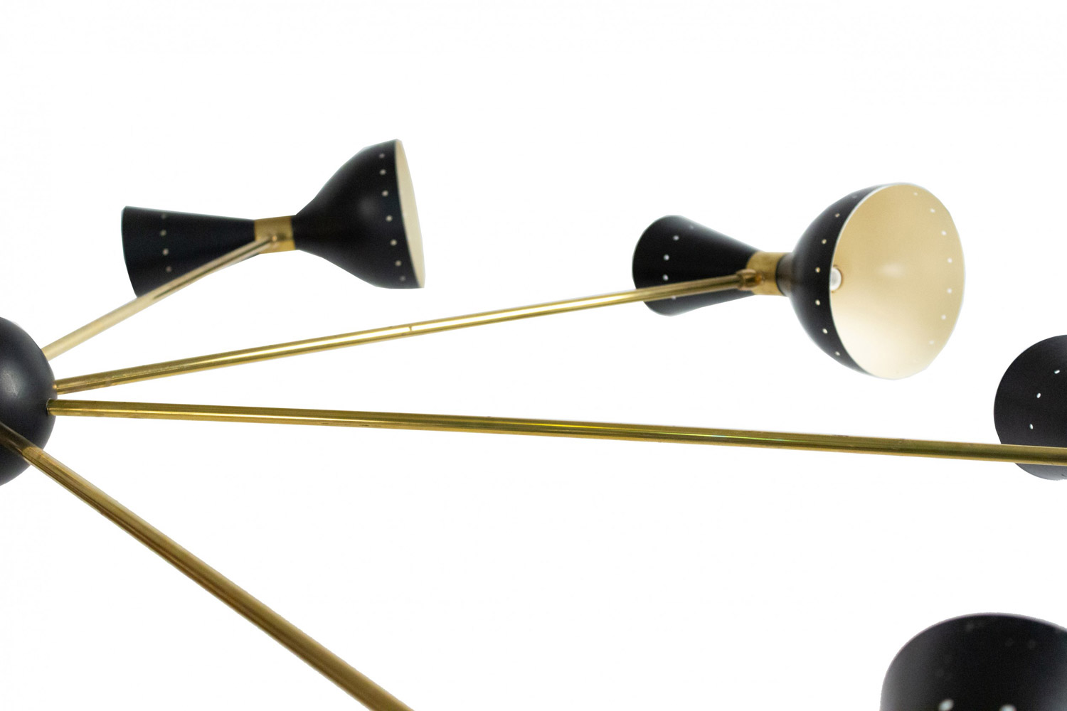 Italian Mid-Century "STILNOVO" Diabolo-style chandelier with 12 double light shades with black matte finish suspended on gilt metal rods that converge in a black metal ball spoke (GINO SARFATTI).