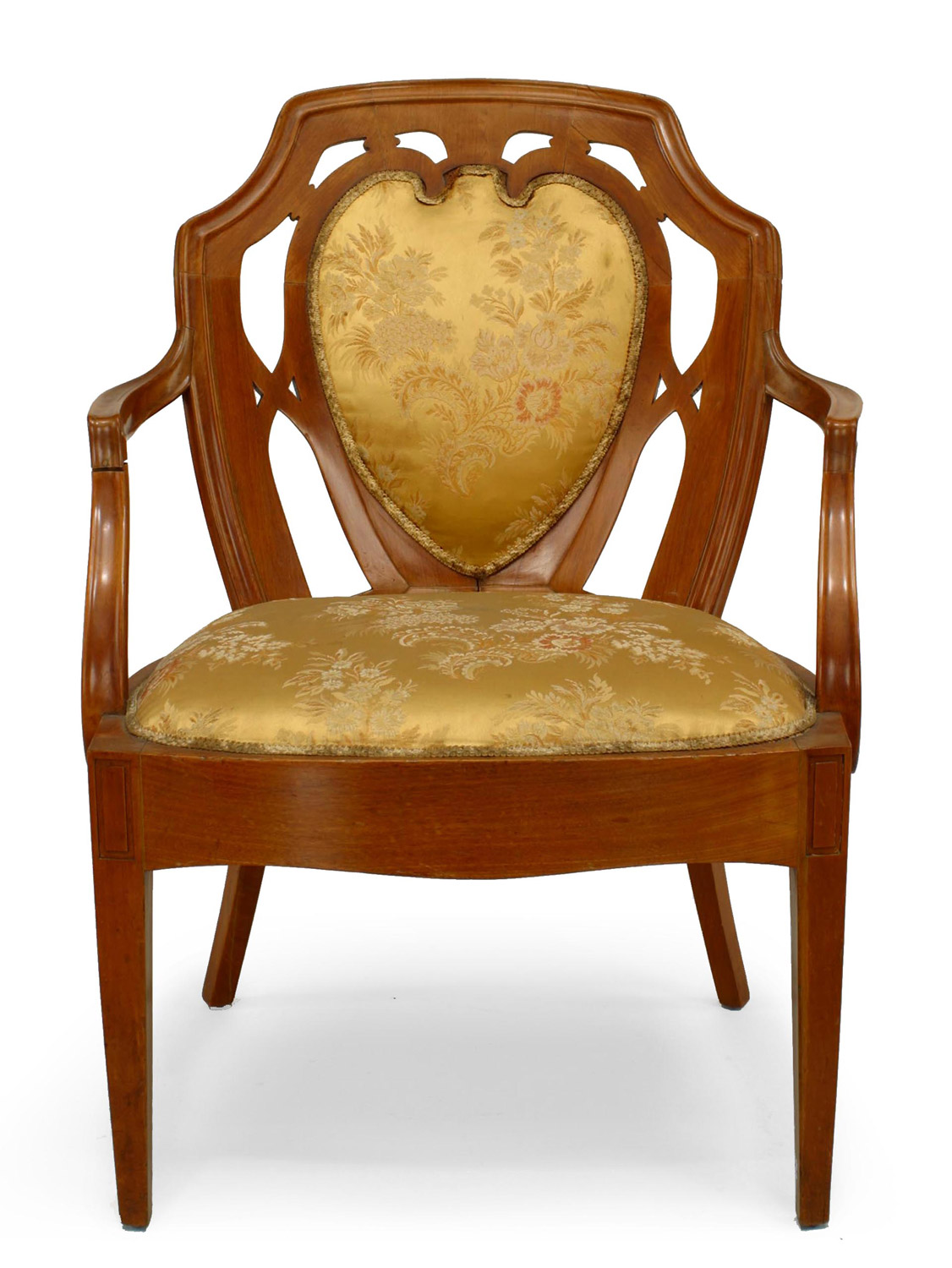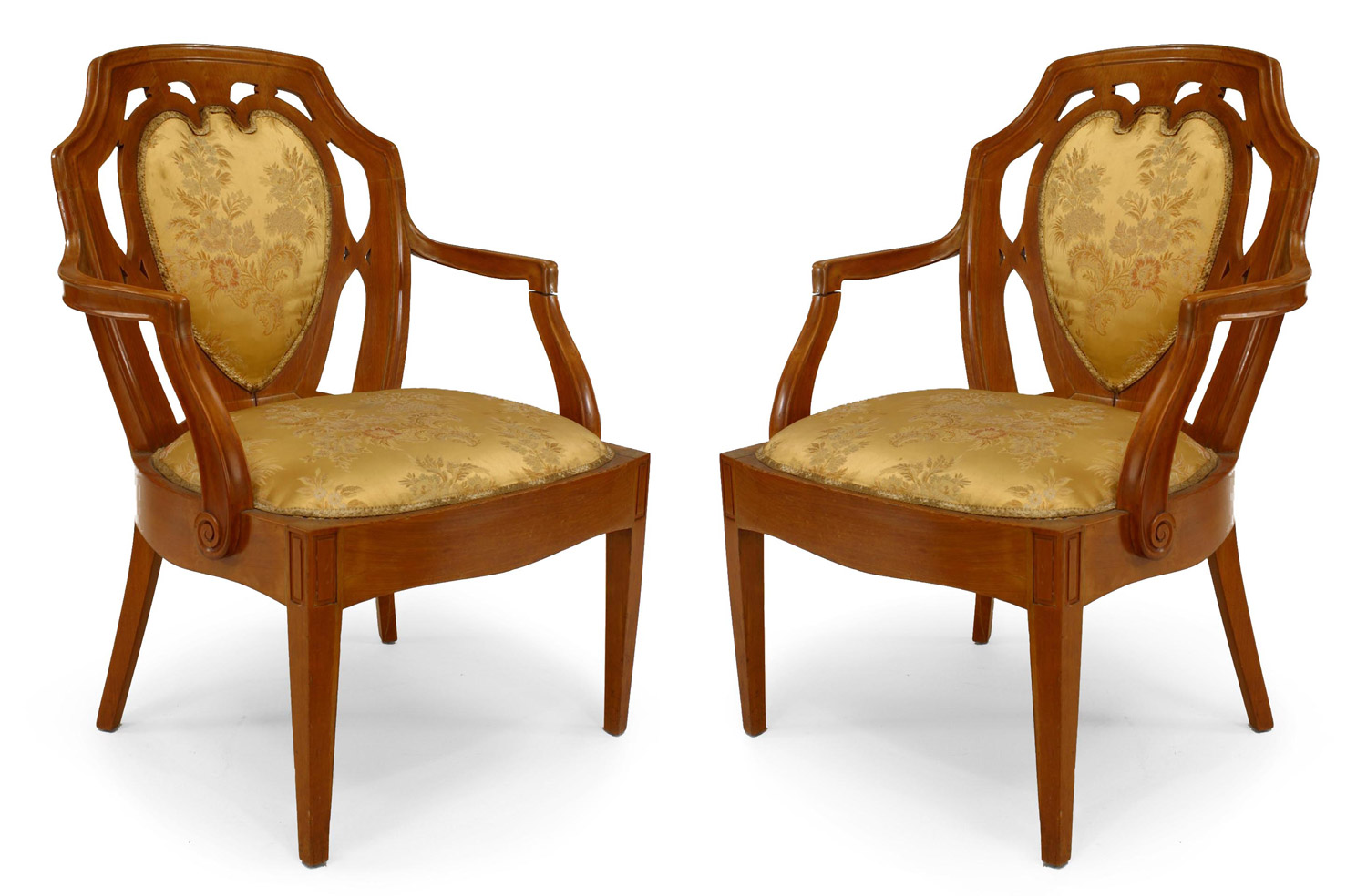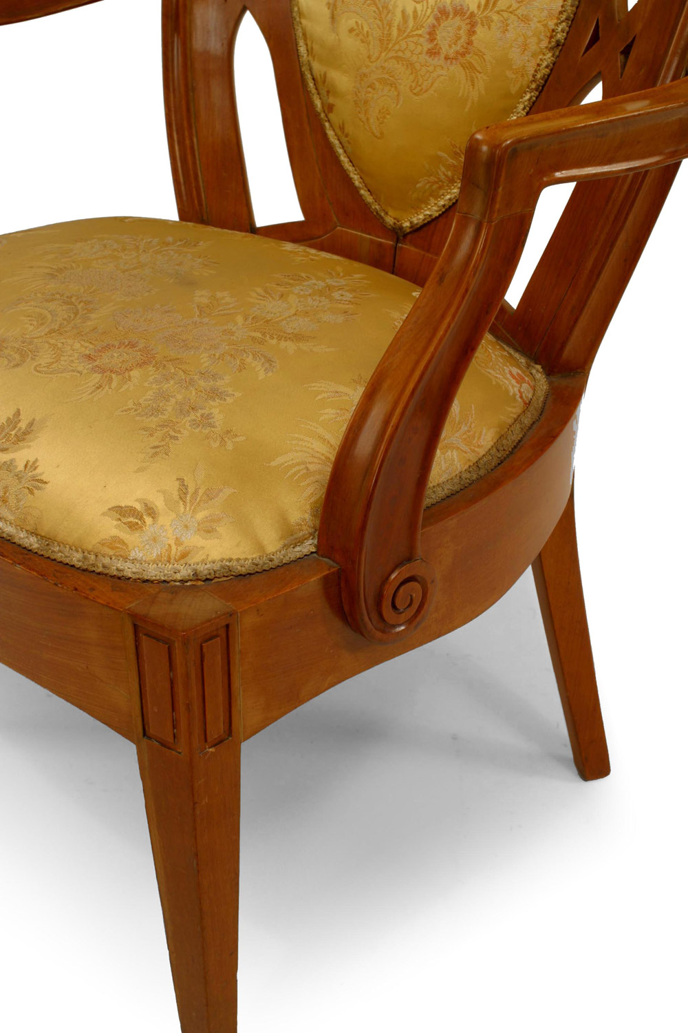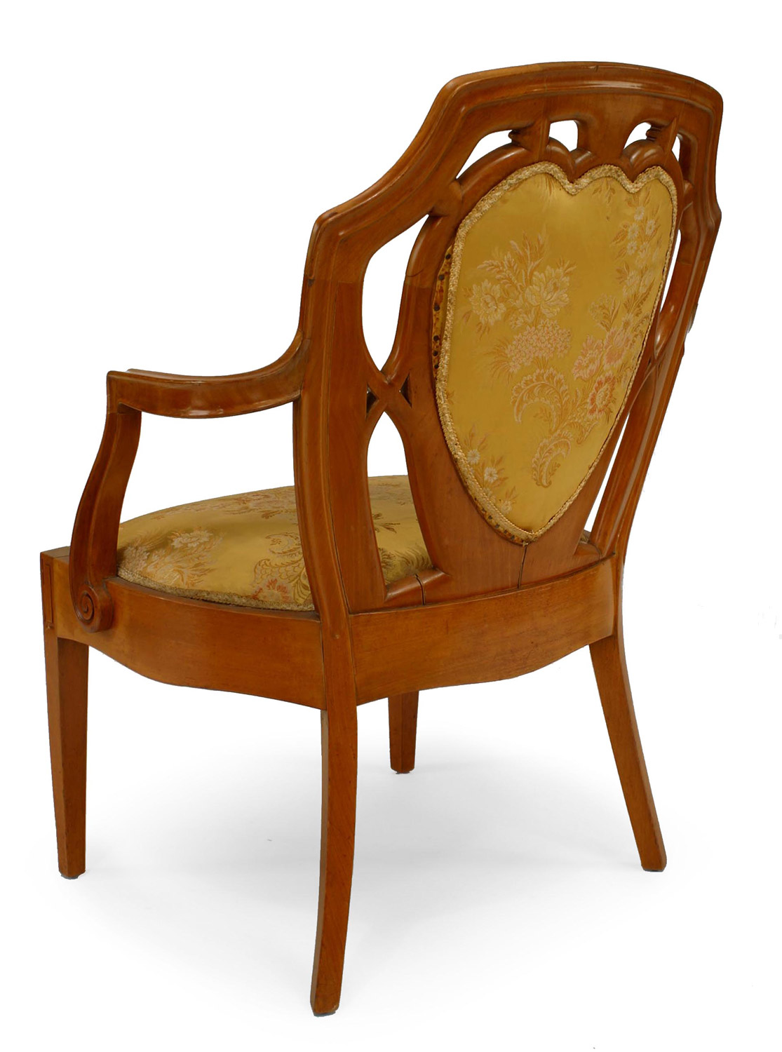 SET of 4 Swedish Biedermeier style (20th Cent) cherrywood arm chairs with filigree heart shaped back and gold floral upholstery.