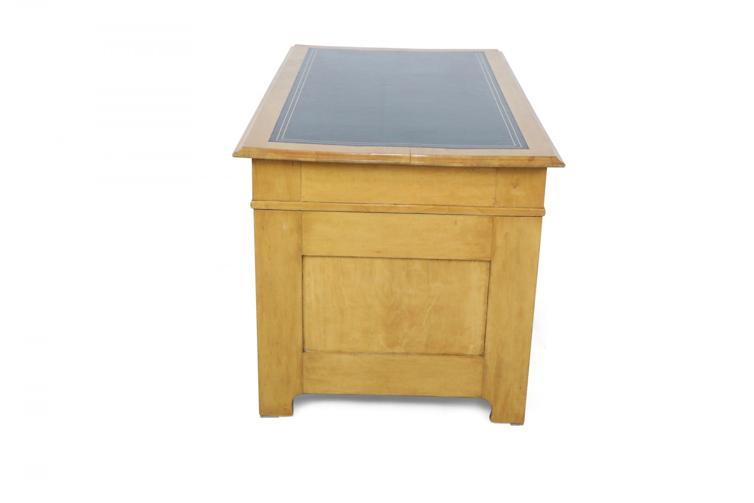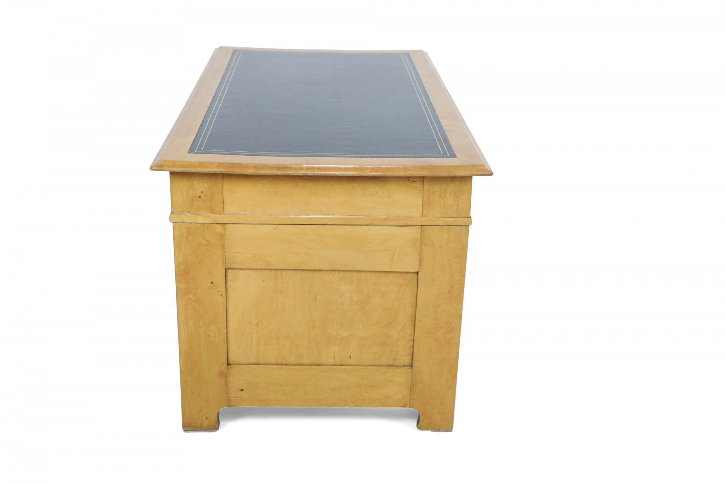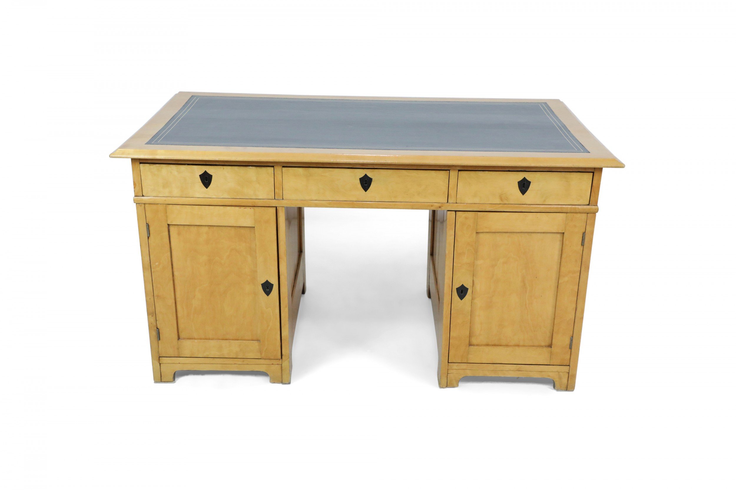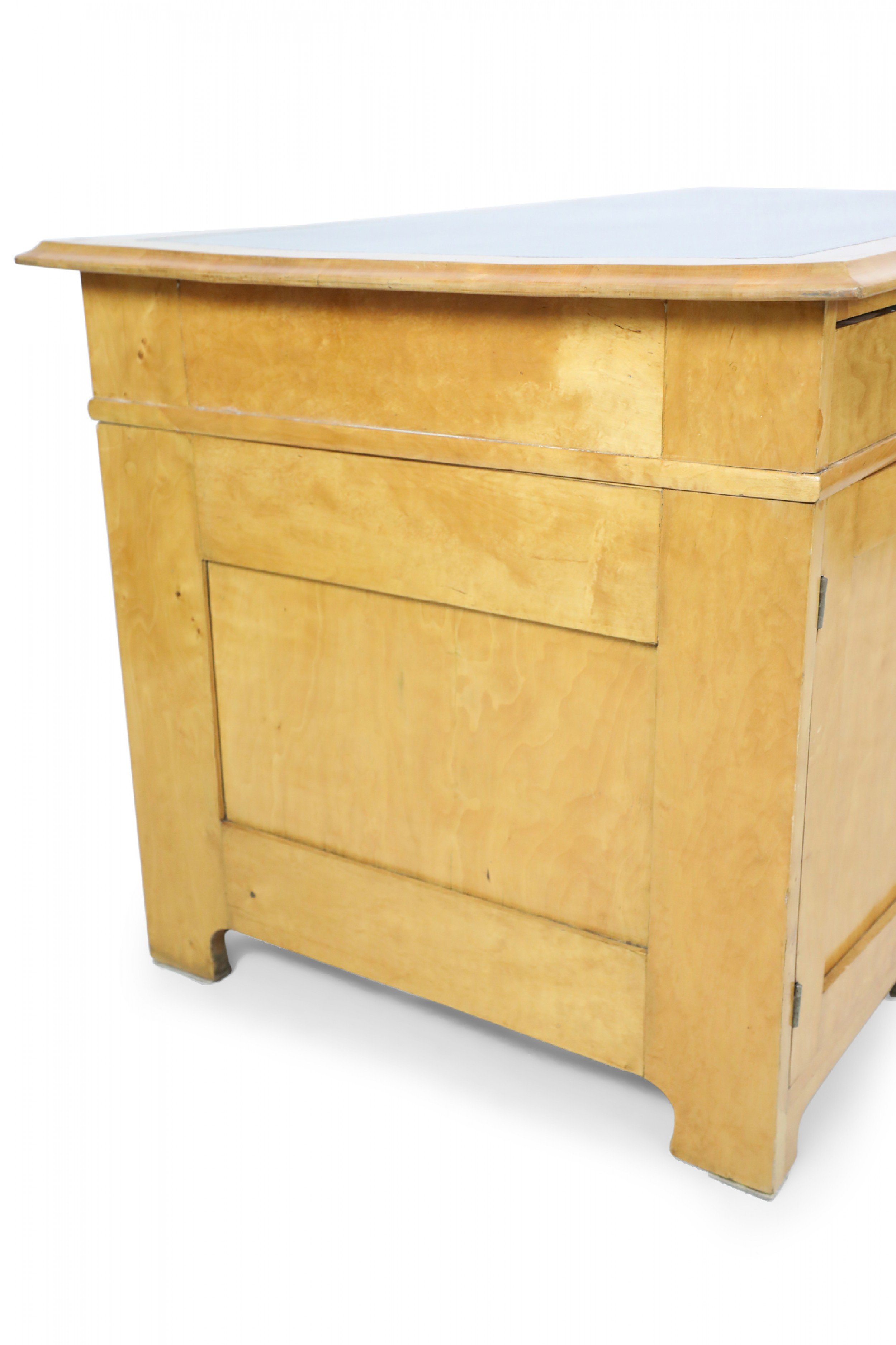 Swedish Biedermeier style (19/20th Century) birch kneehole desk with three drawer above two cabinet doors enclosed 4 drawers with a gold embossed black leather top..