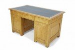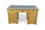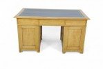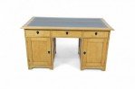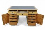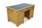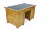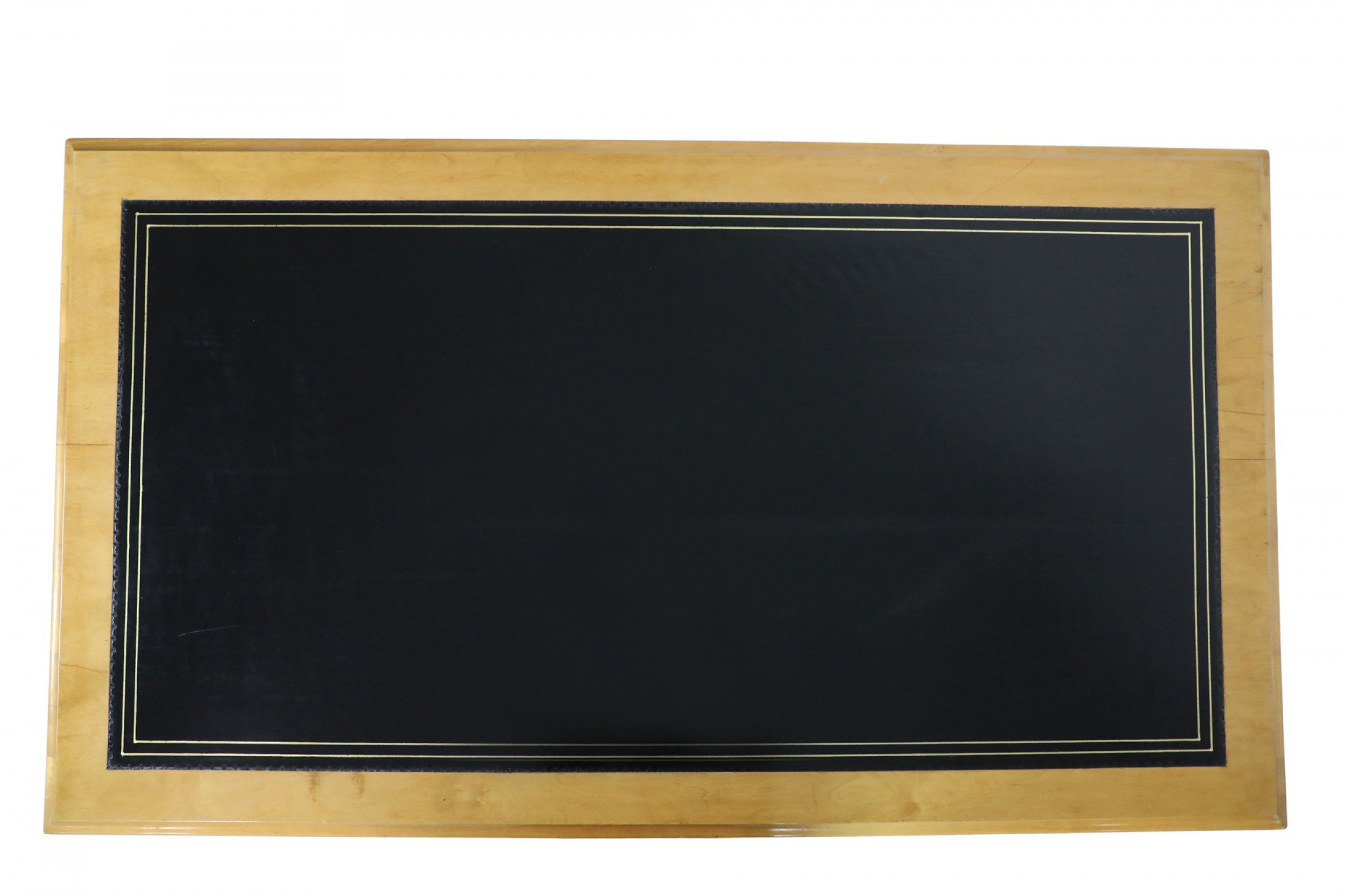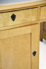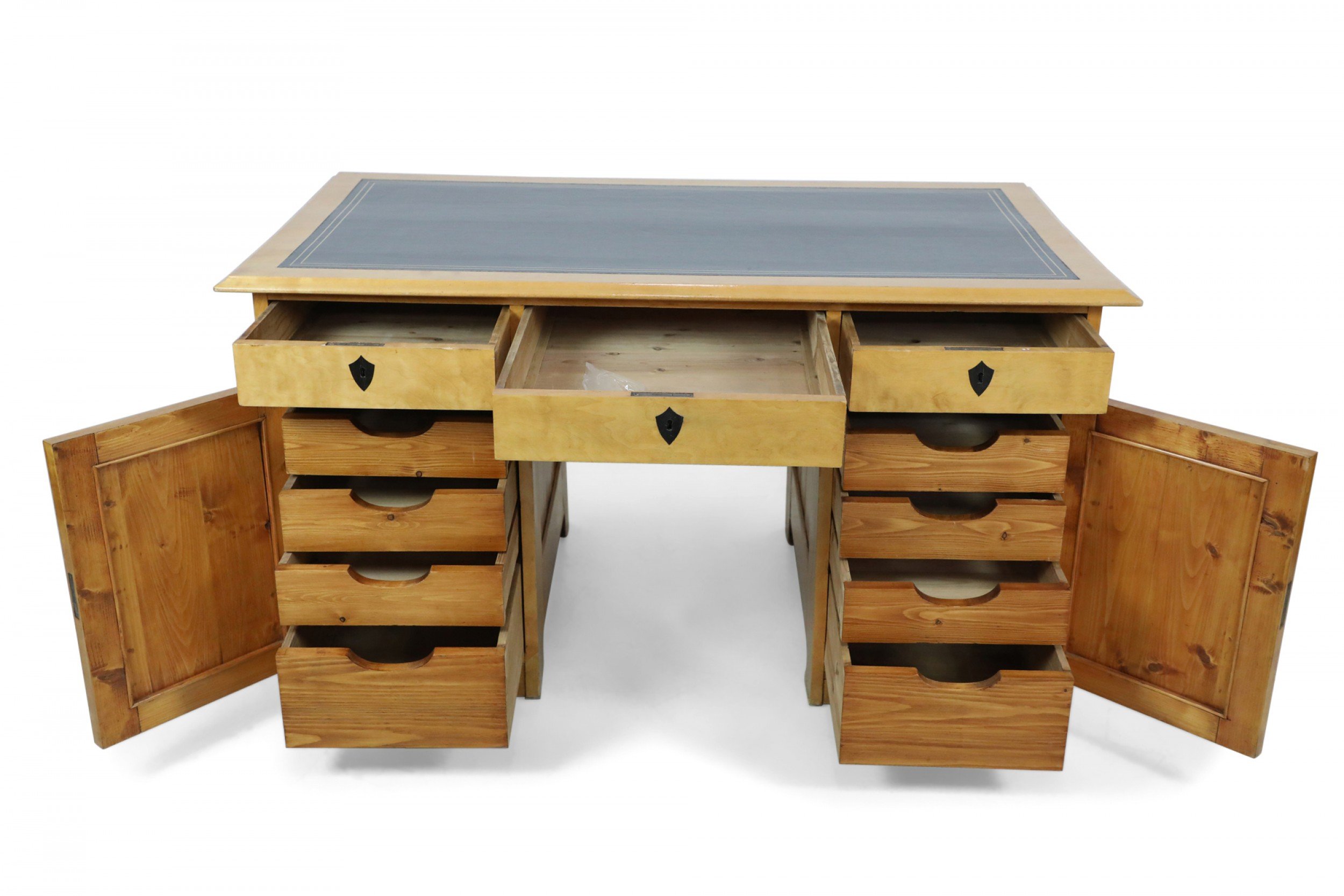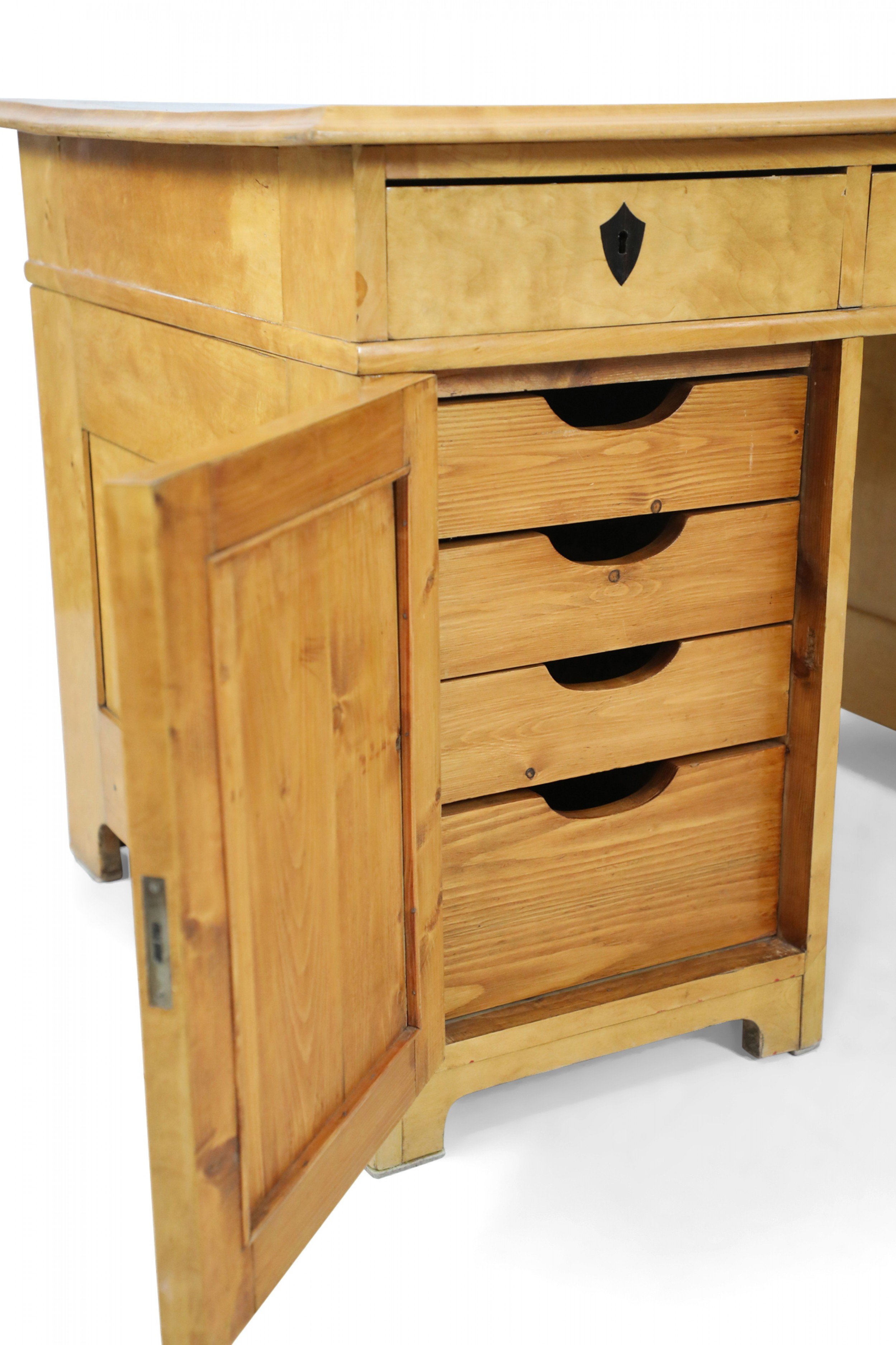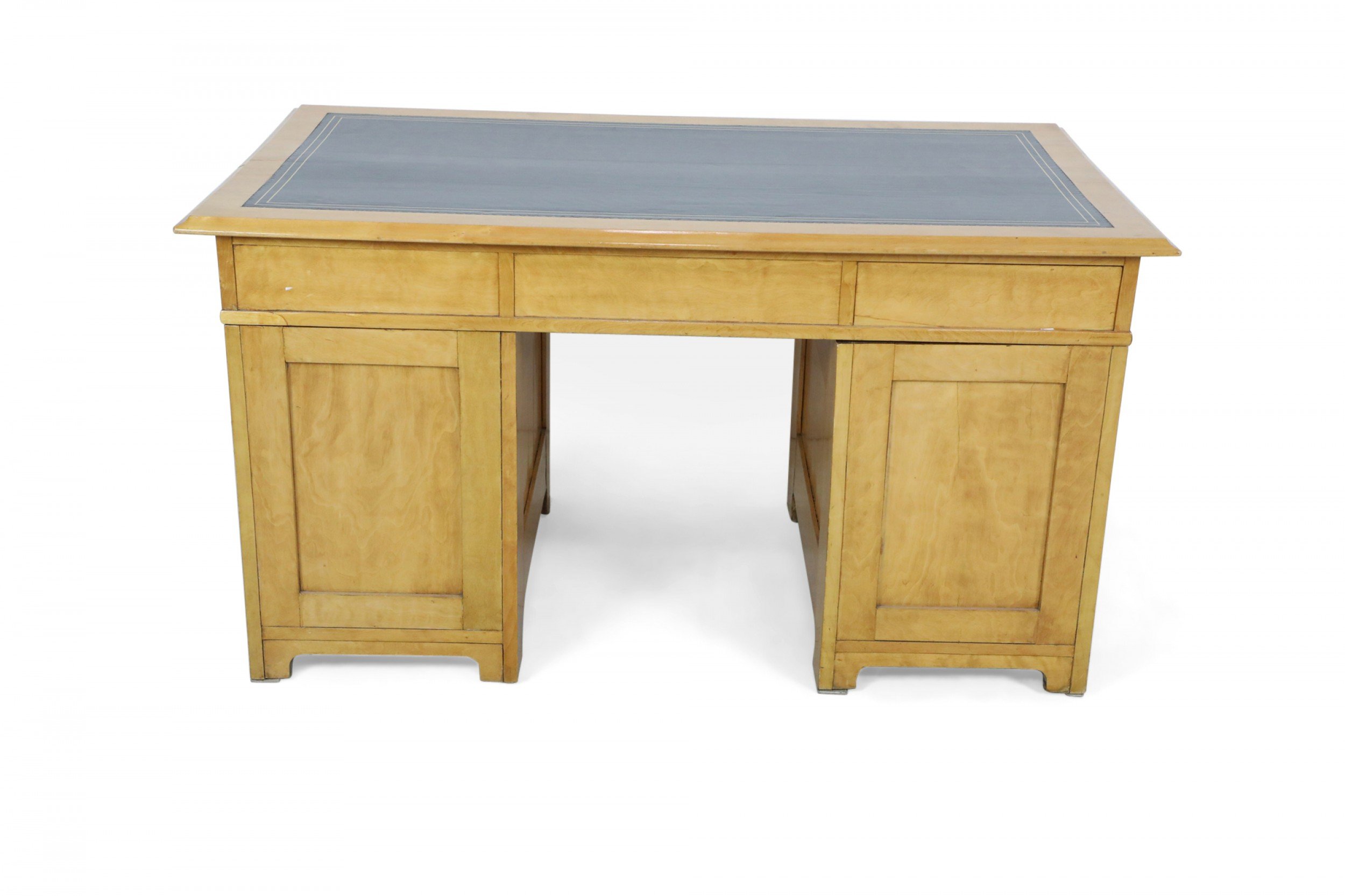 Swedish Biedermeier style (19/20th Century) birch kneehole desk with three drawer above two cabinet doors enclosed 4 drawers with a gold embossed black leather top..
