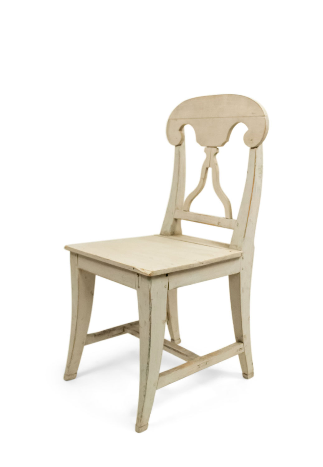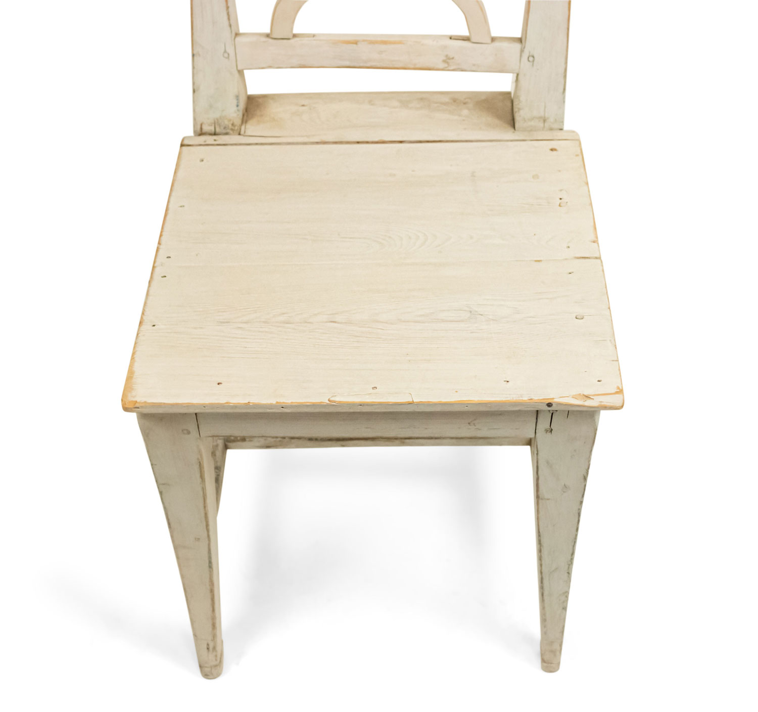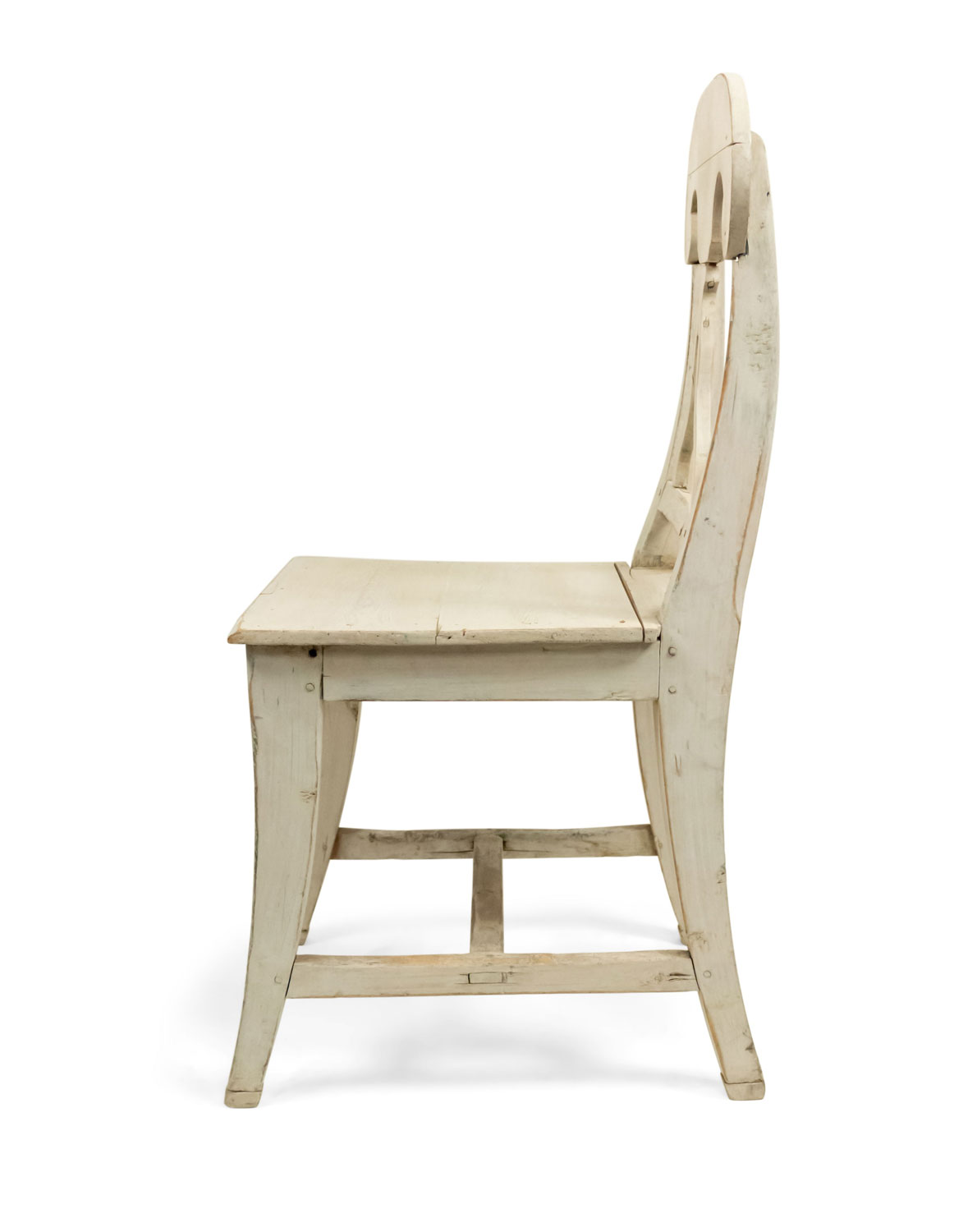 SET of 6 Swedish Gustavian mid century side chairs with an antique white painted finish and an open back design.