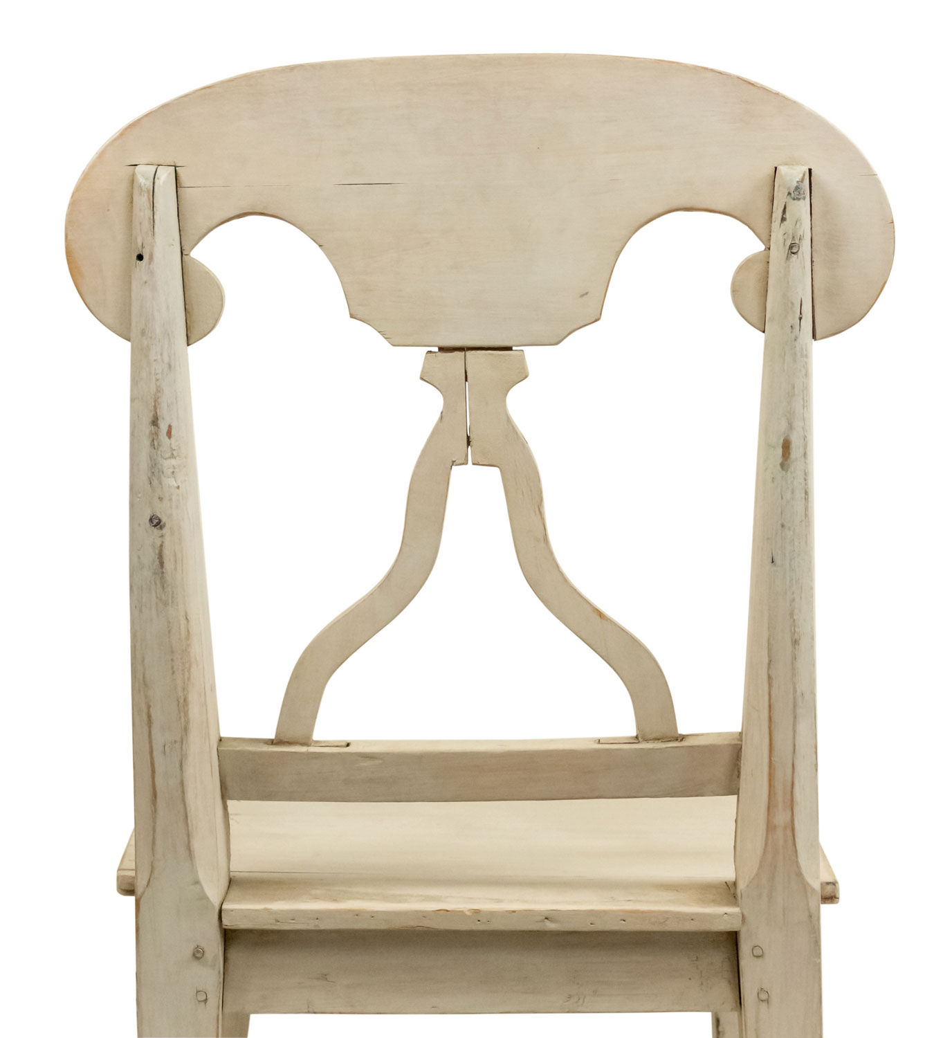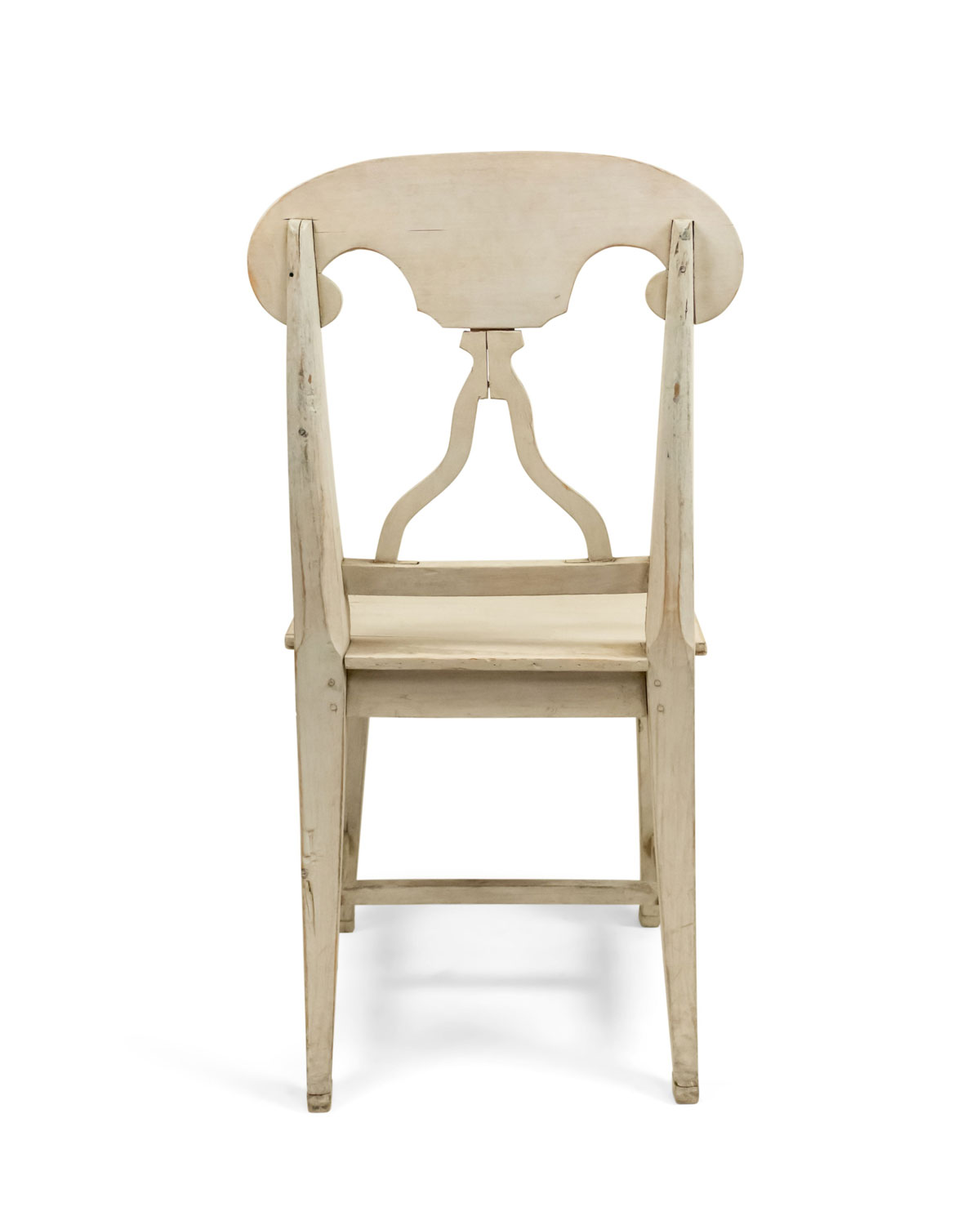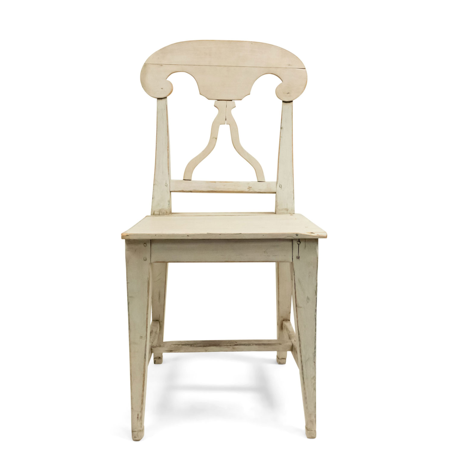 SET of 6 Swedish Gustavian mid century side chairs with an antique white painted finish and an open back design