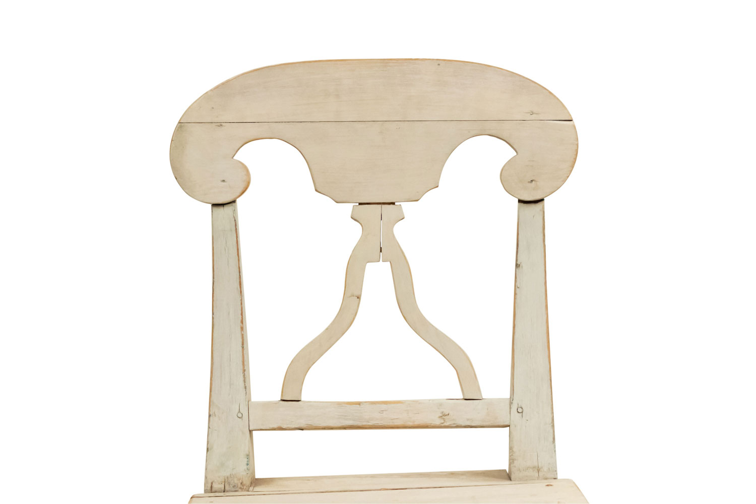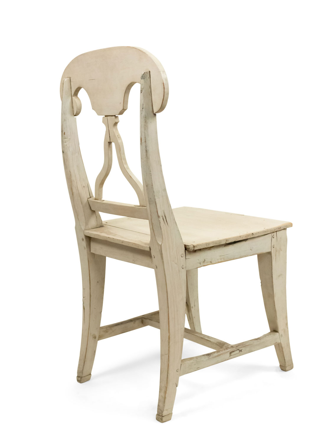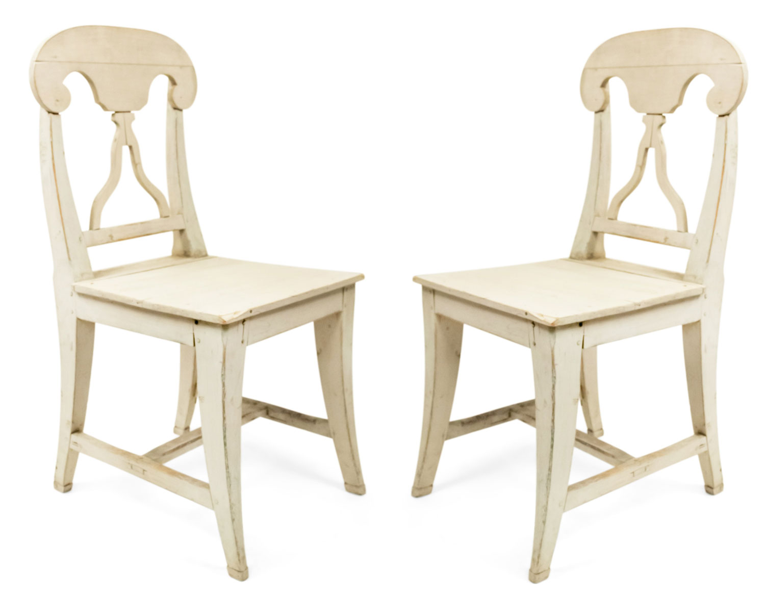 SET of 6 Swedish Gustavian mid century side chairs with an antique white painted finish and an open back design