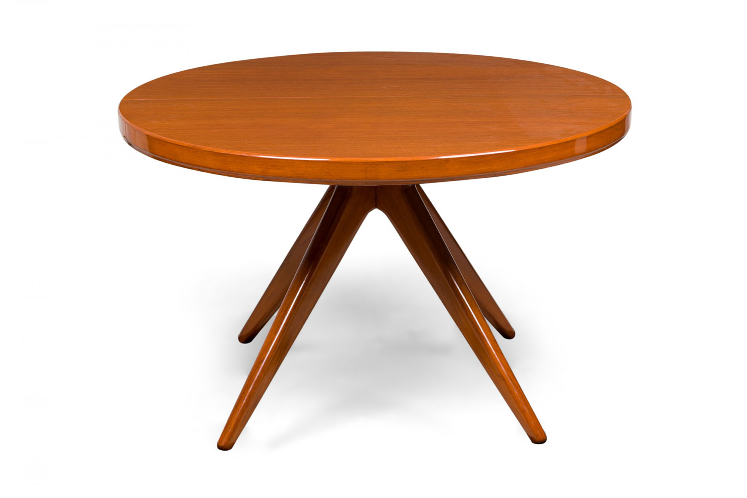 Swedish Mid-Century Modern circular extension dining / center table with two removable leaves, resting on four center-mounted tapered wooden legs. (attributed to ERNO FABRY)