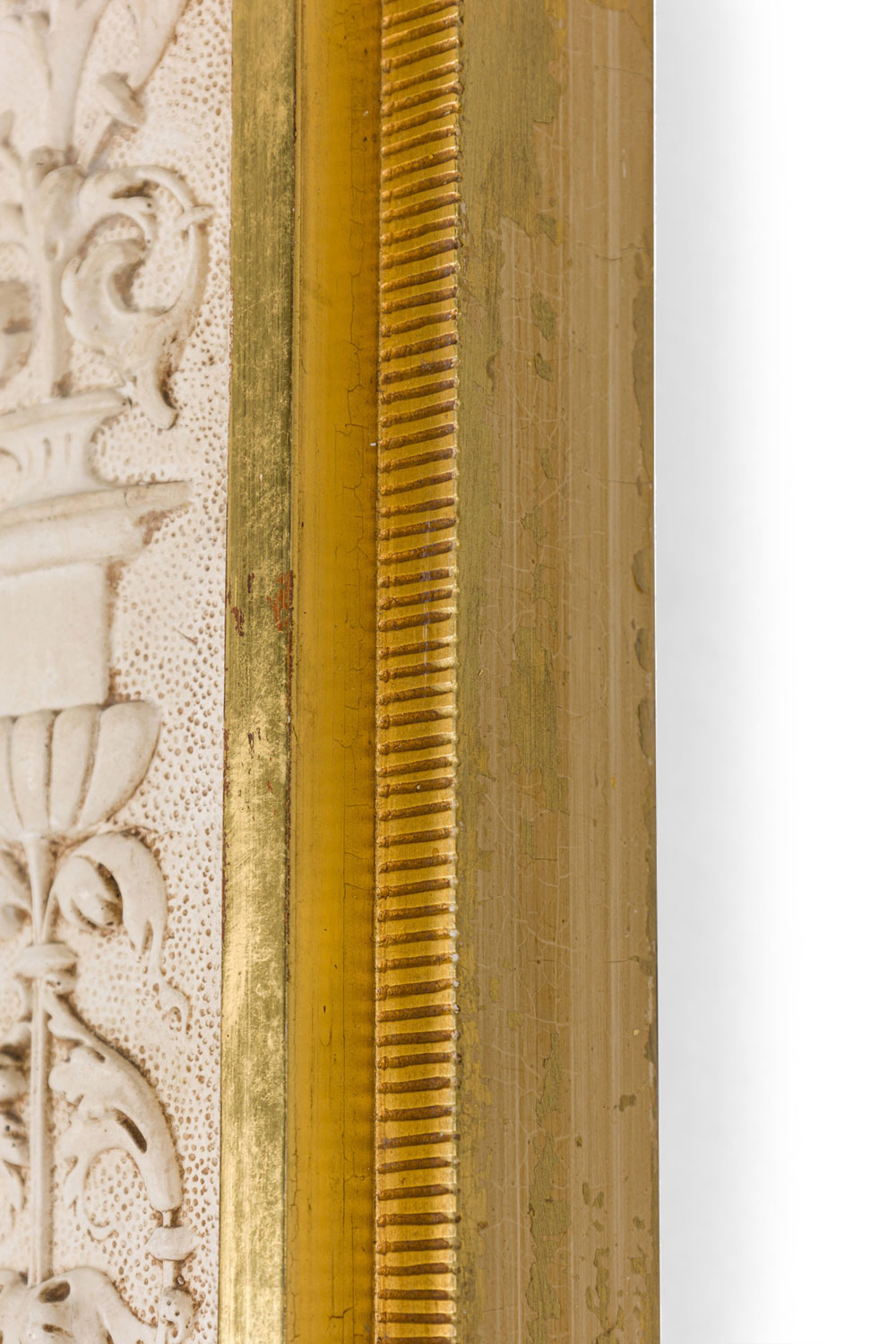 Swedish Neo-Classic (19th Century) monumental wall mirror with a carved columnar design, parcel gilt and painted in a cream finish..