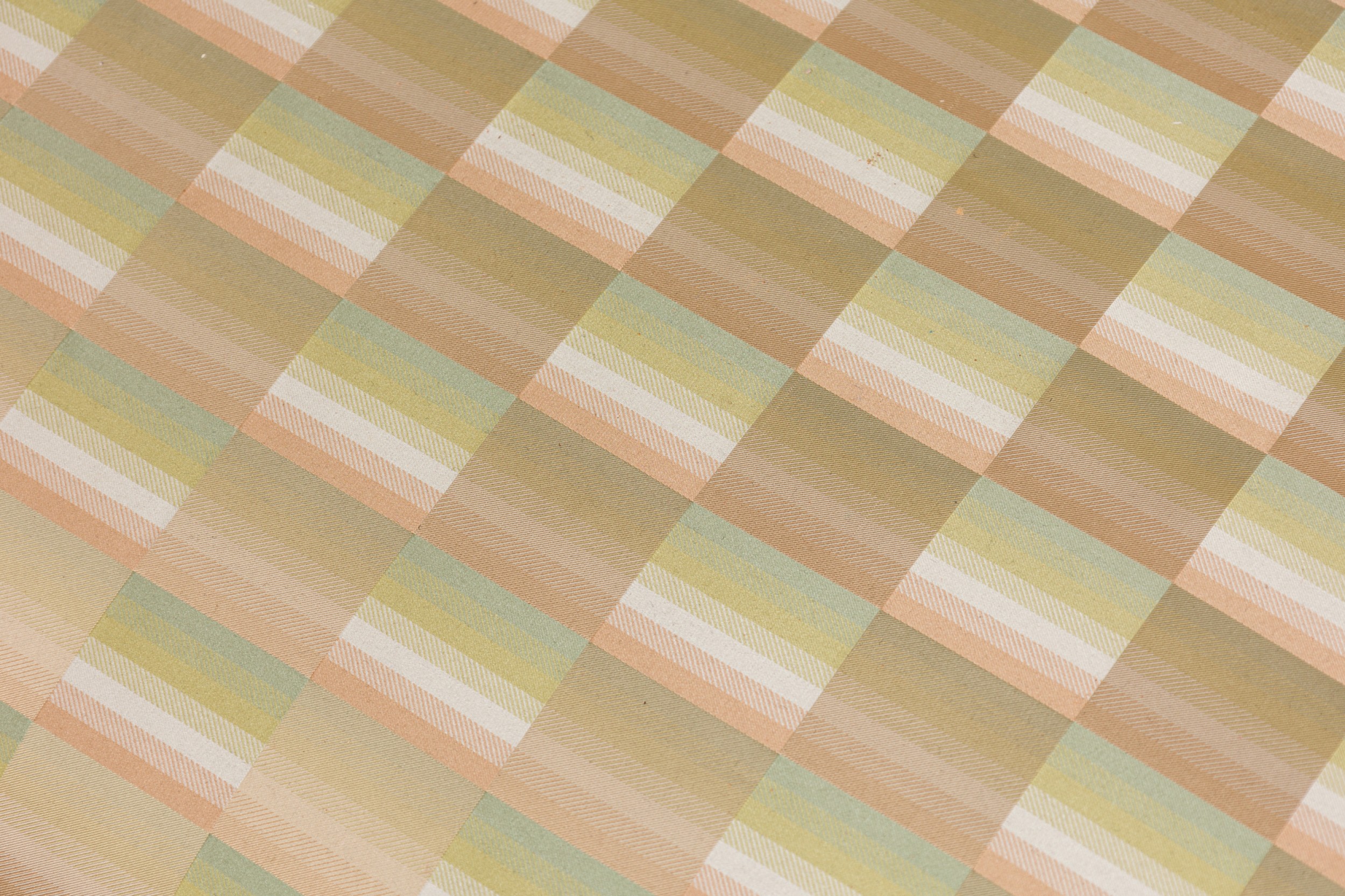 Swedish Neo-Classical settee with a carved wooden frame, painted white and parcel silver gilt, with decorative silver giltwood foliate carvings and rosettes, the seat and back upholstered in a checkered sage green and beige striped and checkered fabric.