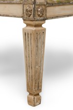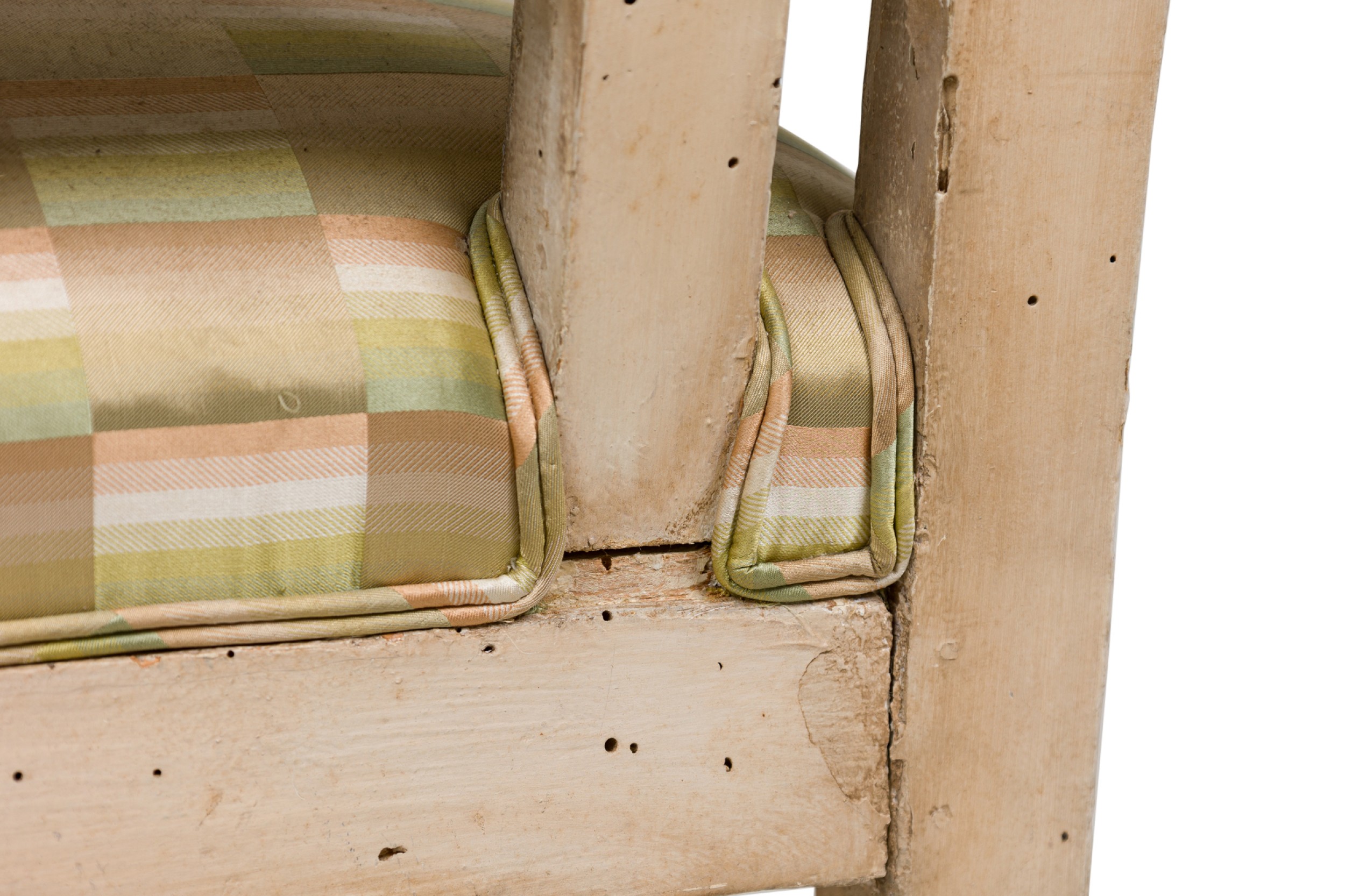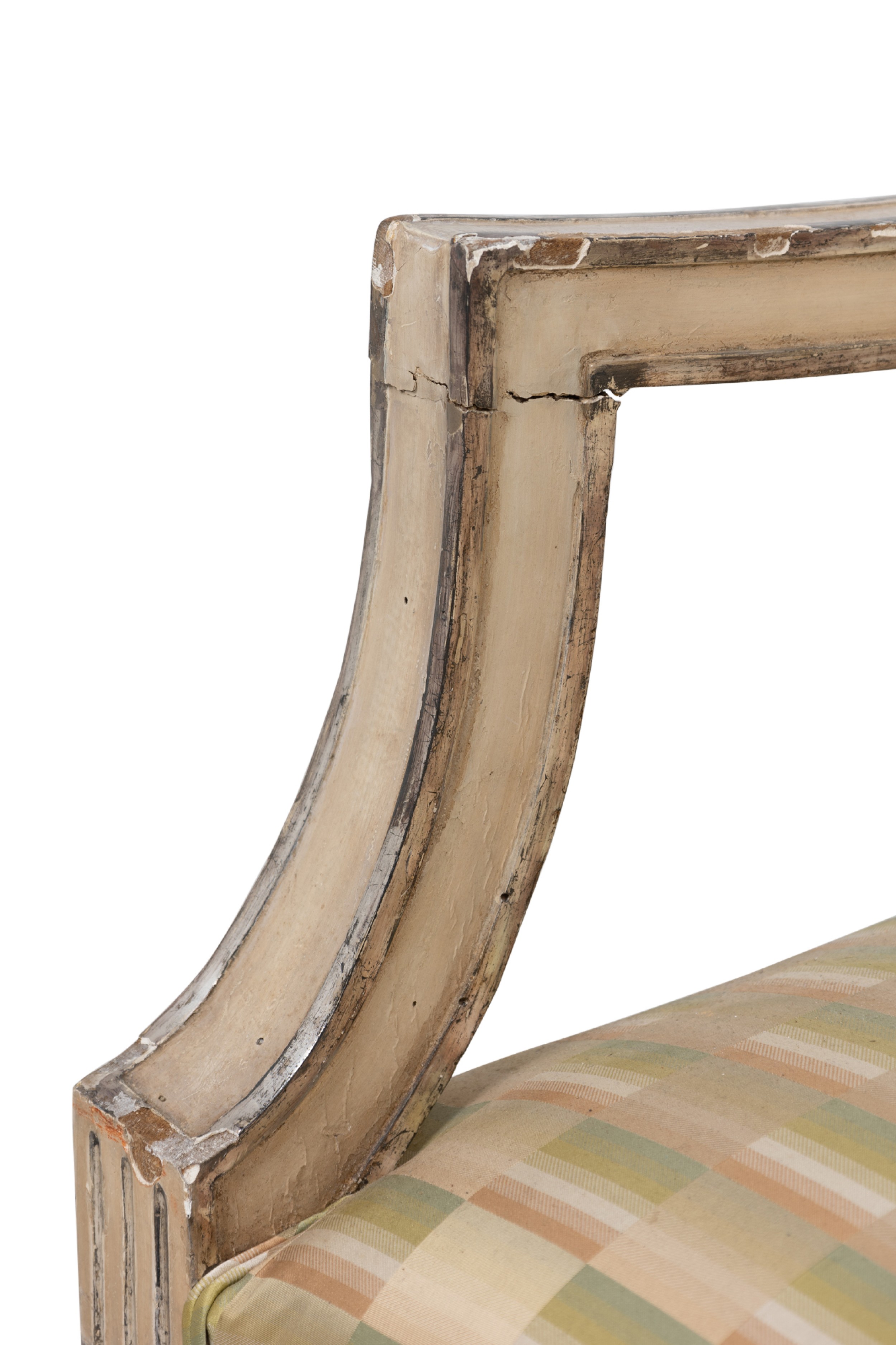 Style: Continental Materials & Techniques: Fabric, gilt / giltwood, painted, upholstered, wood Category: Seating Condition: Two center front legs repaired, losses to silver gilding and painted finish, recently reupholstered. Fair; Minor structural damages