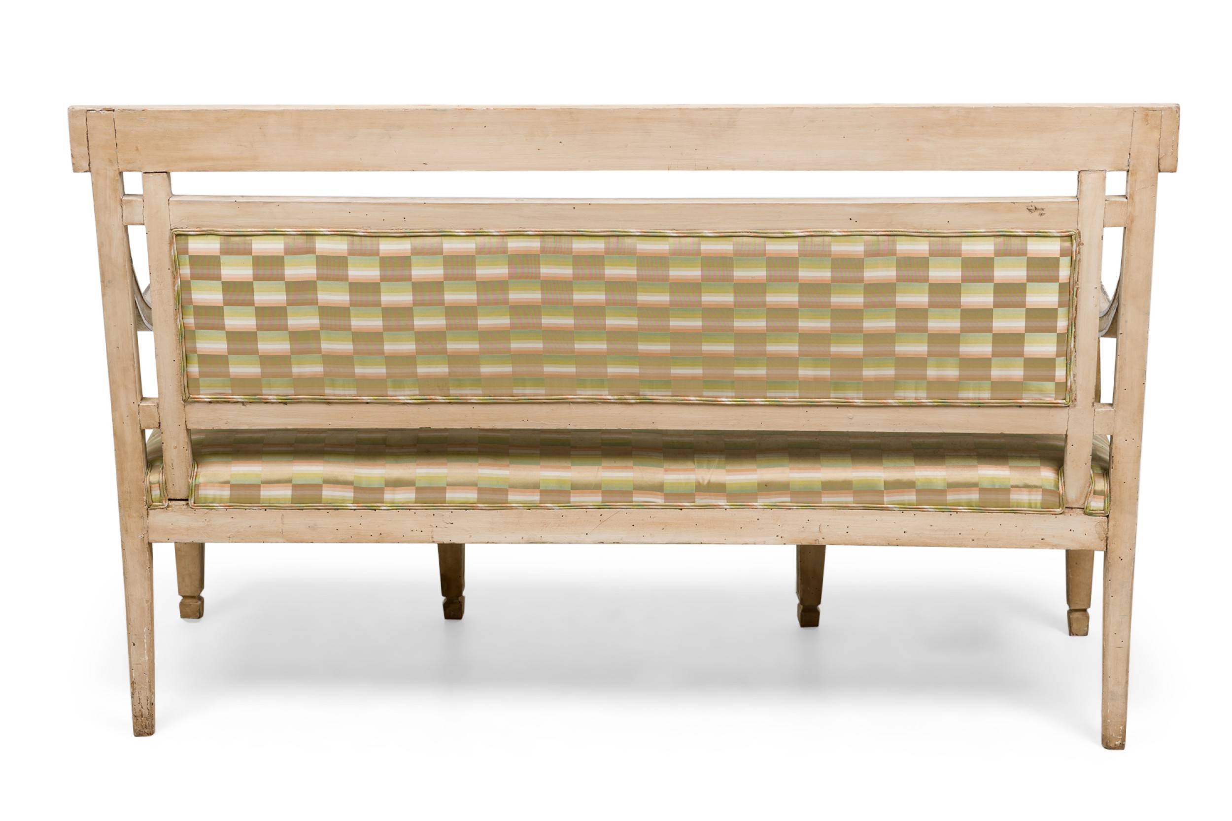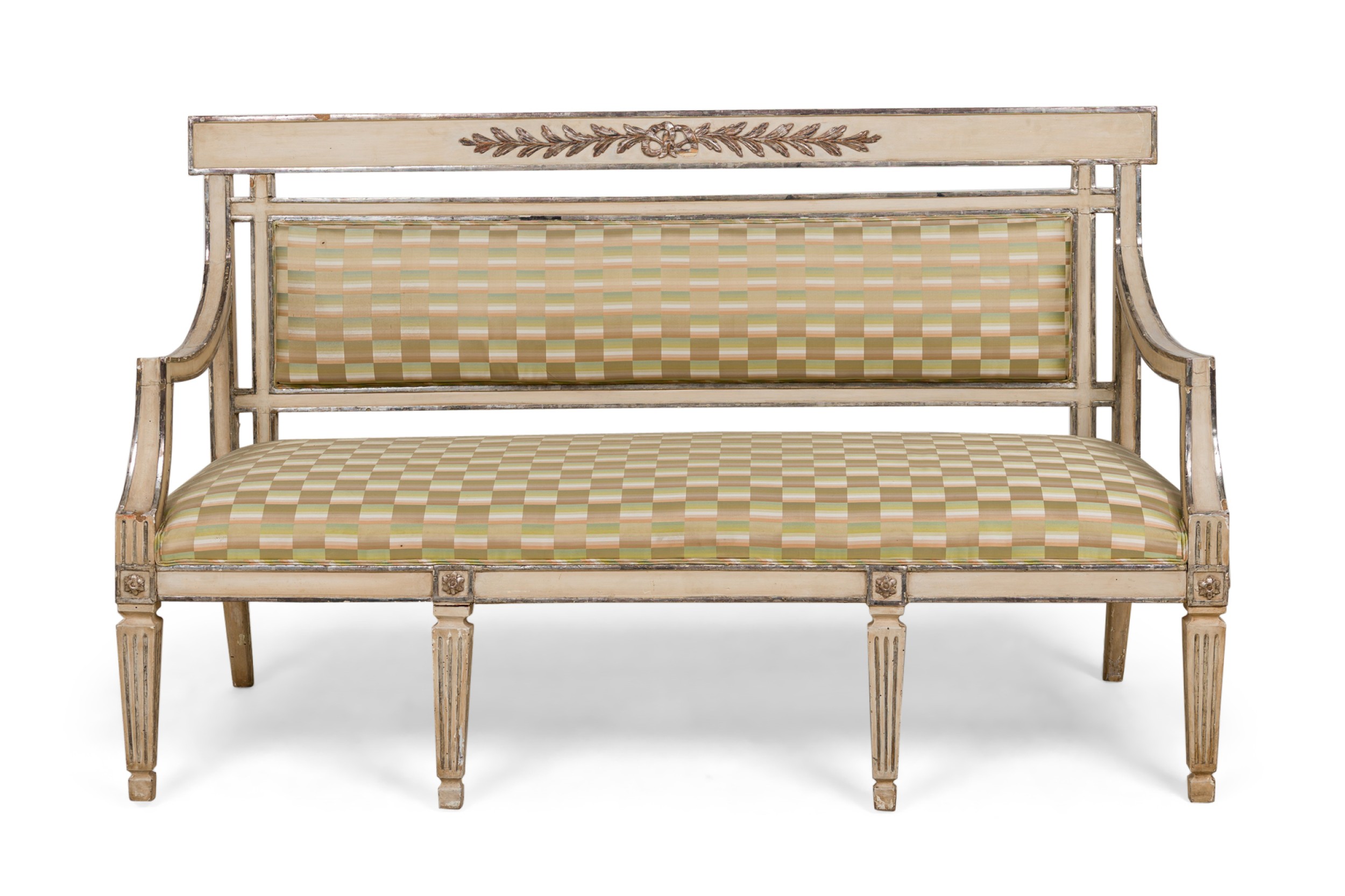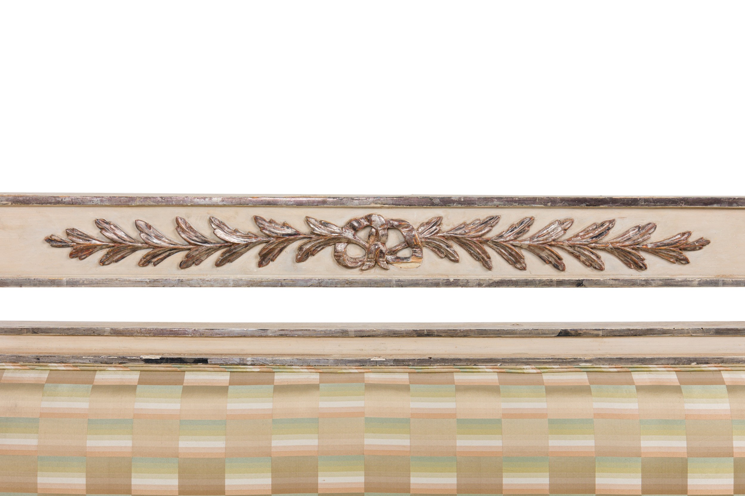Swedish Neo-Classical settee with a carved wooden frame, painted white and parcel silver gilt, with decorative silver giltwood foliate carvings and rosettes, the seat and back upholstered in a checkered sage green and beige striped and checkered fabric..