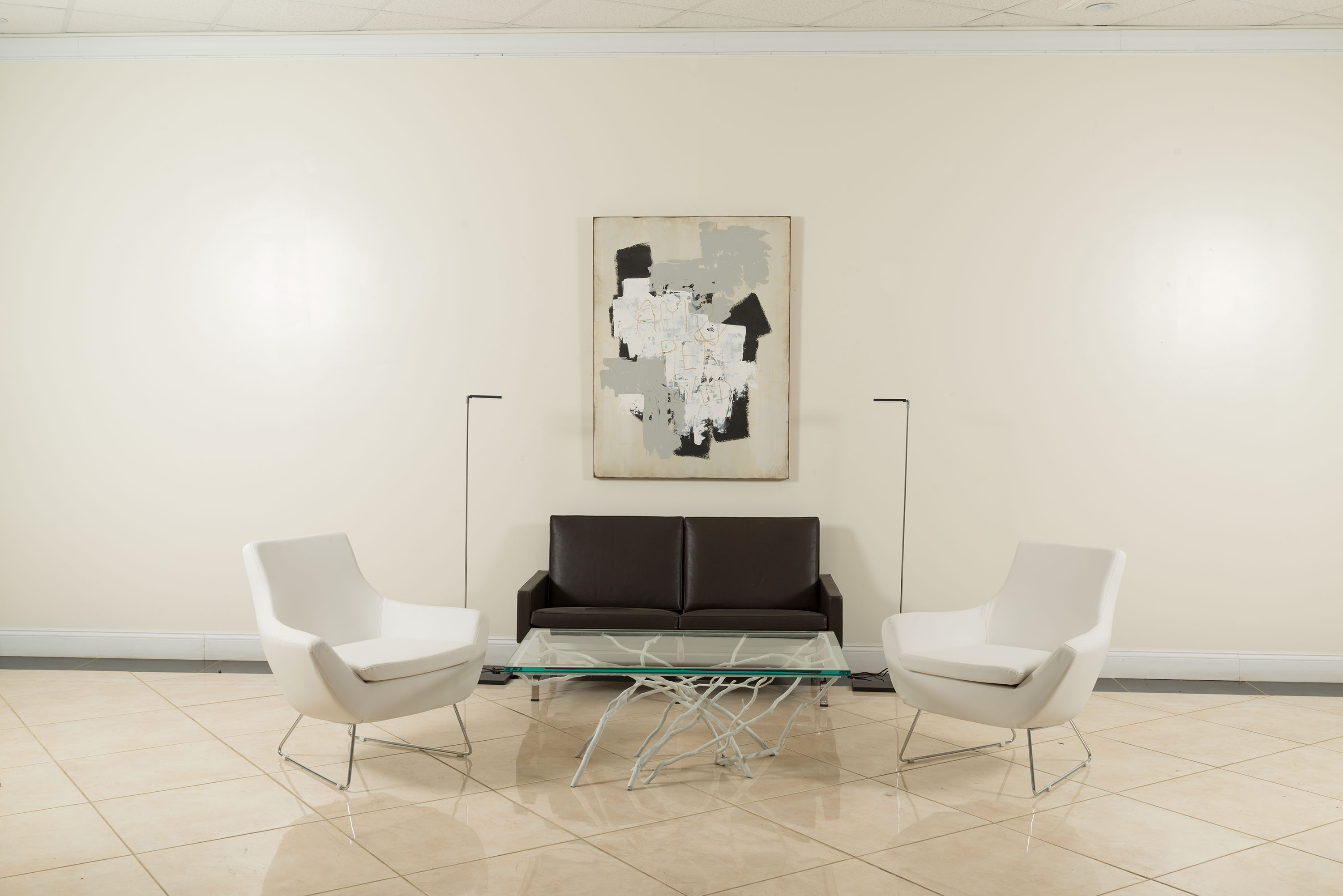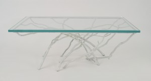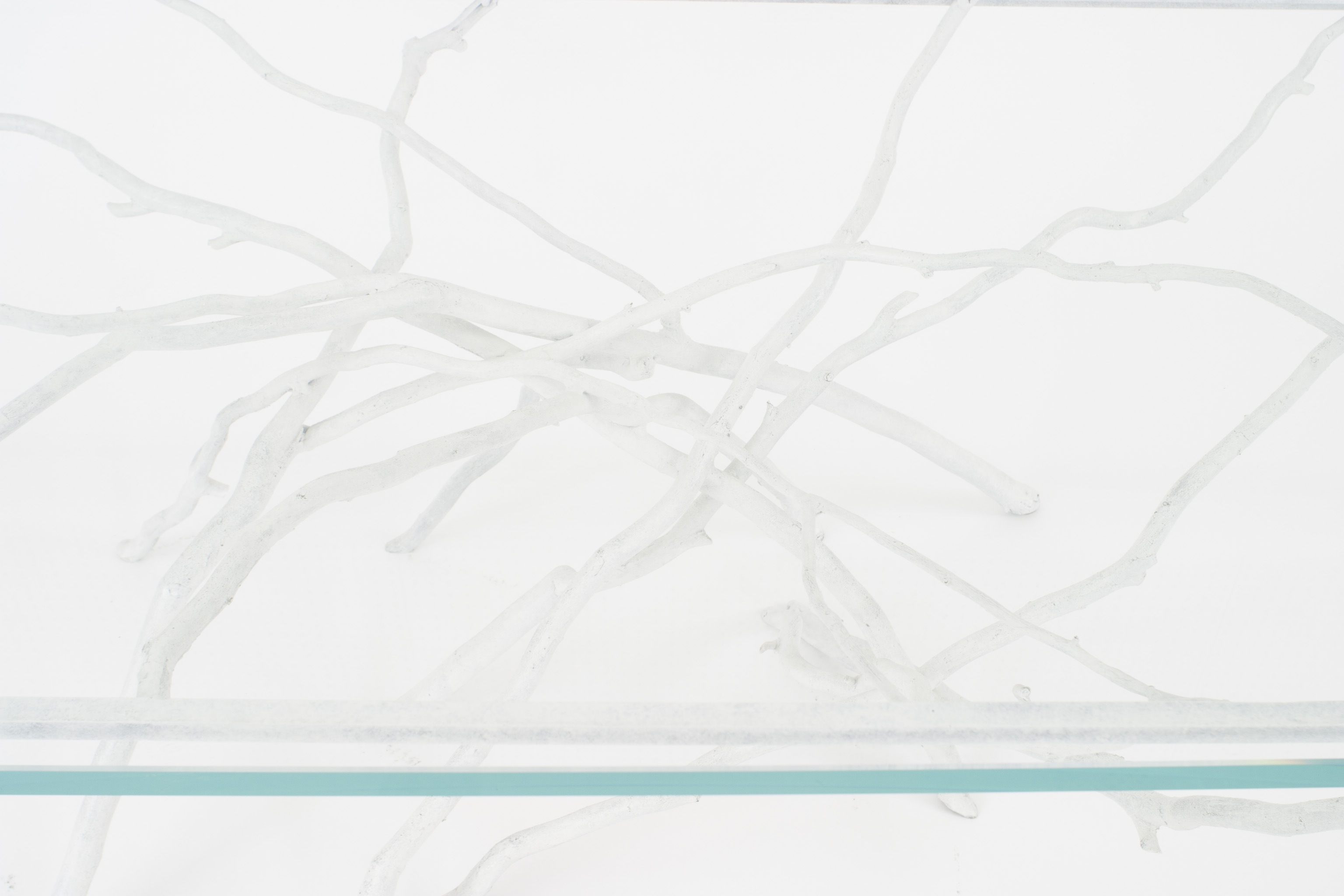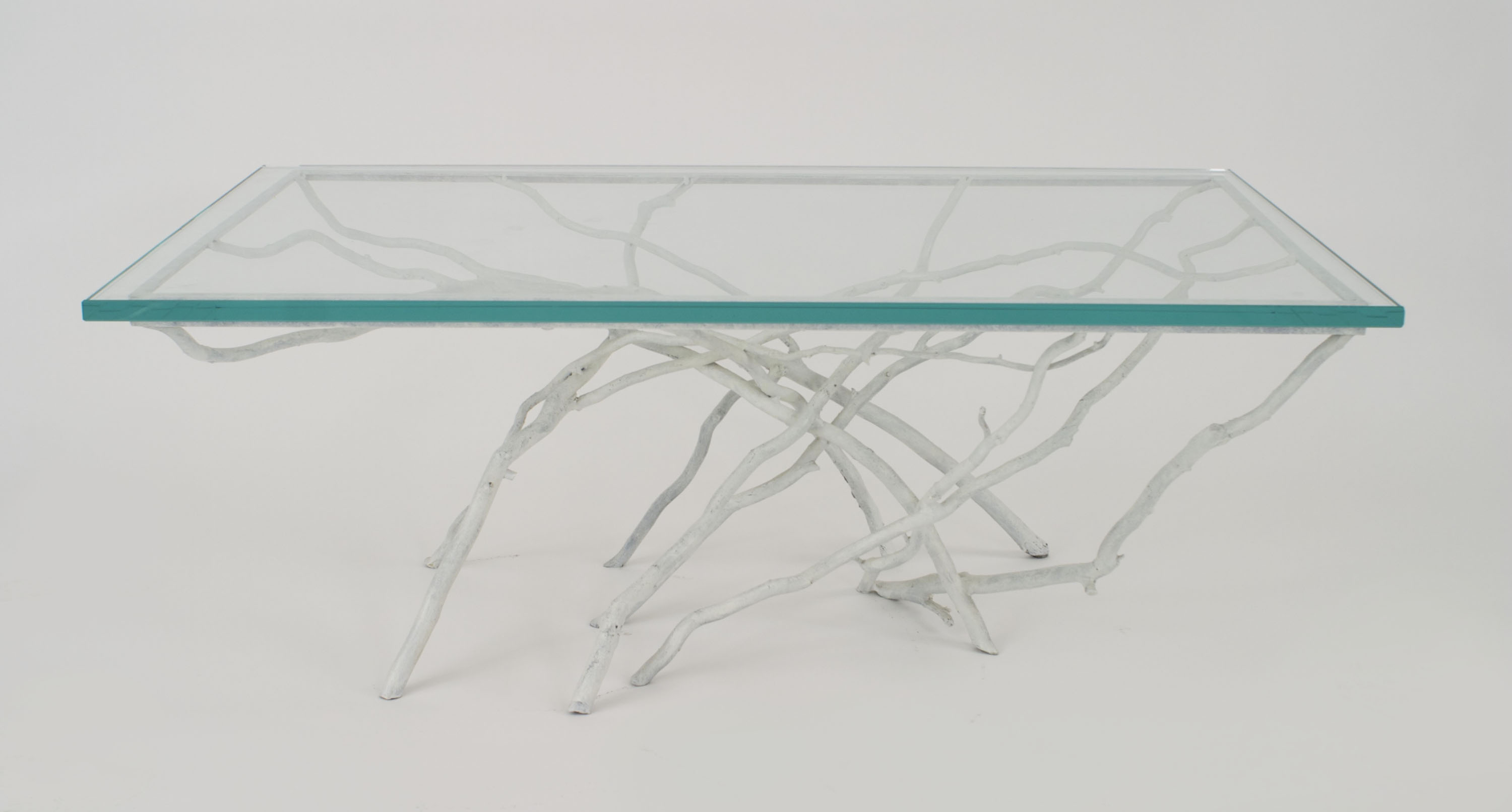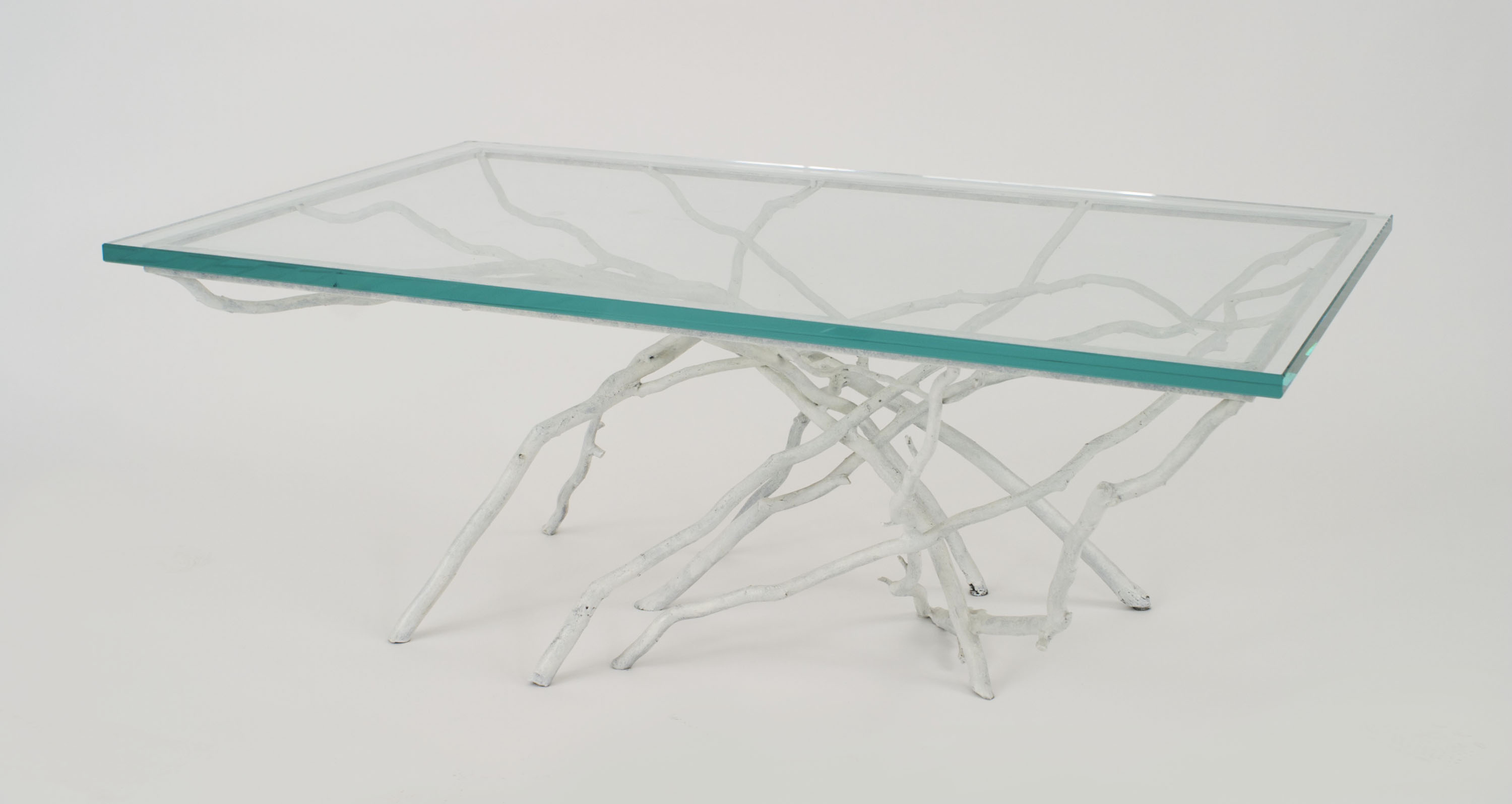 Contemporary Rustic style white painted iron faux twig design rectangular coffee table with 3/4" glass top (by JOAN SHERMAN-special commission)