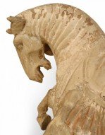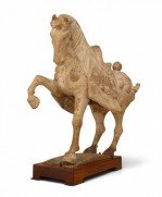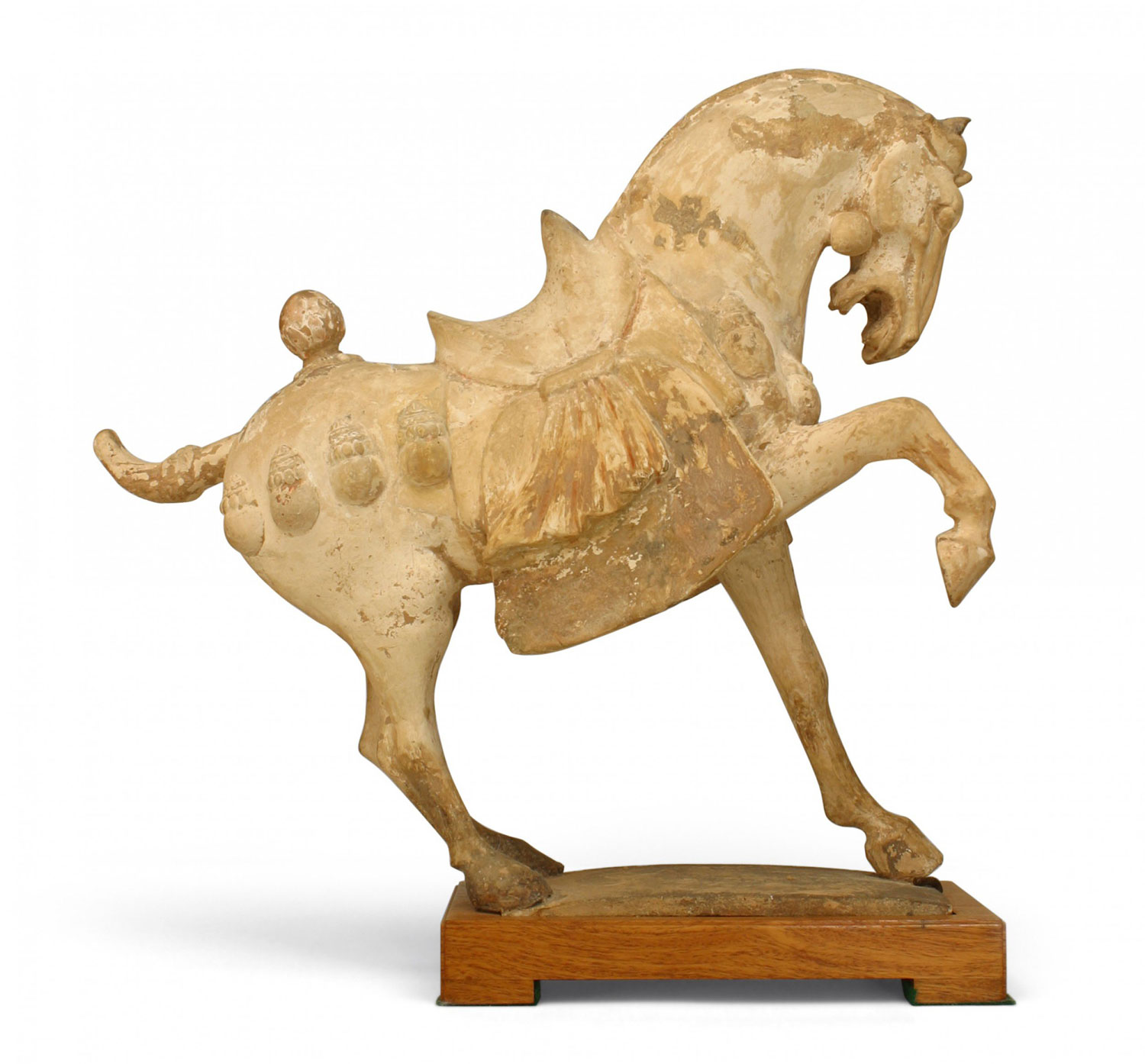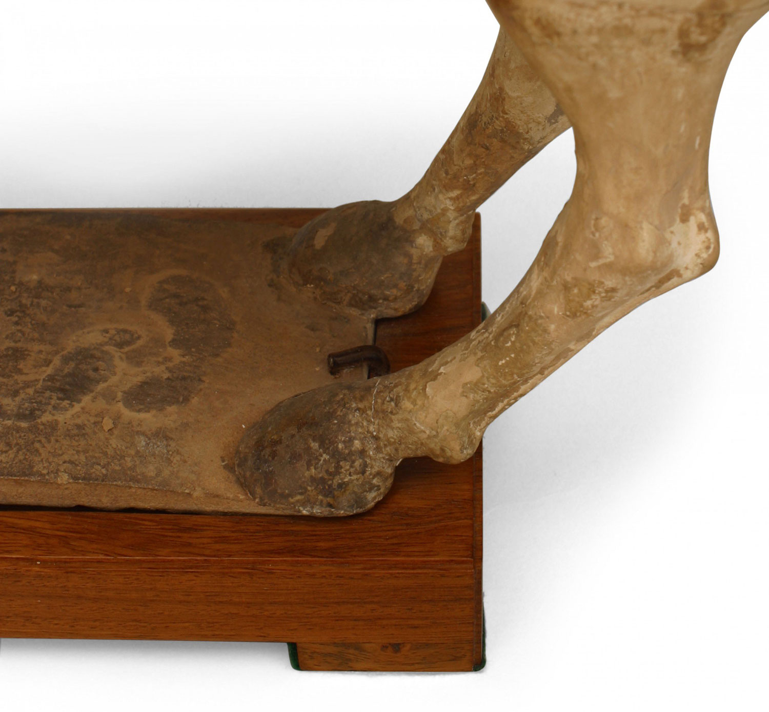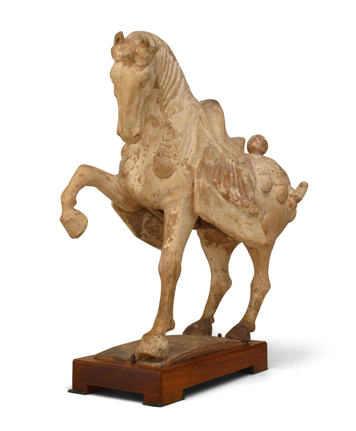Asian Chinese (Tang Dynasty) unglazed clay (pottery) prancing horse with a saddle on a rectangular base (traces of original paint).