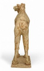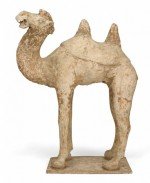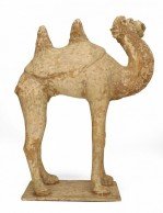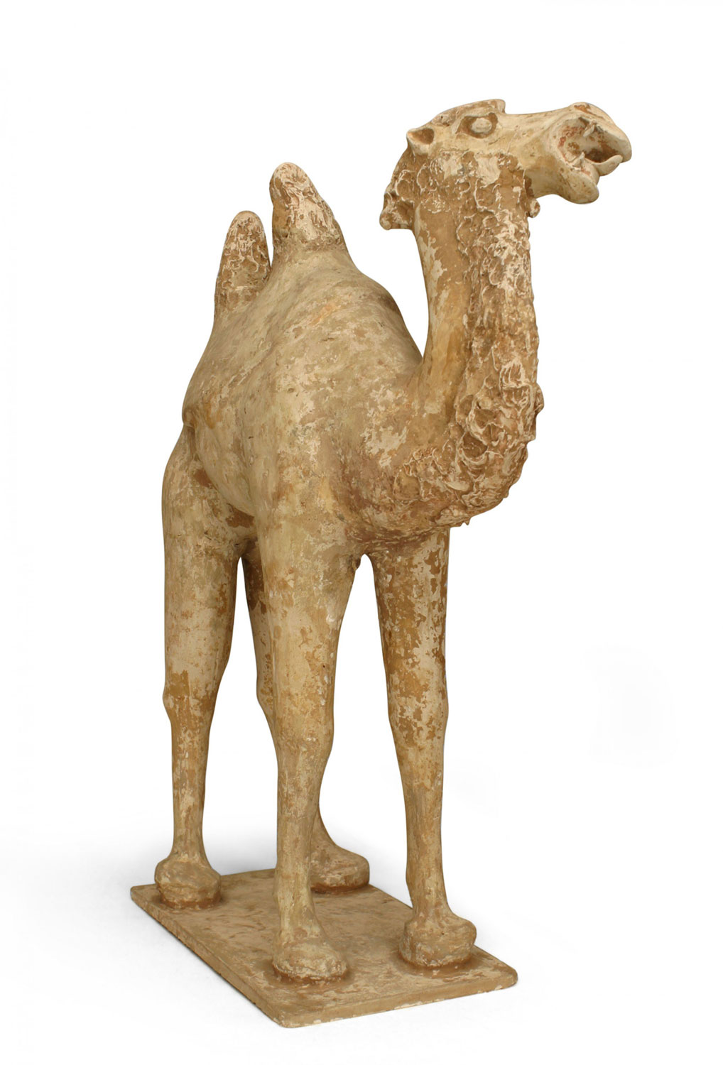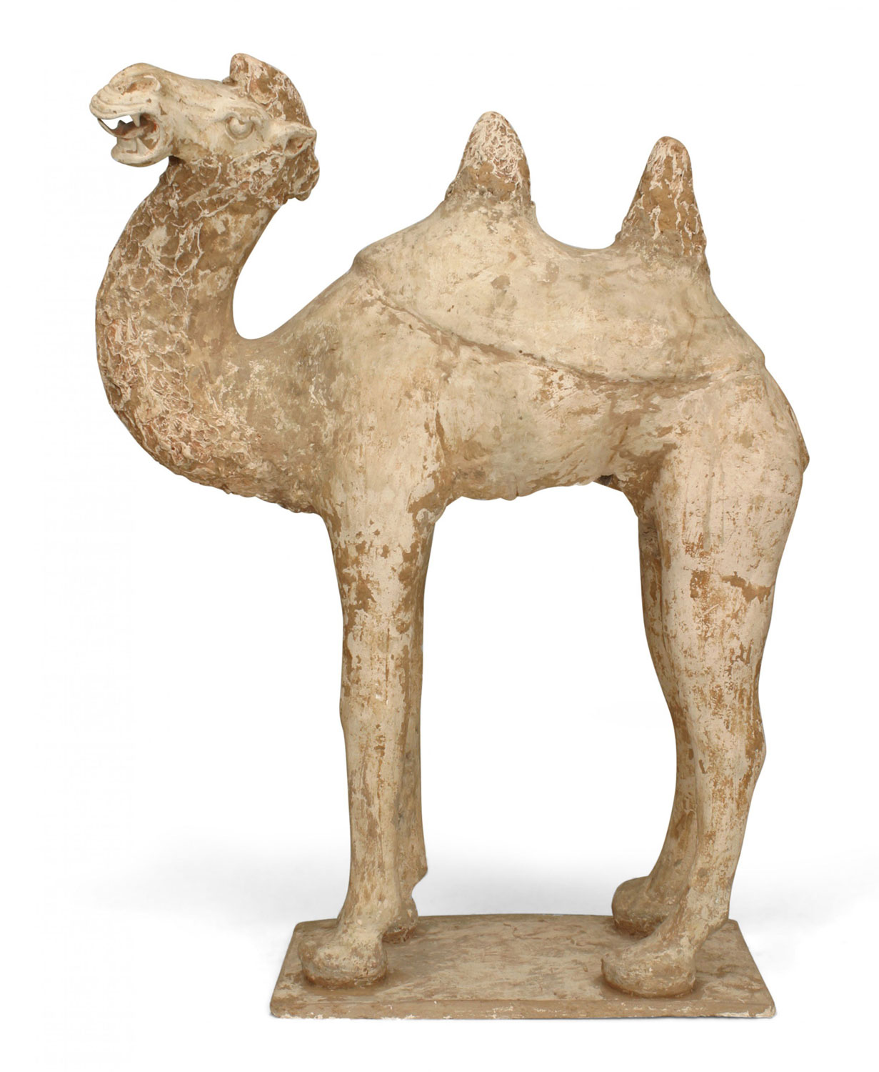 Asian Chinese (Tang Dynasty) unglazed pottery camel with an open mouth and head turned with a double hump back..