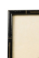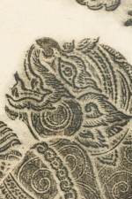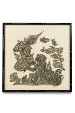 Thai Charcoal Rubbing of a scene with 2 religious Siamese figures in a black and gilt trim faux bamboo frame (similar item: NWL7052)