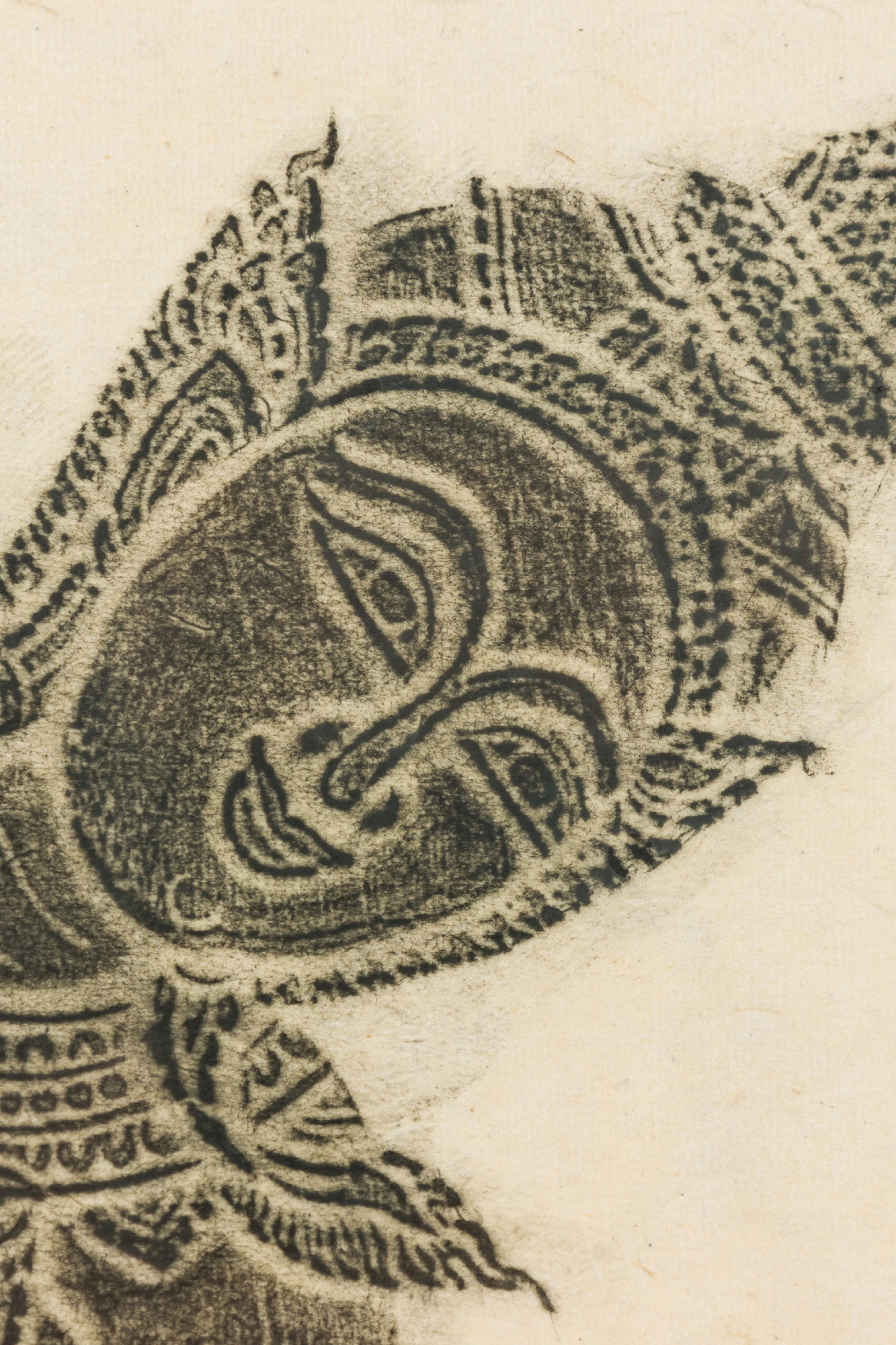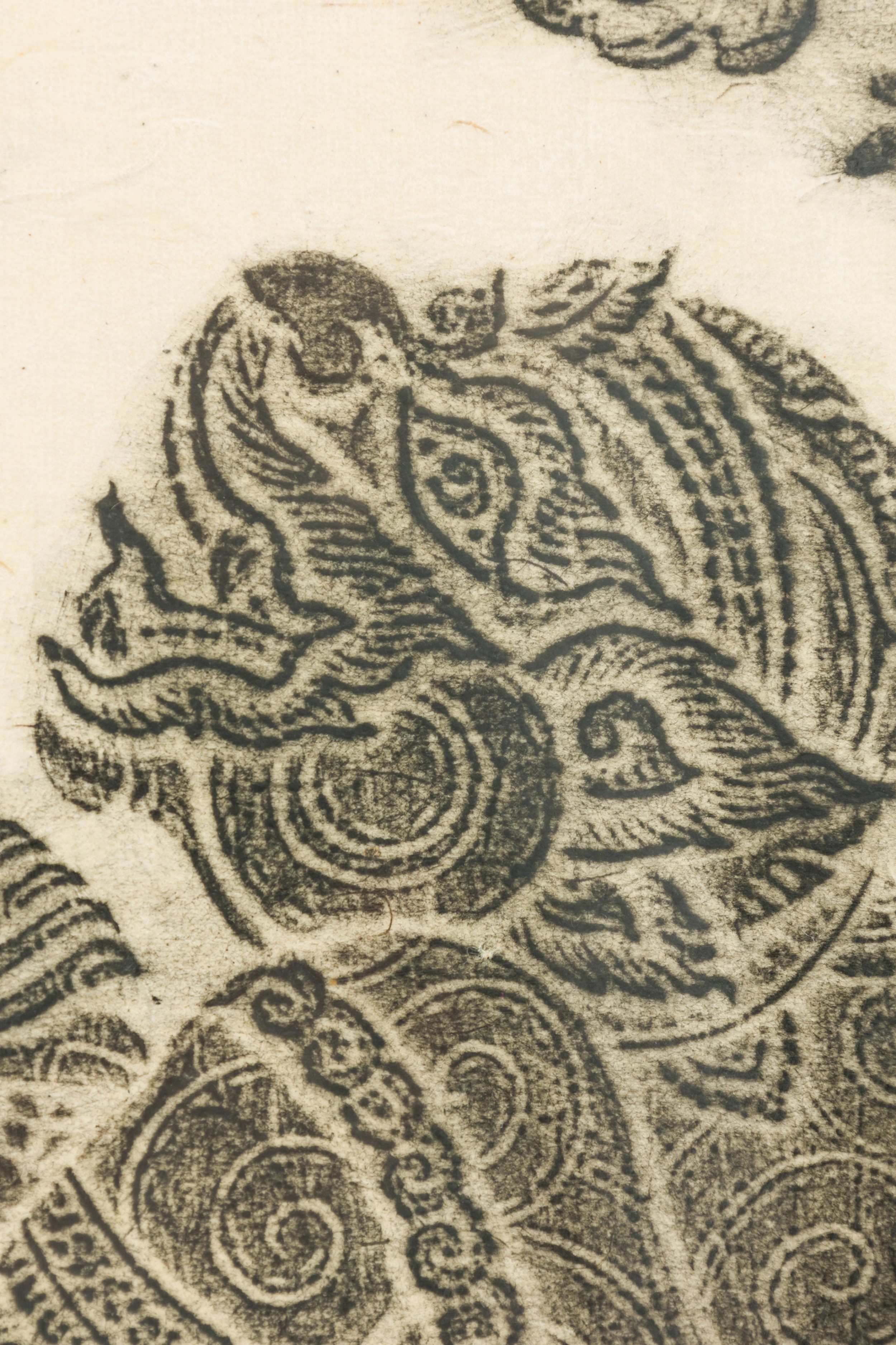 Thai Charcoal Rubbing of a scene with 2 religious Siamese figures in a black and gilt trim faux bamboo frame (similar item: NWL7052).