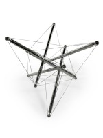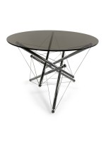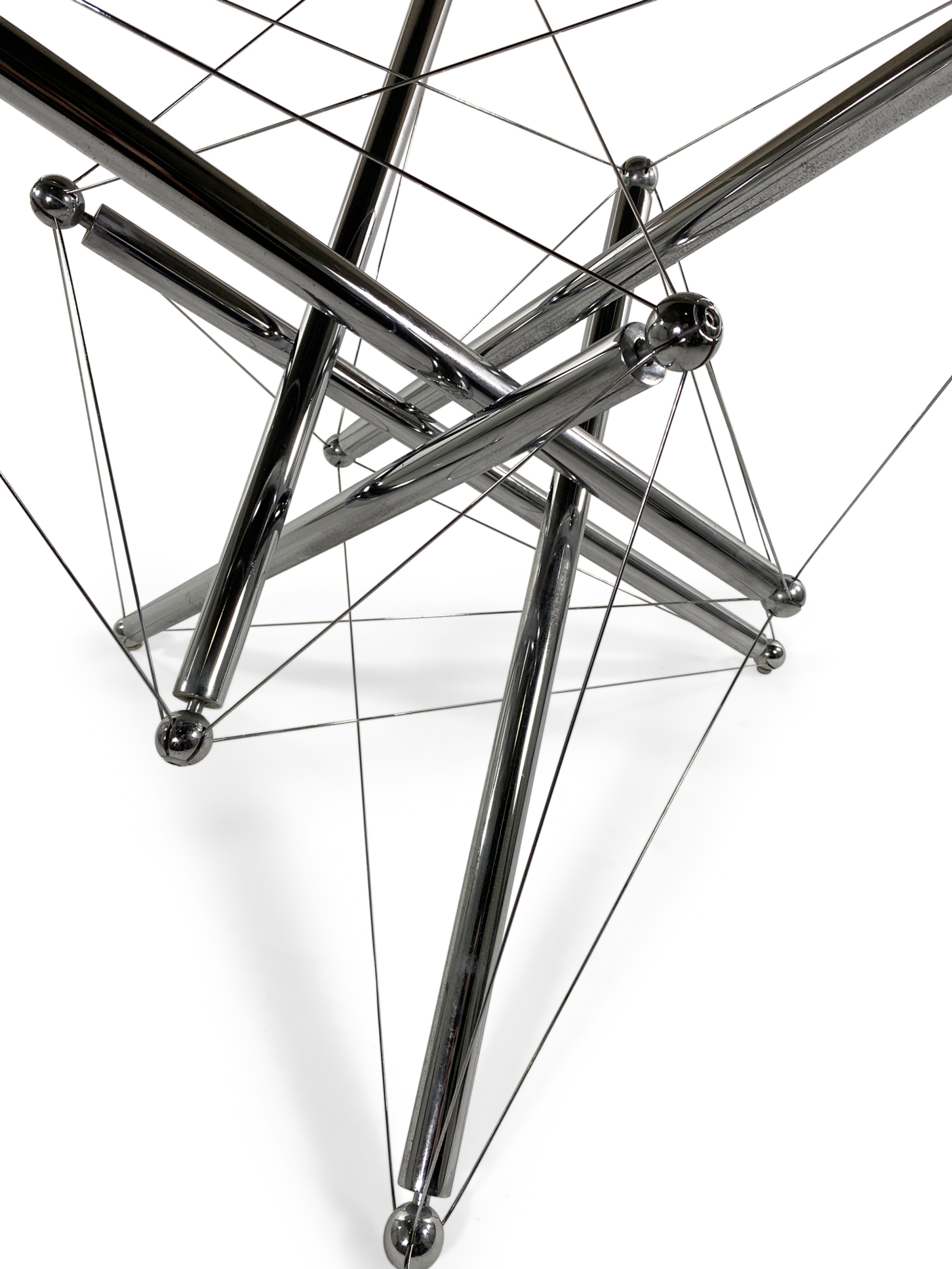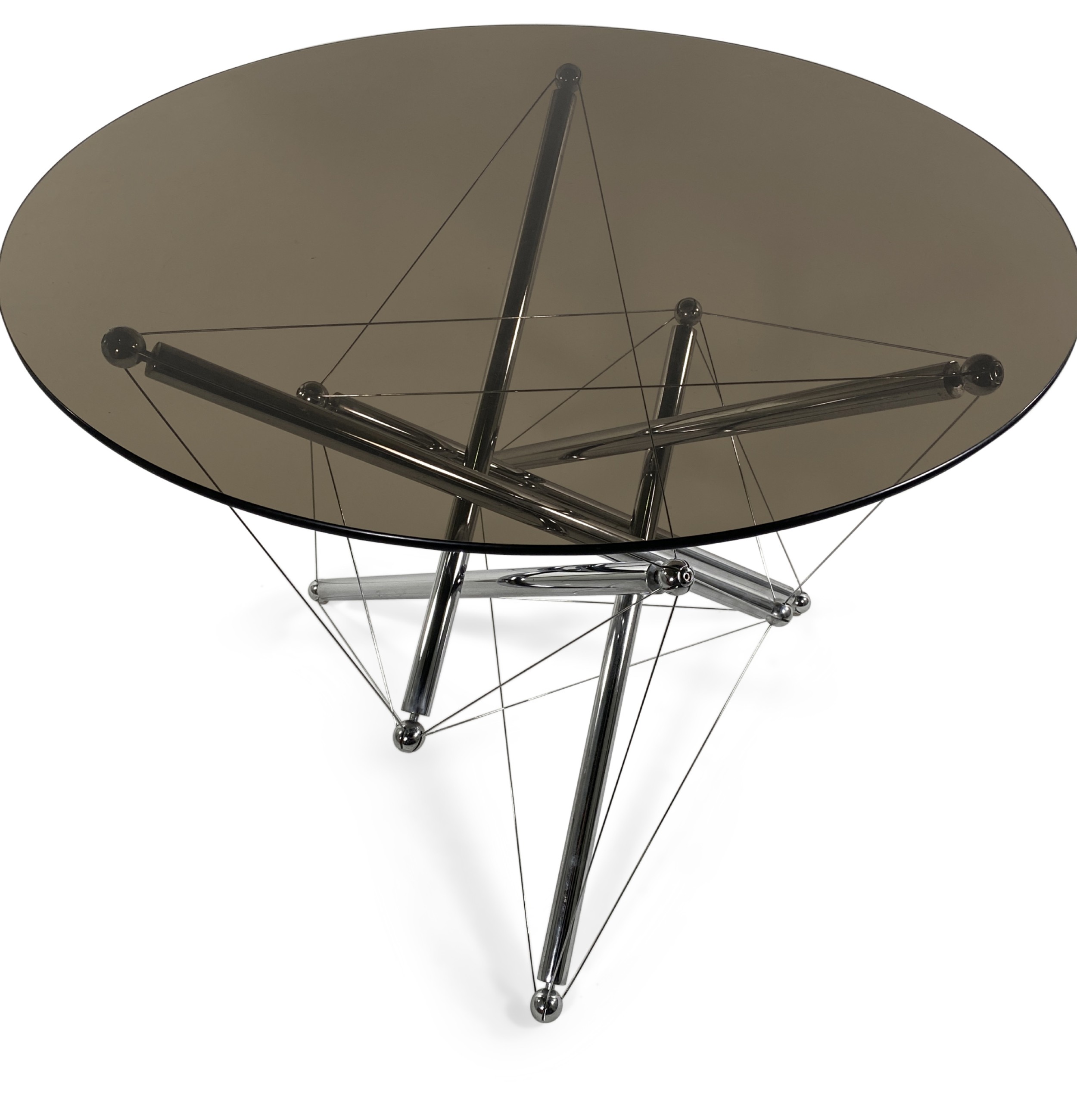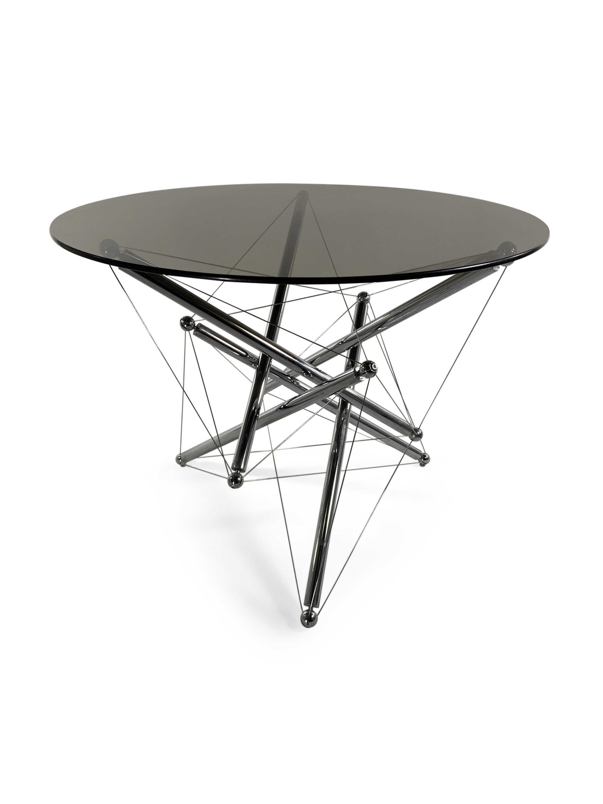 American Mid-Century Modern (1970s) "Tension" sculptural dining / center table, the base of which is constructed with chrome tubing supported by steel tension cables reminiscent of molecular structures, supporting a circular smoked glass top. (THEODORE WADDELL FOR CASSINA)