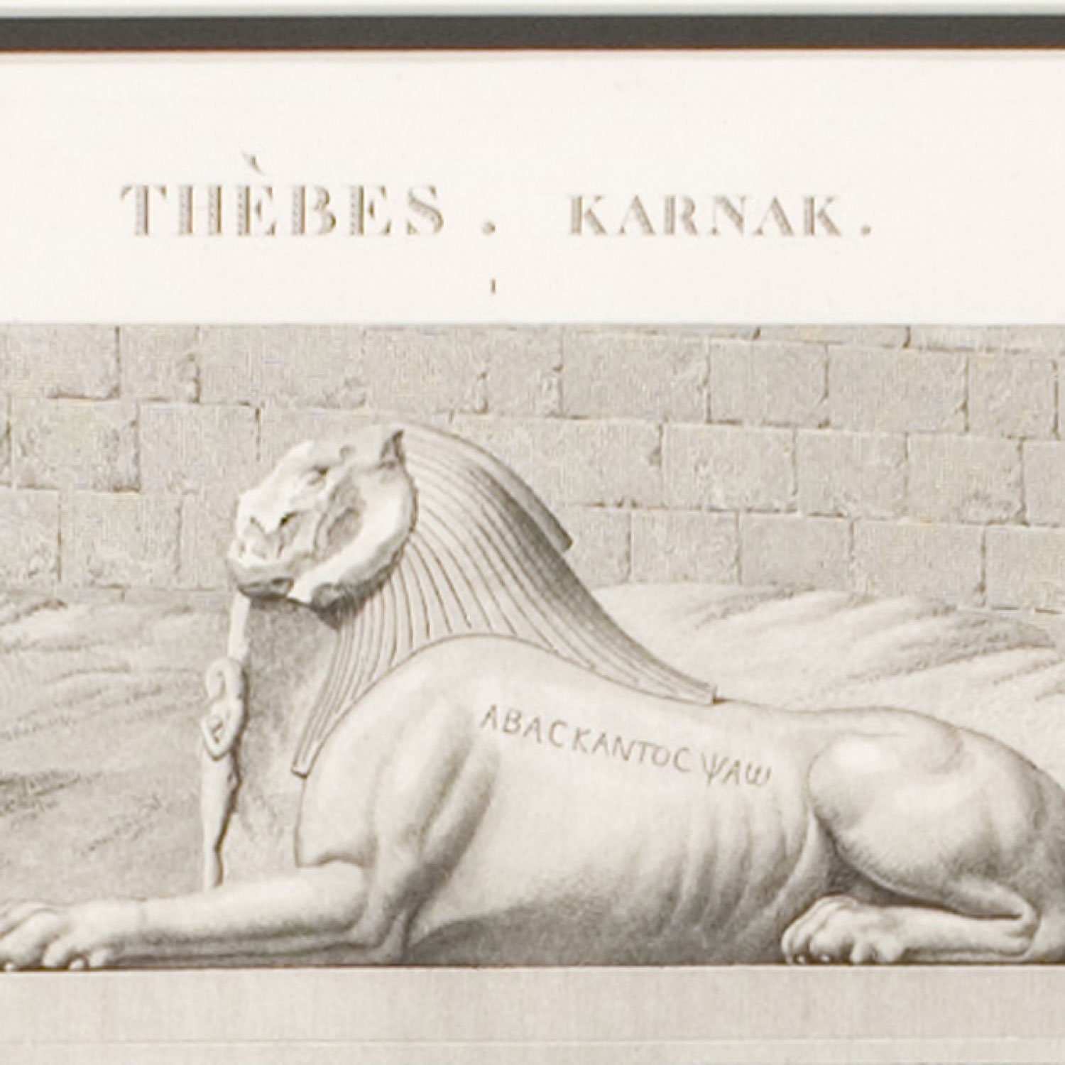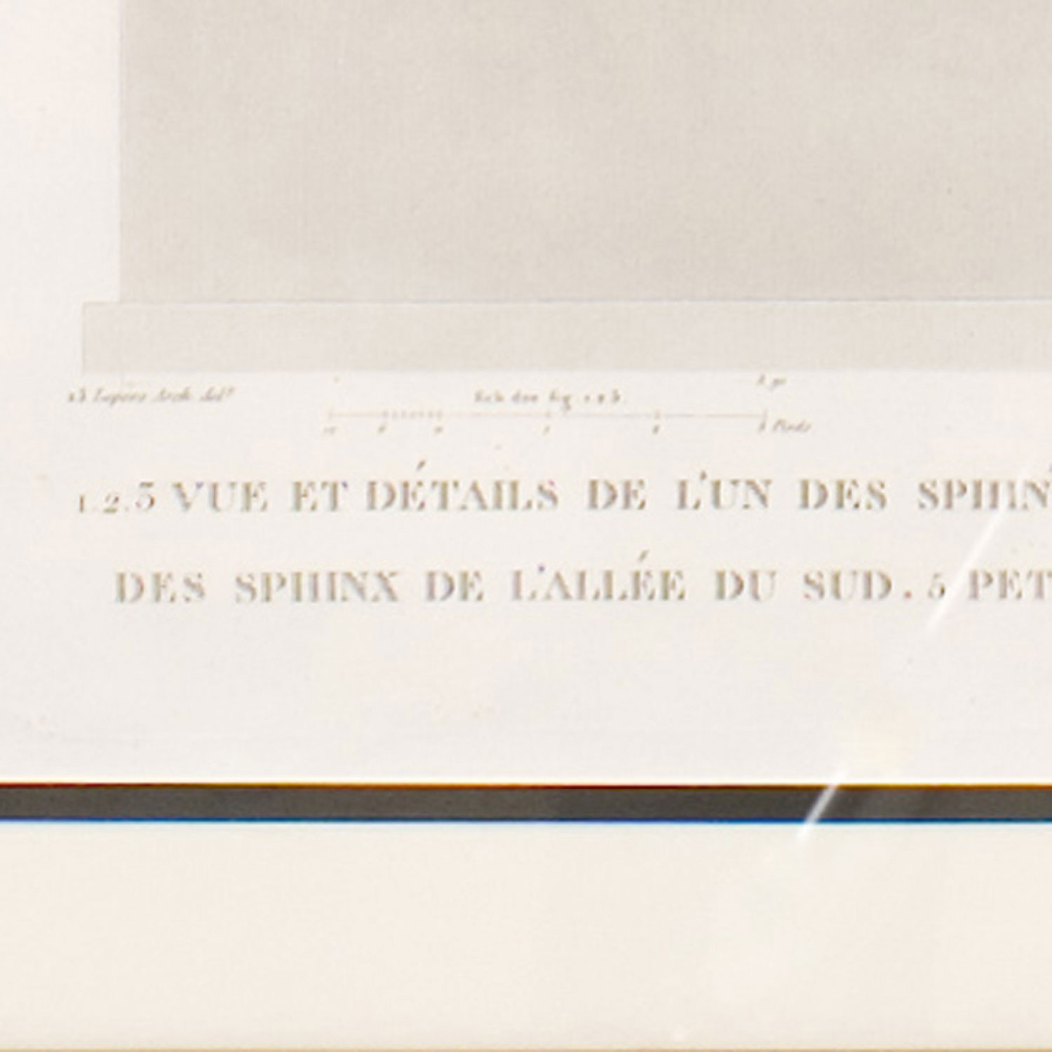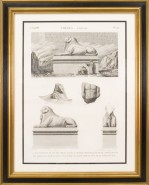 19th Cent print of various views of an Egyptian sphinx "Theves, Karach" in an ebonized and gilt frame.