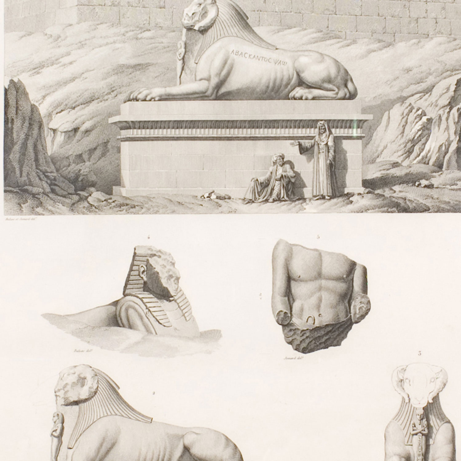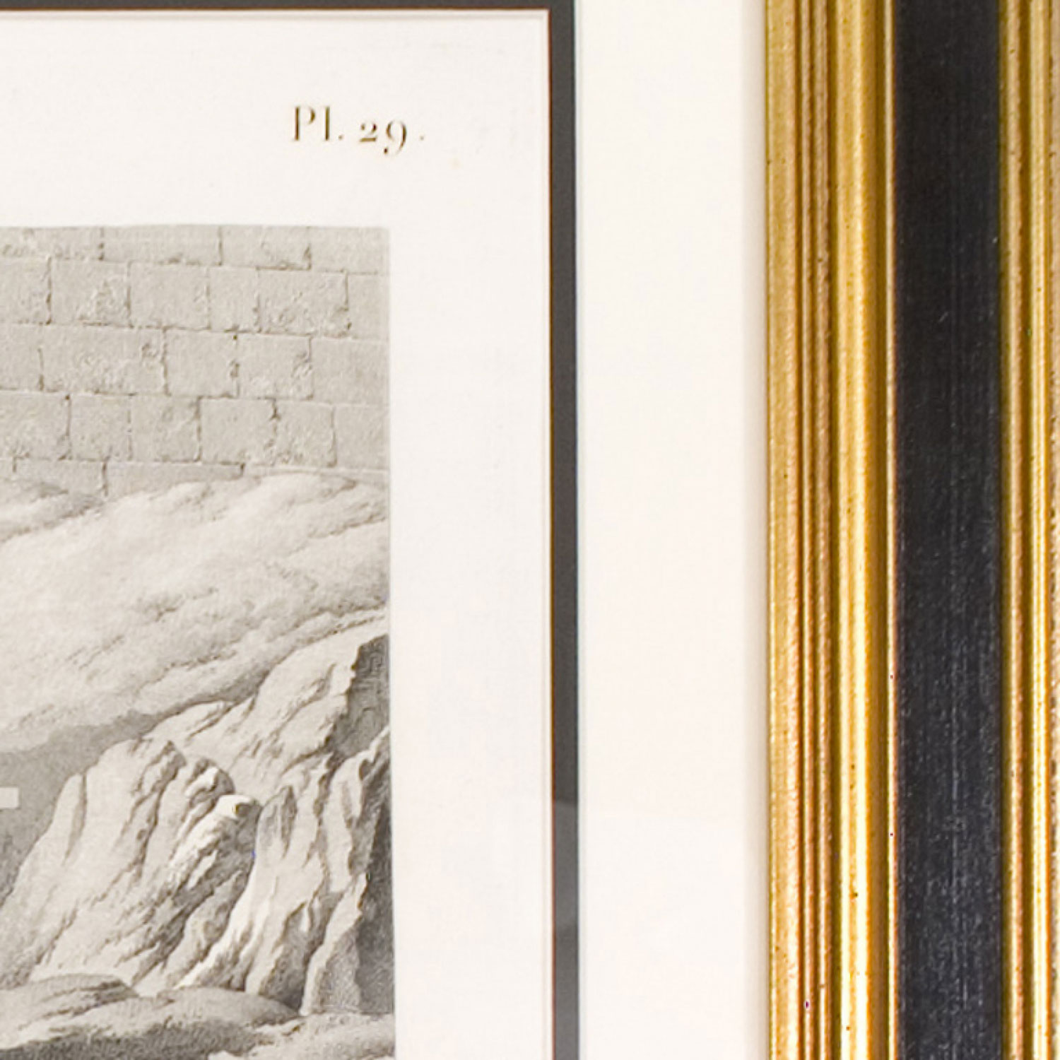 19th Cent print of various views of an Egyptian sphinx "Theves, Karach" in an ebonized and gilt frame