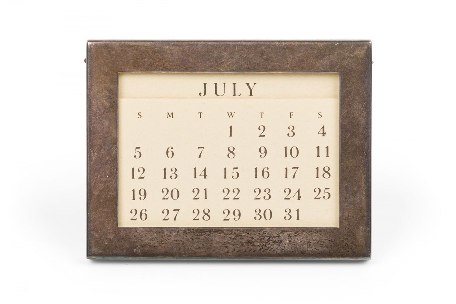 Mid-Century Modern rectangular sterling silver desk calendar with paper month inset. (TIFFANY & CO, Hallmarks on side)..