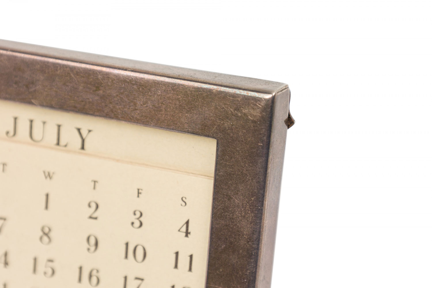 Mid-Century Modern rectangular sterling silver desk calendar with paper month inset. (TIFFANY & CO, Hallmarks on side).